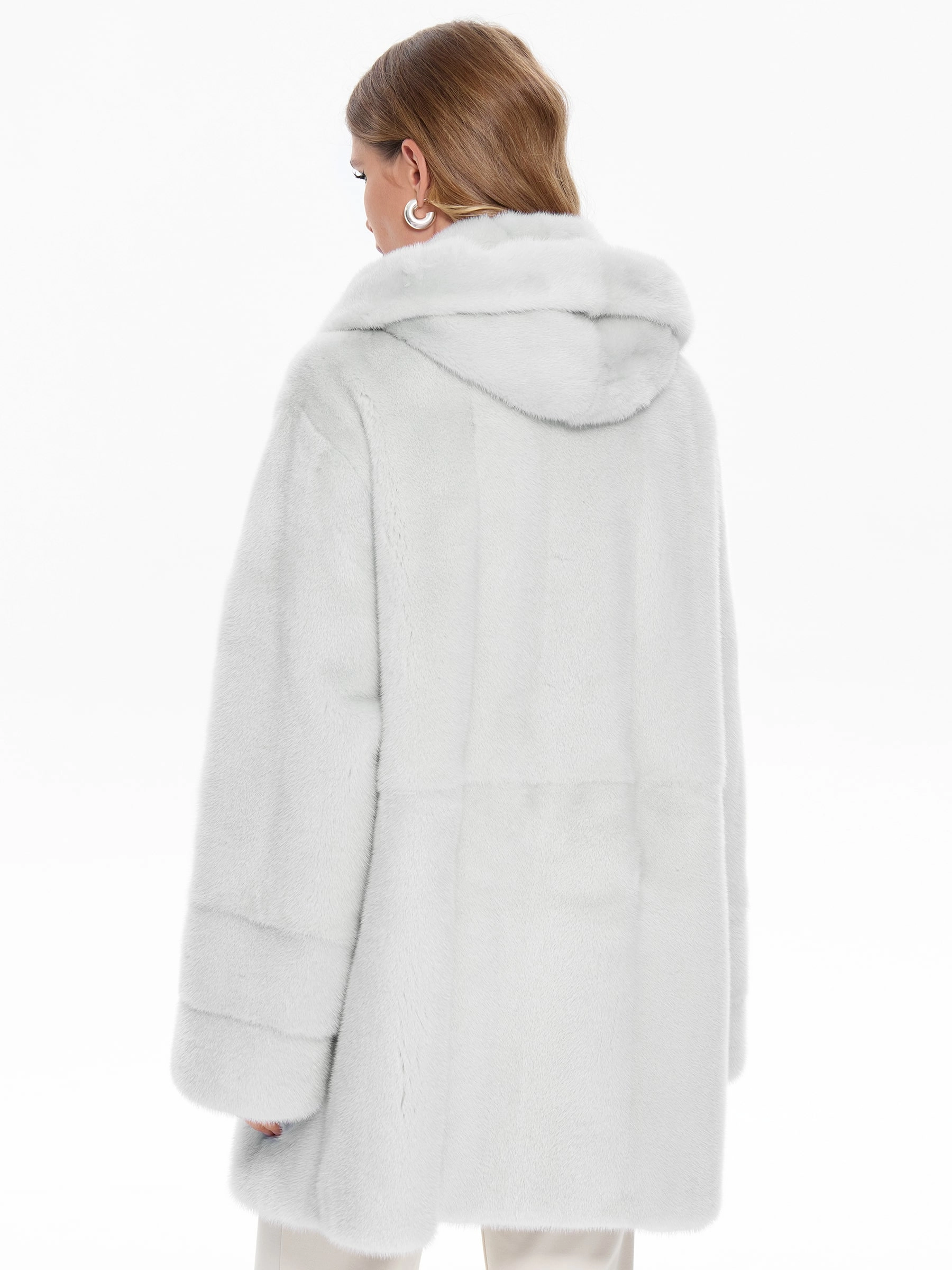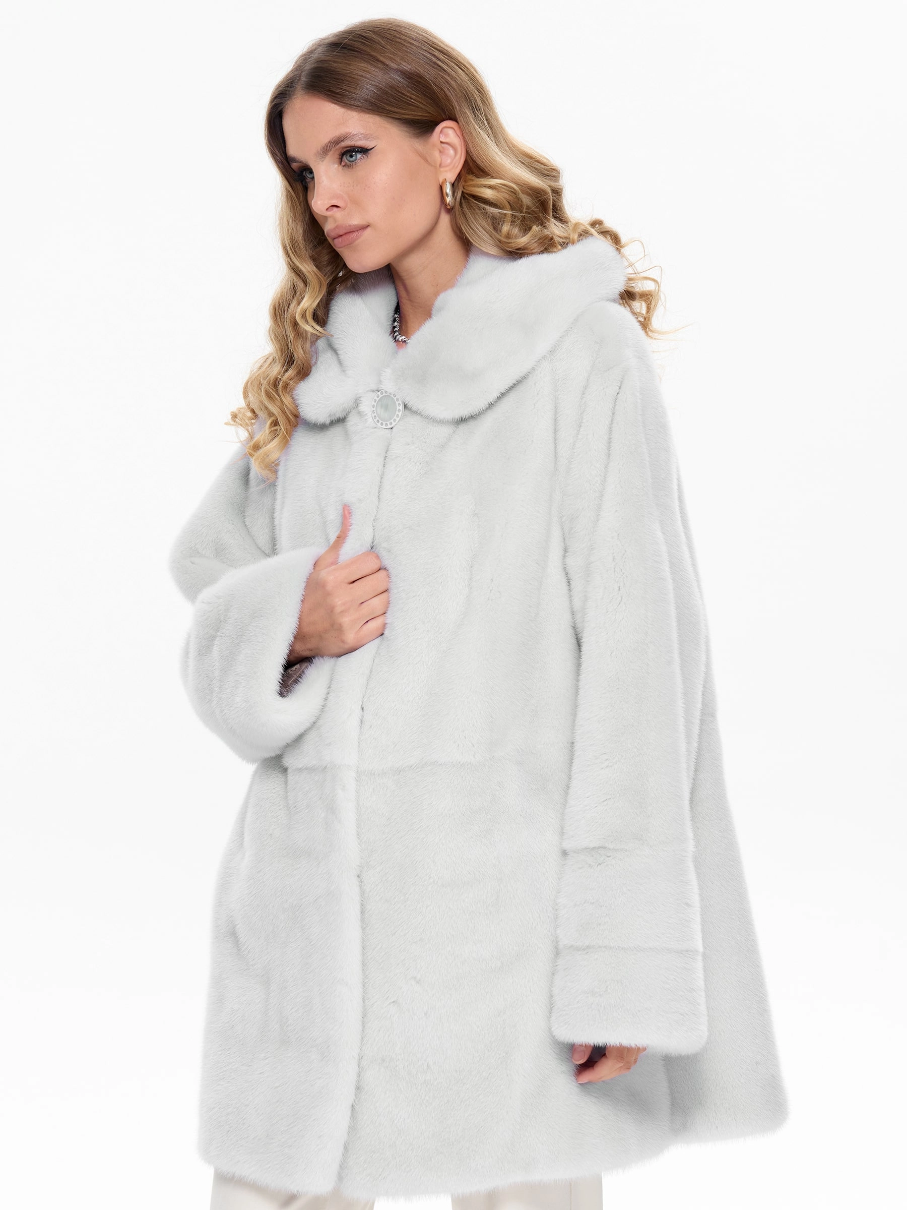 Короткая белоснежная шуба с объемным капюшоном и спущенной линией плеча выполнена из густого нежного меха норки премиум-класса, который дарит непревзойденное тепло и тактильный комфорт в холодные зимние дни. Свободная модель длиной 73 сантиметра создает актуальный расслабленный силуэт, позволяя чувствовать себя уютно и стильно в любой ситуации. Два практичных врезных боковых кармана согревают руки и добавляют функциональности, сохраняя при этом чистоту линий изделия. Надежная застежка на металлические клипсы обеспечивает идеальную посадку, не повреждая нежный ворс меха, а качественная смесовая подкладка гарантирует комфорт при носке. Белоснежный оттенок норки придает шубе особую свежесть и благородство, делая ее главным акцентом любого зимнего образа. Совет стилиста: носите эту шубу с тотально-белым образом — вязаным платьем и высокими сапогами из мягкой кожи для создания нежного и женственного силуэта, либо добавьте контраст с черными узкими брюками, грубыми ботинками и объемным свитером для дерзкого городск