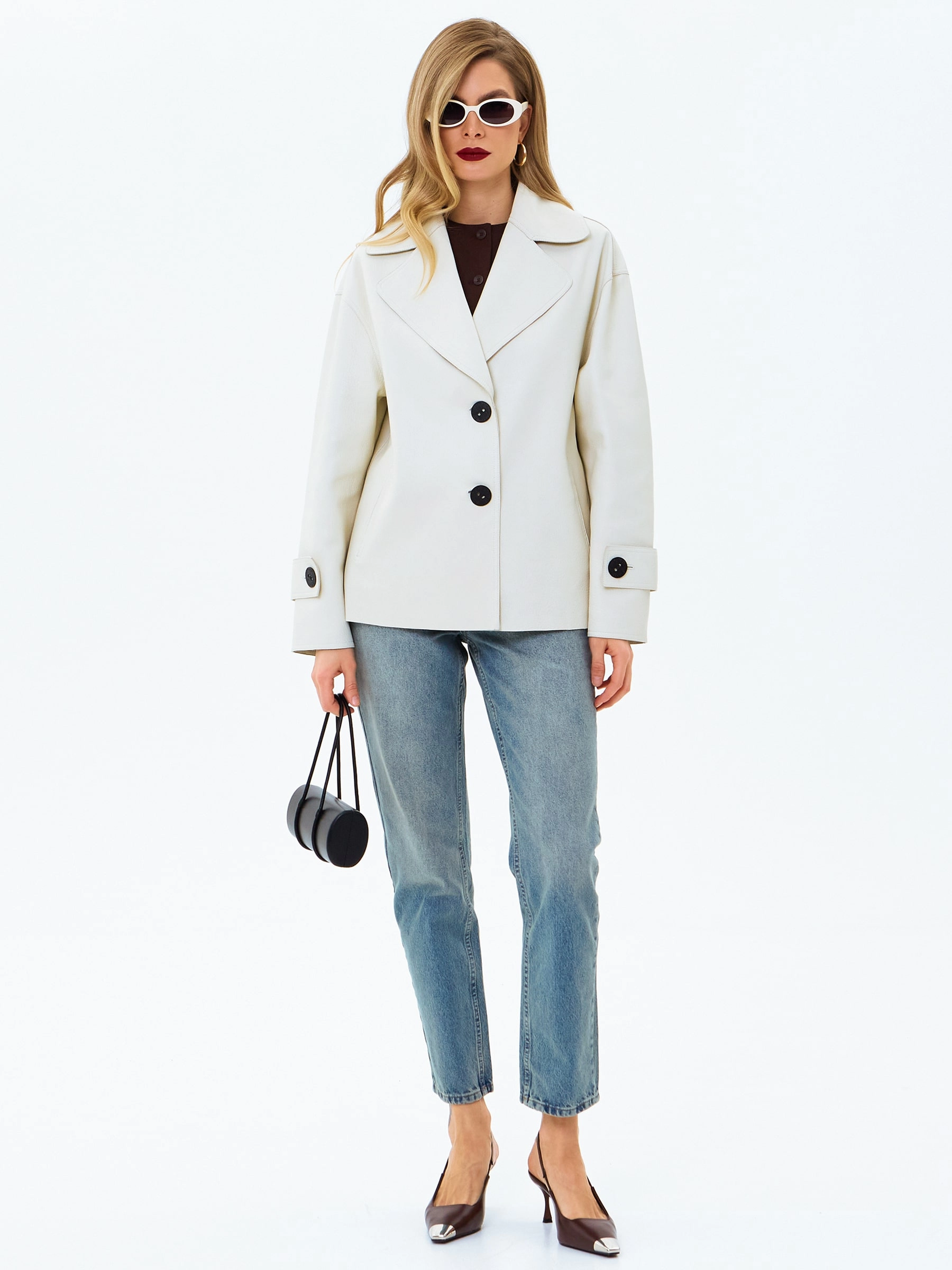 Кожаный пиджак с двумя боковыми карманами выполнили из мягкой гладкой кожи премиум класс.Модель прямого силуэта комфортно садится по фигуре, не сковывает движения,застегивается крупными пуговицами. Рукава изделия со спущенной линией плеча подчеркнули широкими патами.