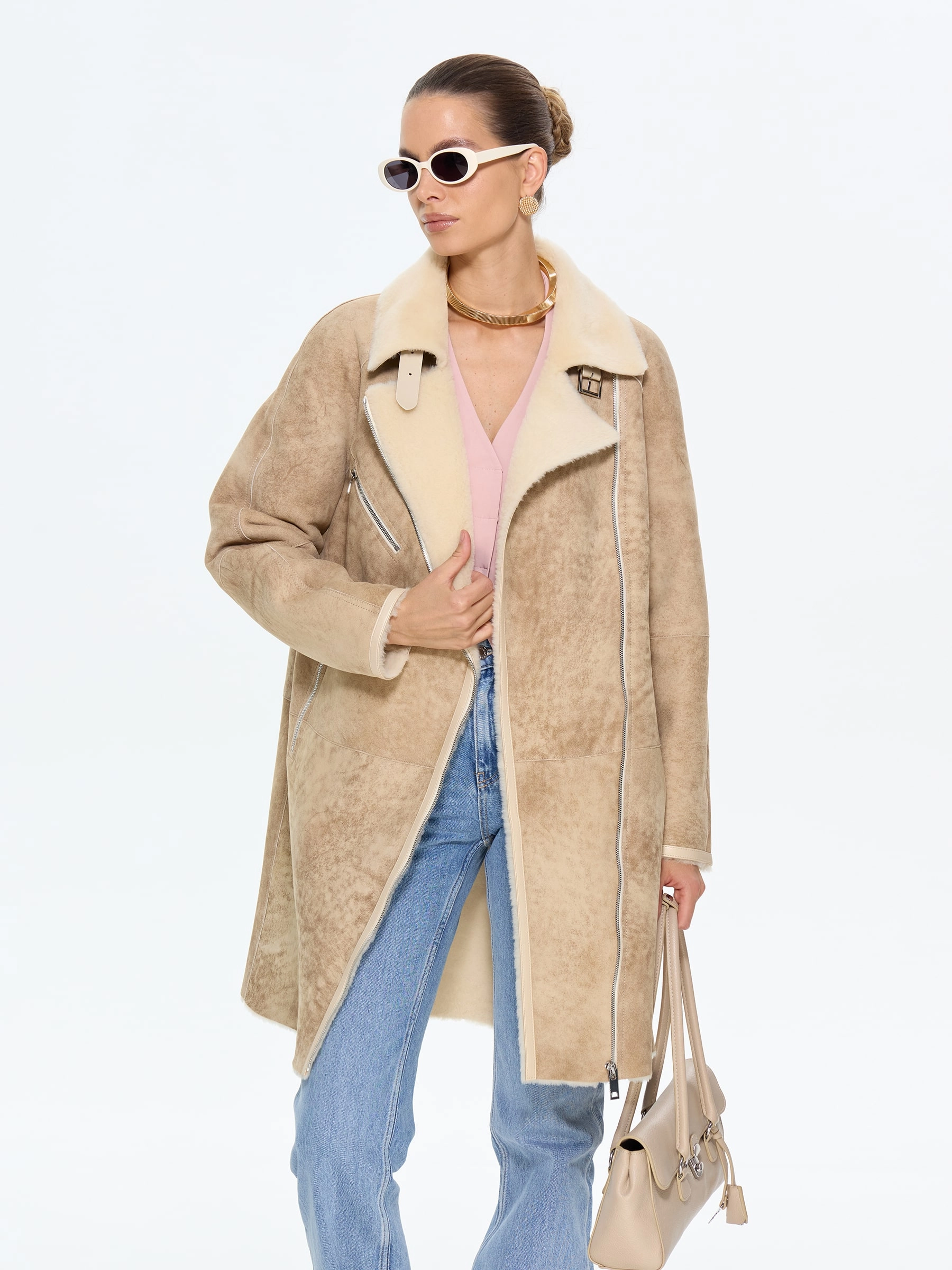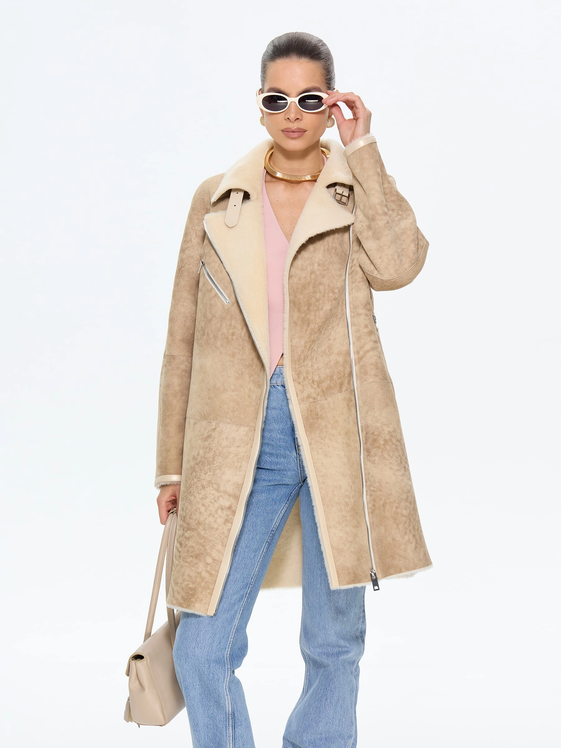 Стильная дублёнка-косуха свободного кроя без капюшона, изготовленная из натуральной овчины мерино премиум-класса в классическом бежевом оттенке. Модель длиной 90 см с рукавом реглан и английским воротником с широкими лацканами создаёт утончённый образ в стиле удлинённой косухи. Стилисты рекомендуют носить эту дублёнку с кожаными ботинками и джинсами для повседневного образа или с вязаным платьем и сапогами-челси для завершённого лука. Дополнительная застёжка-ремень с изящной пряжкой под воротником подчёркивает внимание к деталям, делая эту модель идеальным сочетанием классического шарма и современной эстетики для истинных ценительниц качественной верхней одежды.