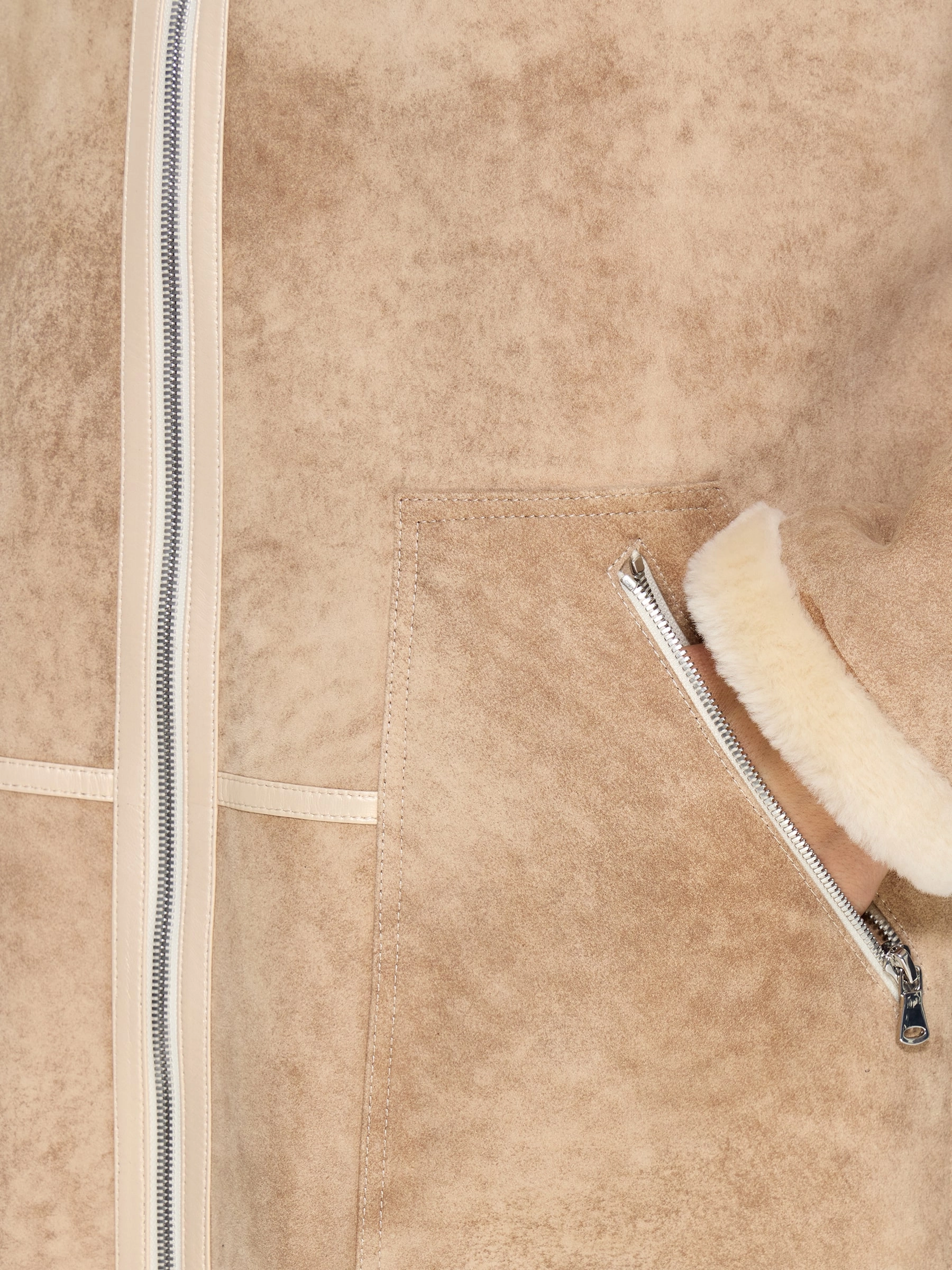 Стильная дублёнка свободного кроя с капюшоном из натуральной овчины мерино премиум-класса в бежевой цветовой гамме. Модель длиной 105 см со спущенной линией плеча и глубоким капюшоном с меховой опушкой создаёт уютный и стильный образ — само изделие и стильные врезные карманы застёгиваются на удобные молнии. Стилисты рекомендуют носить эту дублёнку с кожаными ботинками и джинсами-скинни для повседневного образа или с вязаным платьем и уггами для завершённого зимнего лука. Изящные кожаные канты и меховая отделка подчёркивают внимание к деталям, делая эту модель идеальным сочетанием практичности и утончённого шарма для современных женщин, ценящих комфорт и элегантность.