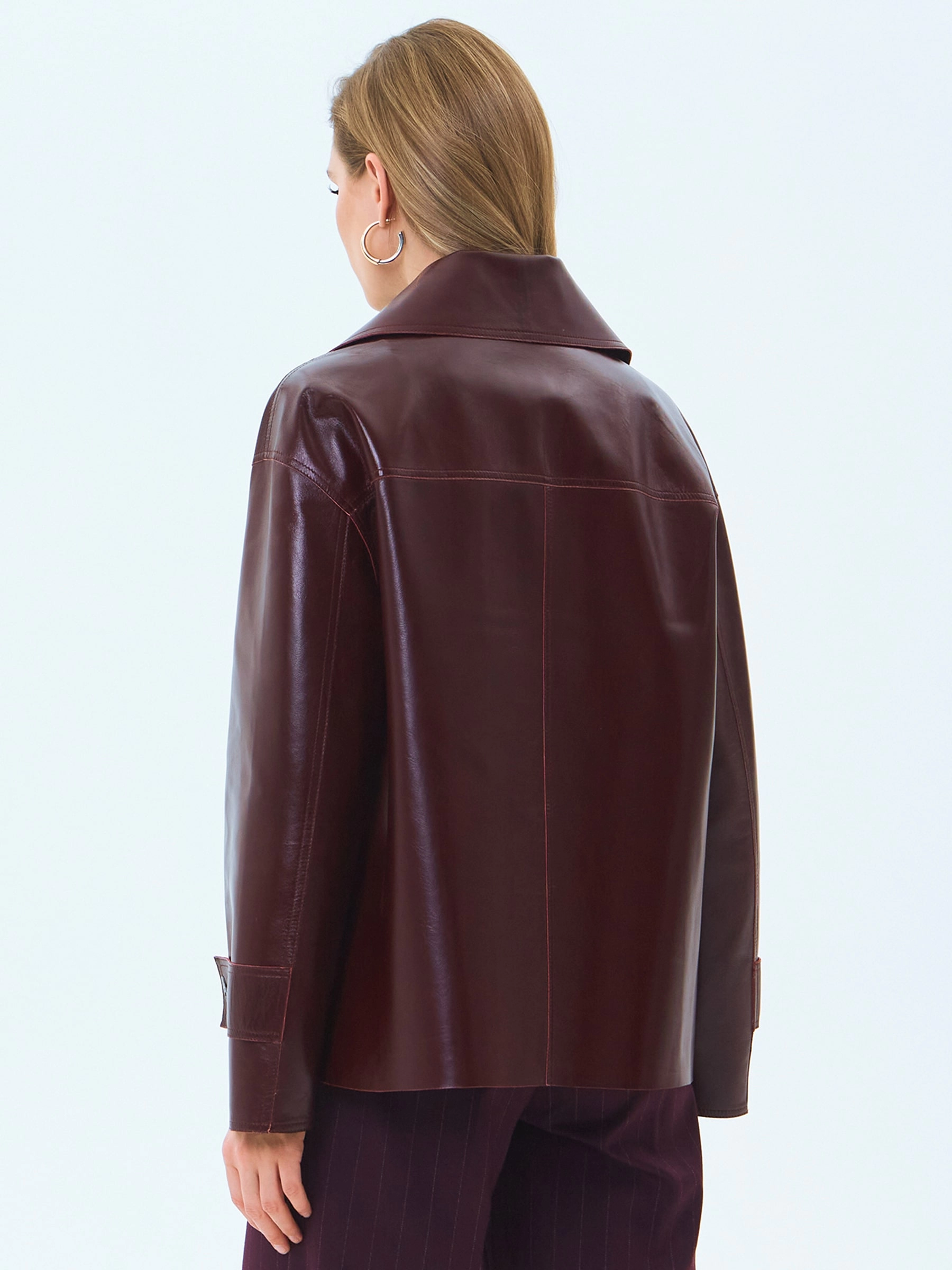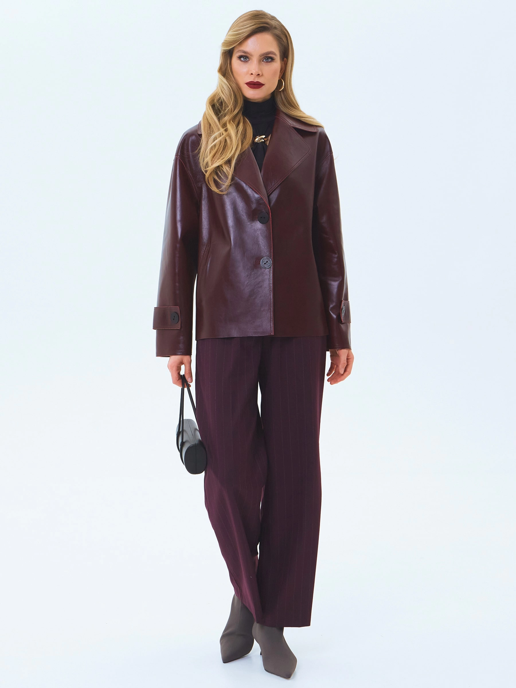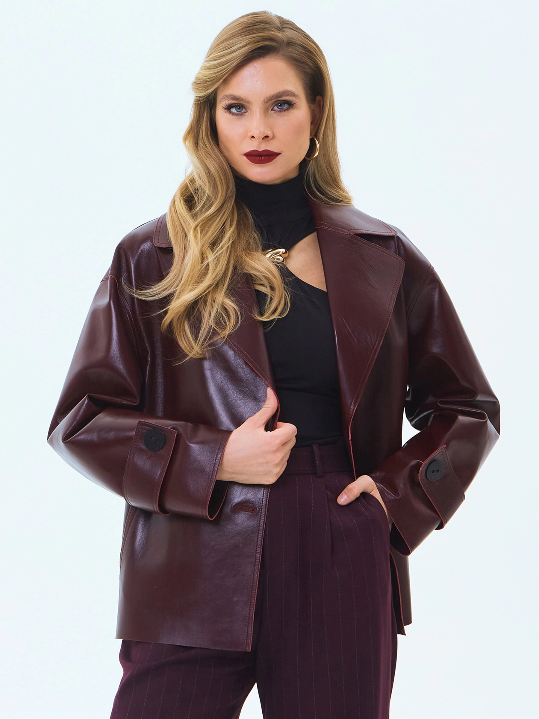 Товар бордовый кожаный женский пиджак премиум класса 3097, размер 48, артикул 24310 выполнен из натуральной кожи с застежкой пуговицы. Рассчитан на сезон: весна-осень. Длина изделия 66 см, силуэт прямой.