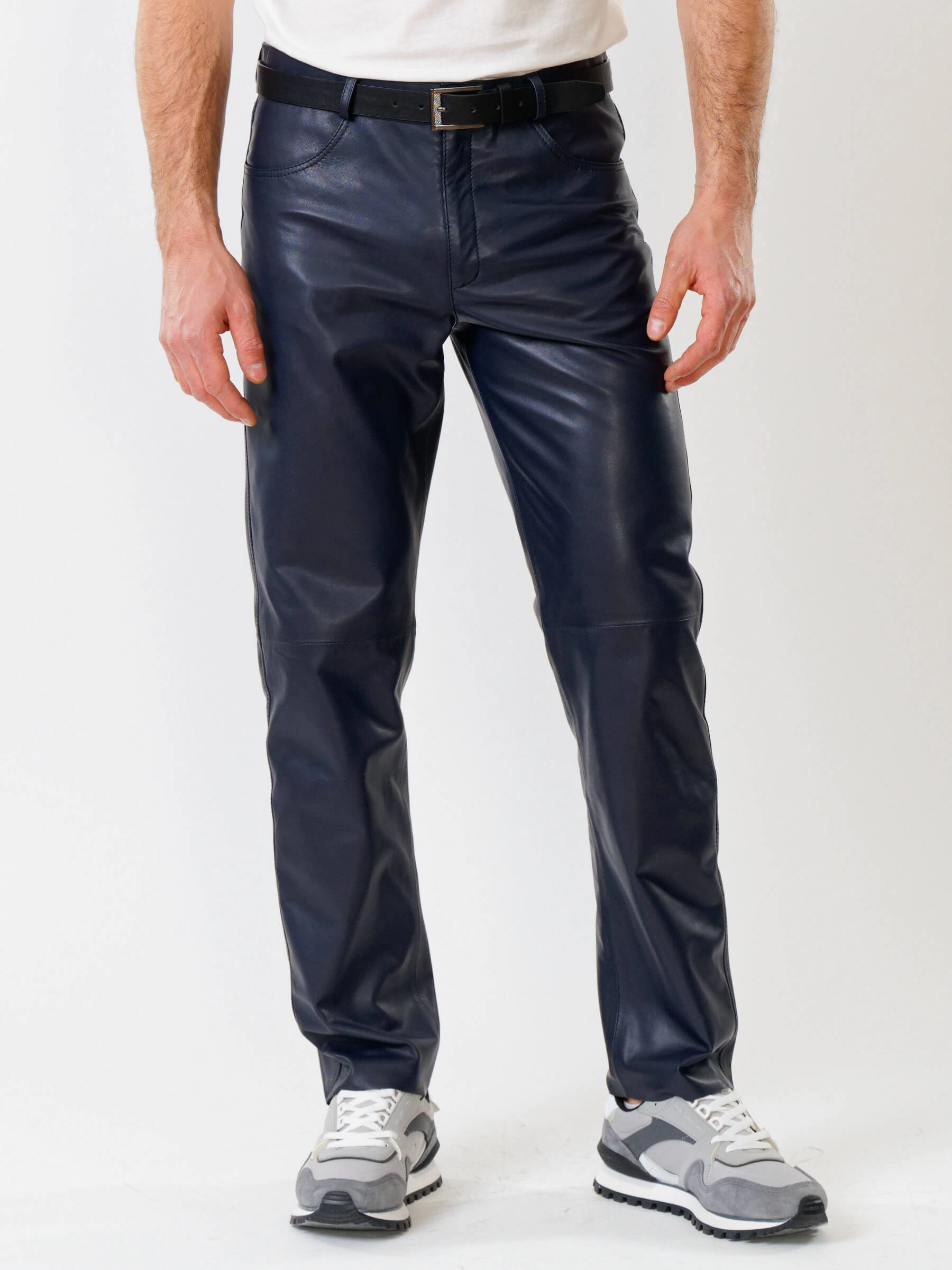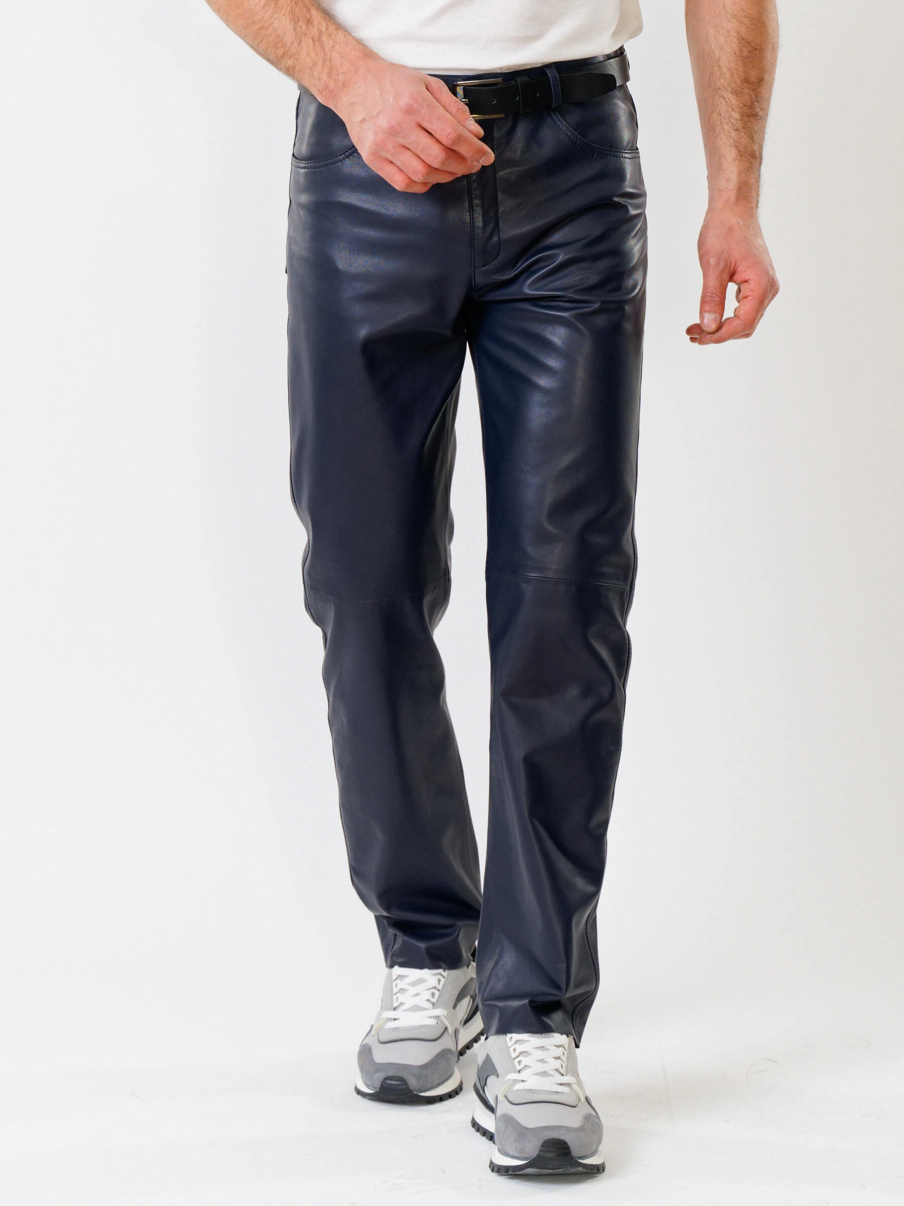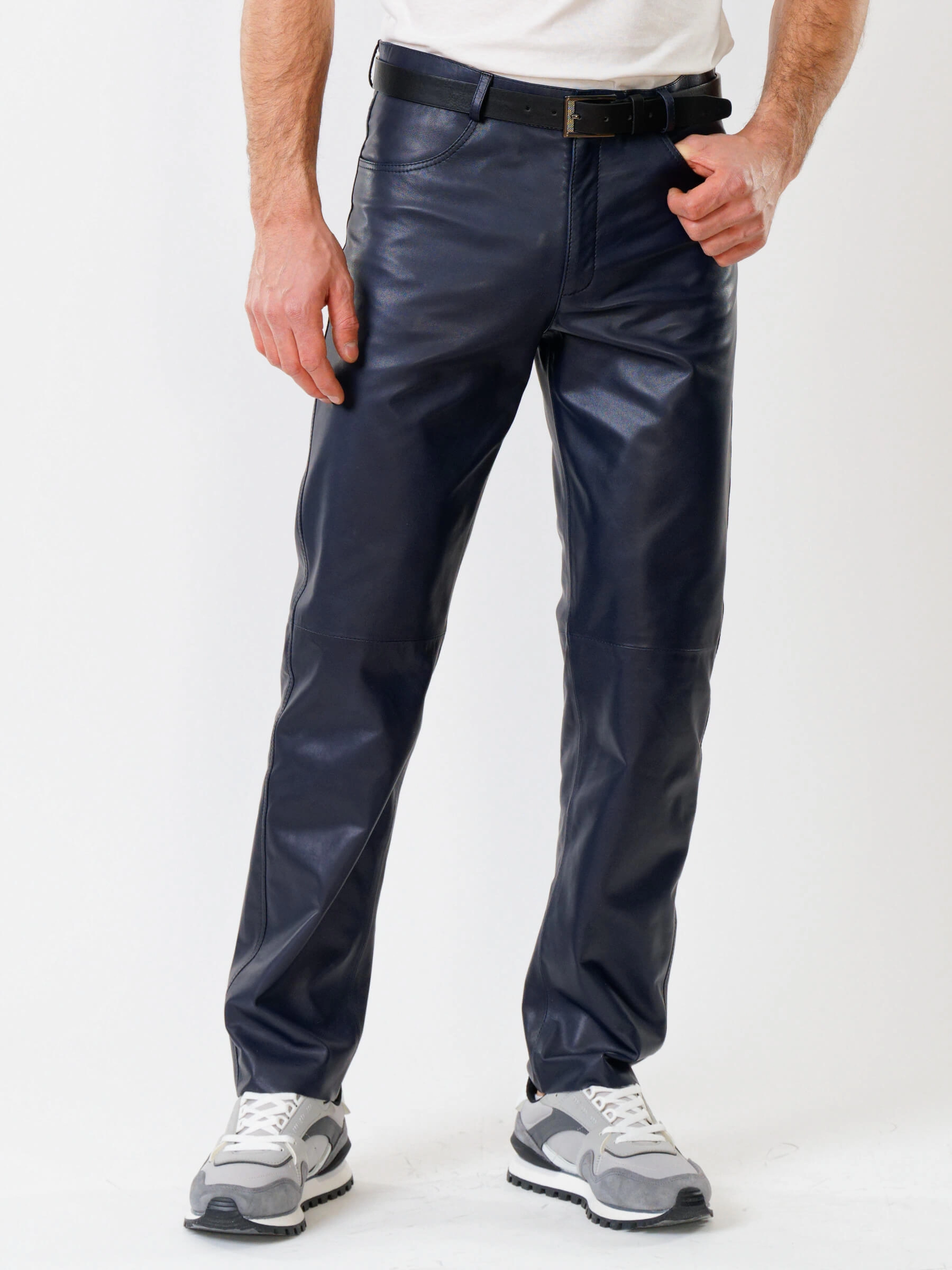 Товар мужские брюки из натуральной кожи премиум класса 01, синие, размер 48, артикул 120010 выполнен из натуральной кожи с застежкой молния. Рассчитан на сезон: демисезон. Длина изделия 103 см, силуэт прямой.