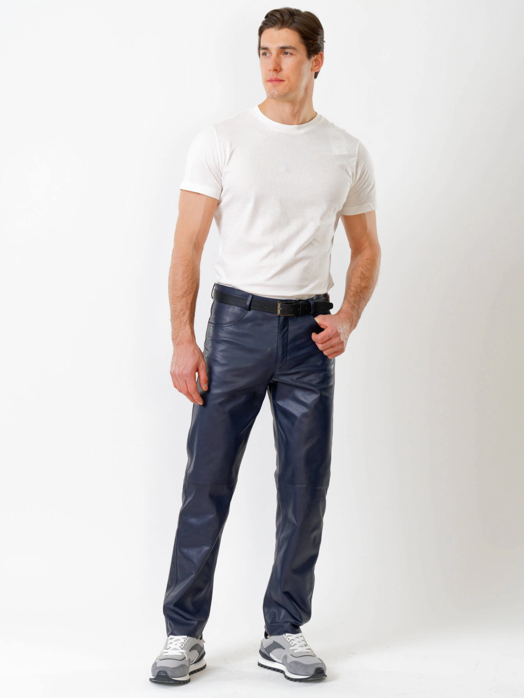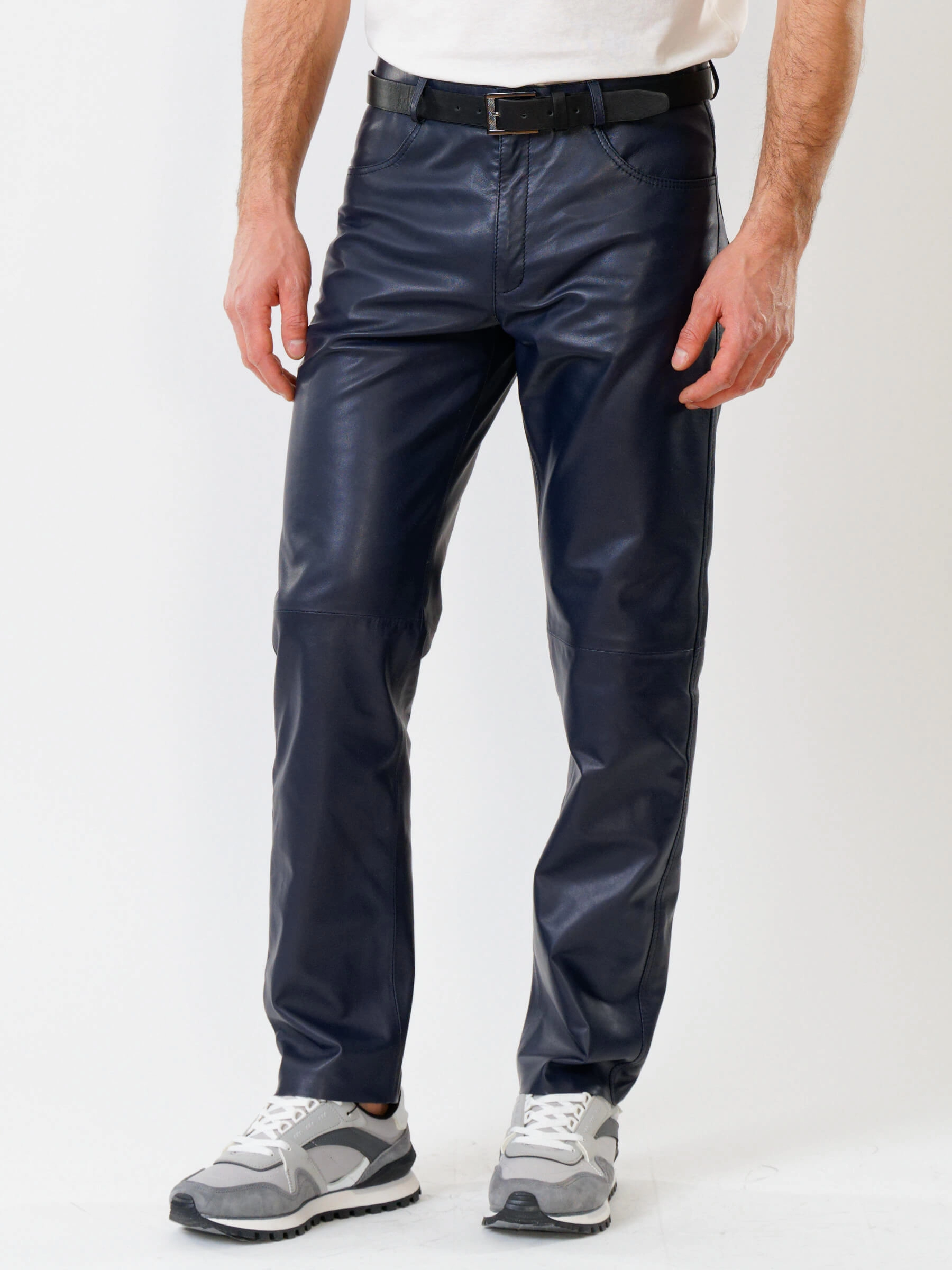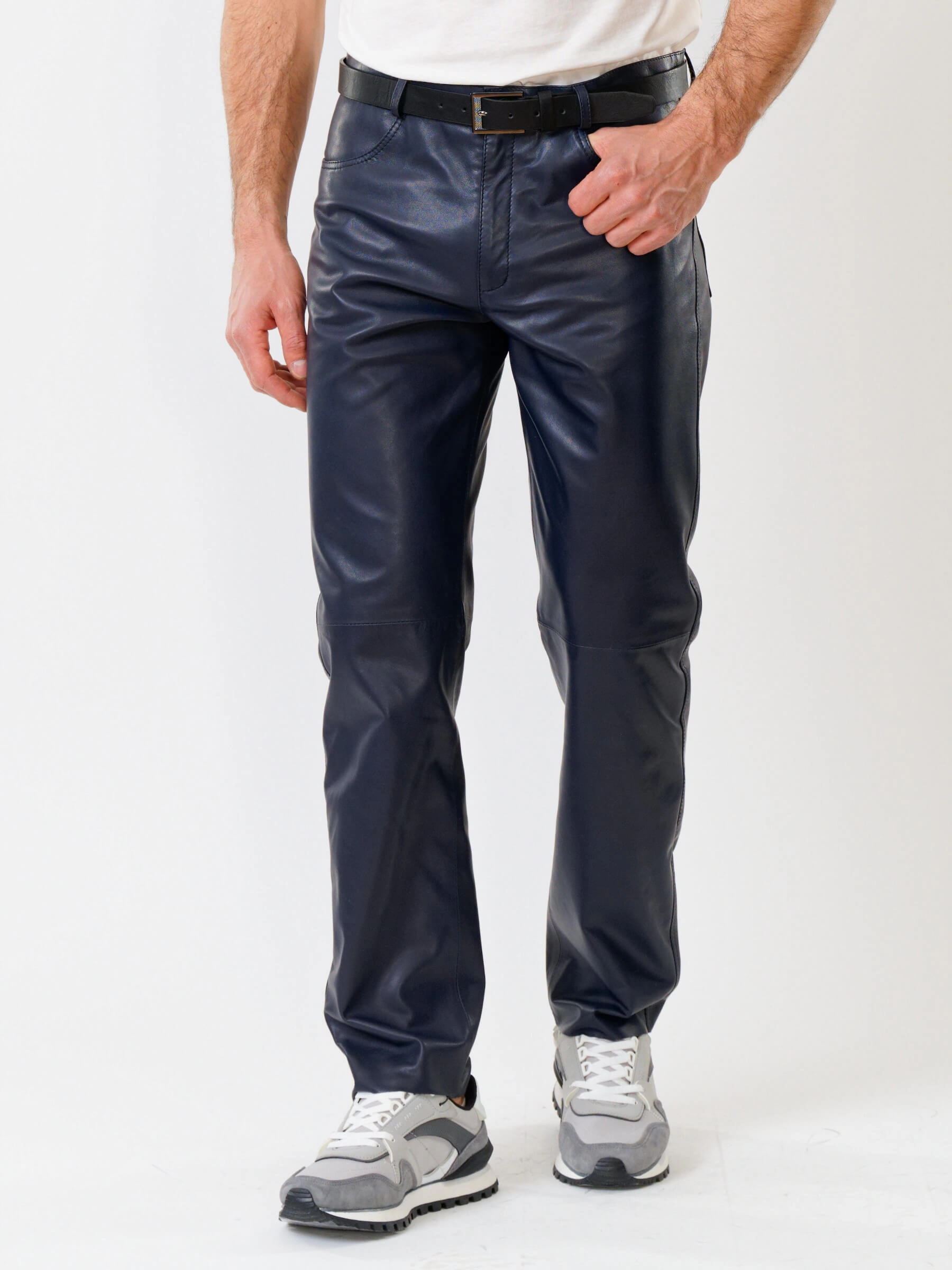 Товар мужские брюки из натуральной кожи премиум класса 01, синие, размер 48, артикул 120010 выполнен из натуральной кожи с застежкой молния. Рассчитан на сезон: демисезон. Длина изделия 103 см, силуэт прямой.