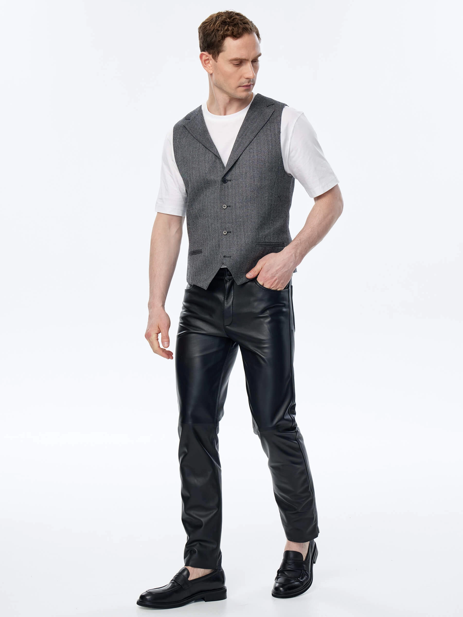 Прямые кожаные джинсы с классическим кроем. Модель поможет сформировать самые разные образы, одинаково удачно сочетаясь как с футболкой и кедами, так и с пальто и челси. Кожа особенно мягкая и слегка эластичная, поэтому вещь комфортно садится по фигуре и не сковывает движения.