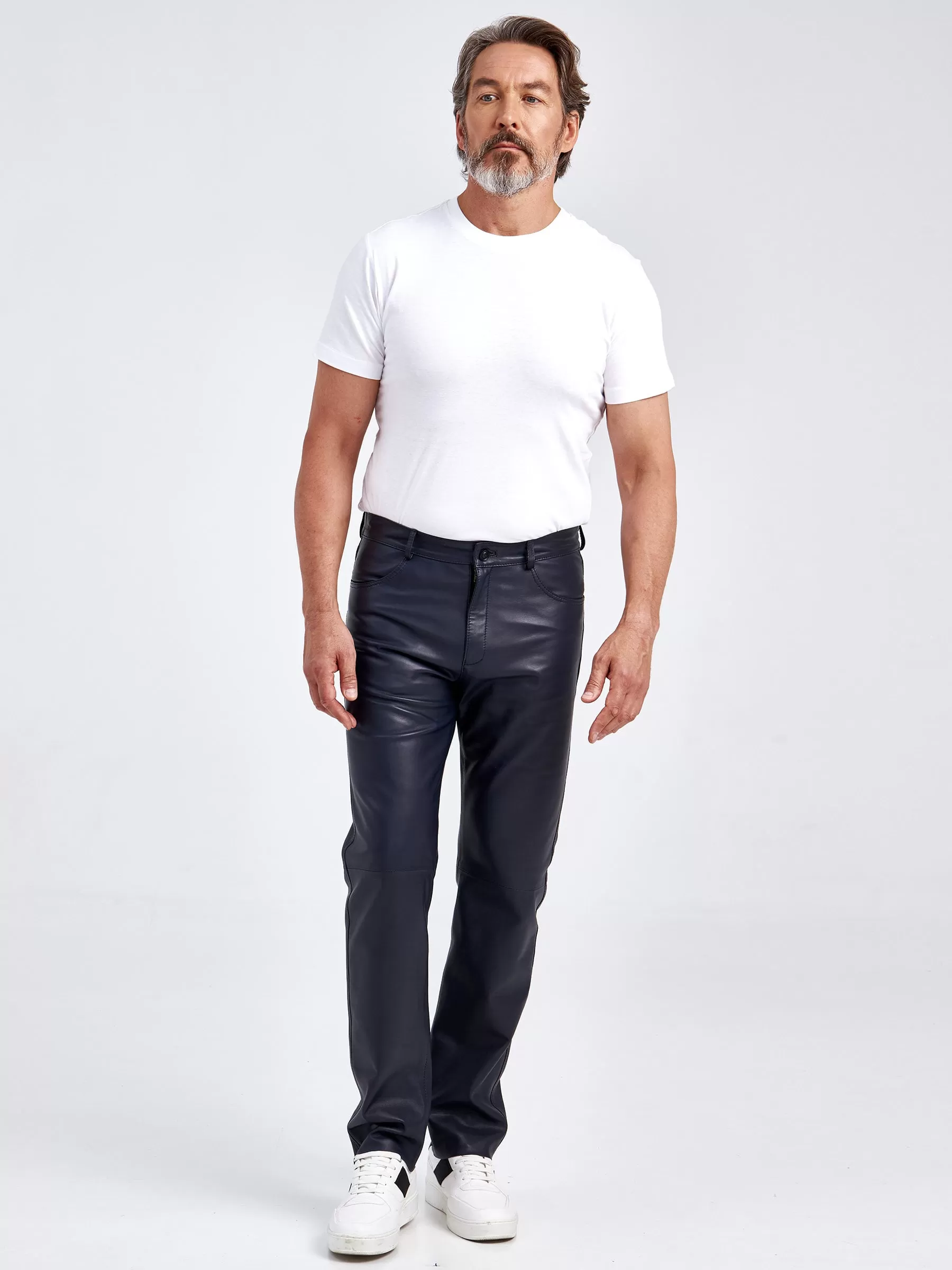 Товар мужские брюки из натуральной кожи премиум класса 01, синие, размер 48, артикул 120021 выполнен из натуральной кожи с застежкой молния. Рассчитан на сезон: демисезон. Длина изделия 103 см, силуэт прямой.