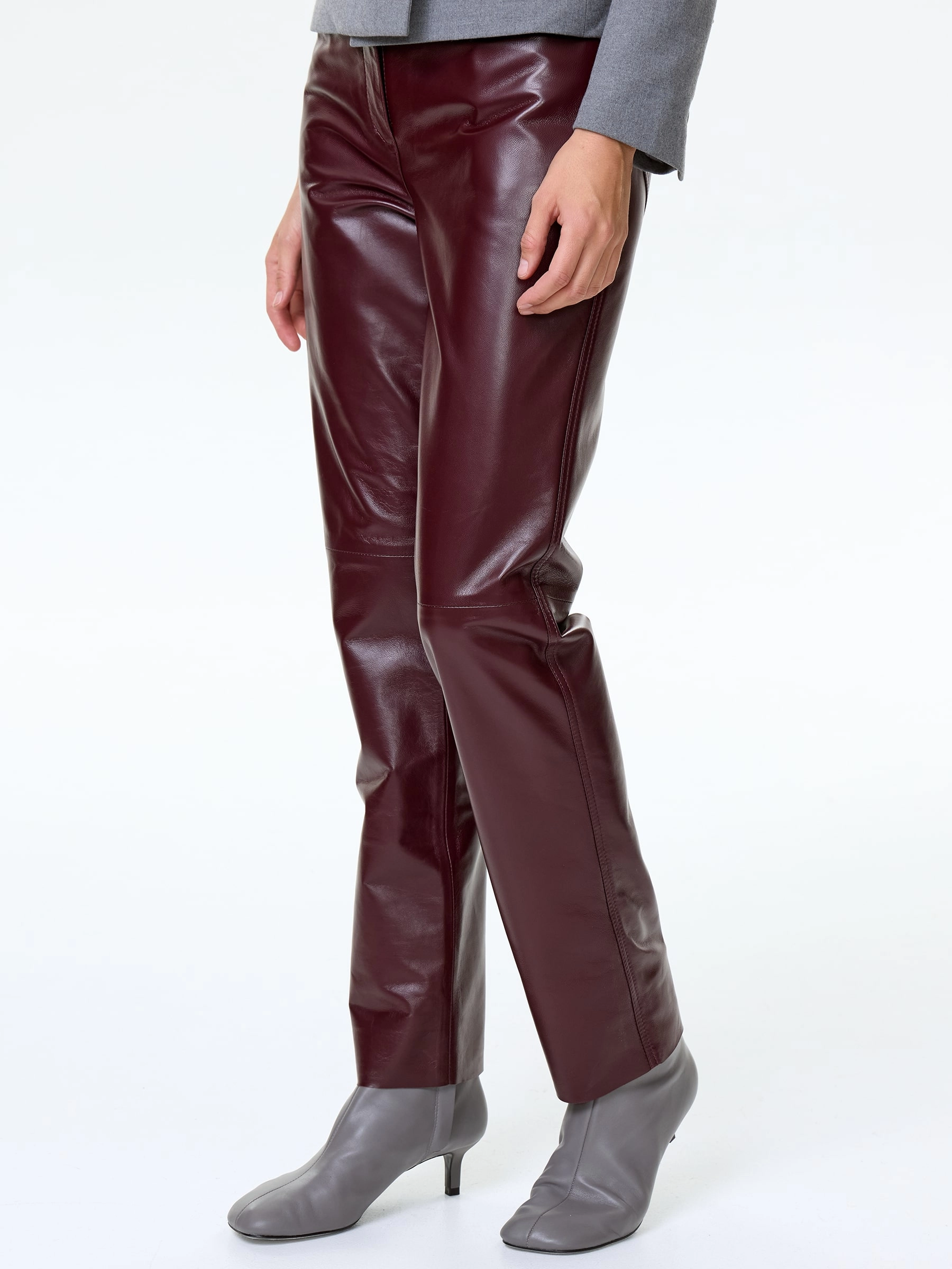 Зауженные брюки из натуральной кожи насыщенного бордового оттенка сочетают элегантность и комфорт. Модель прямого силуэта со средней посадкой идеально подчеркивает женственность. Длина 105 см создает стройный силуэт. Четыре функциональных кармана — два боковых и два задних — добавляют практичности, сохраняя лаконичность дизайна. Потайная застежка-молния с декоративной планкой обеспечивает аккуратный внешний вид и подчеркивает чистоту линий. Глубокий бордовый цвет позволяет создавать разнообразные образы — от классических сочетаний с белой рубашкой до современных луков с объемными свитерами или кожаными жакетами. Эти брюки станут универсальным выбором как для повседневной носки, так и для особых случаев.