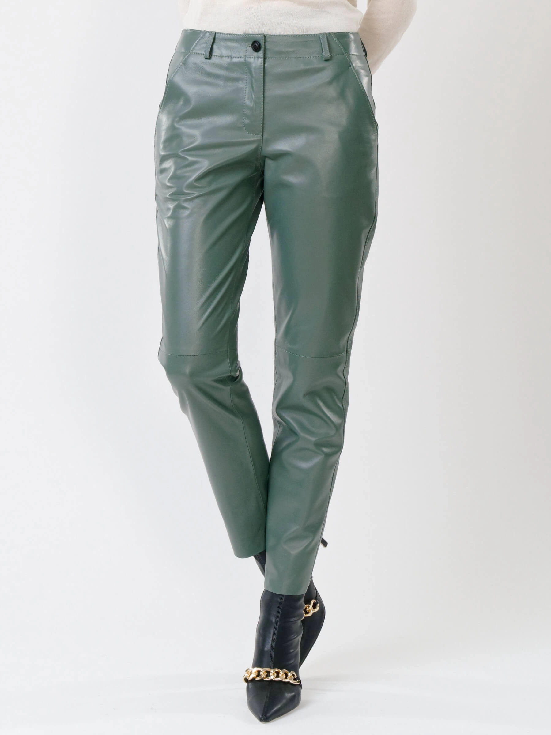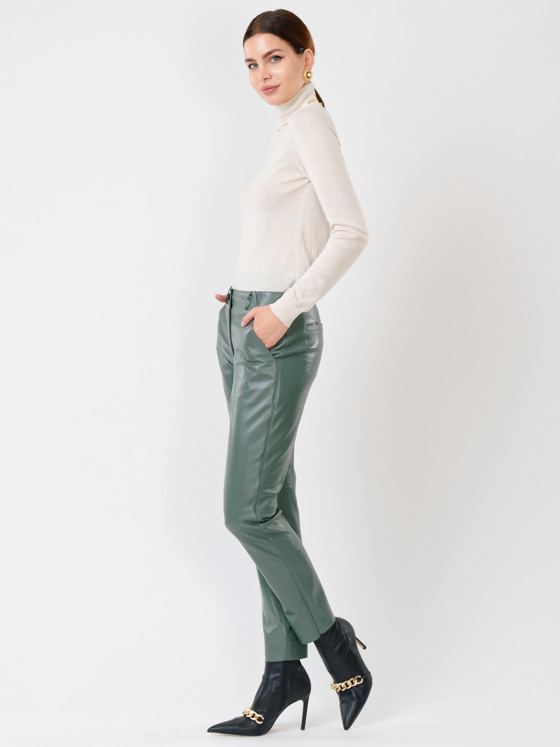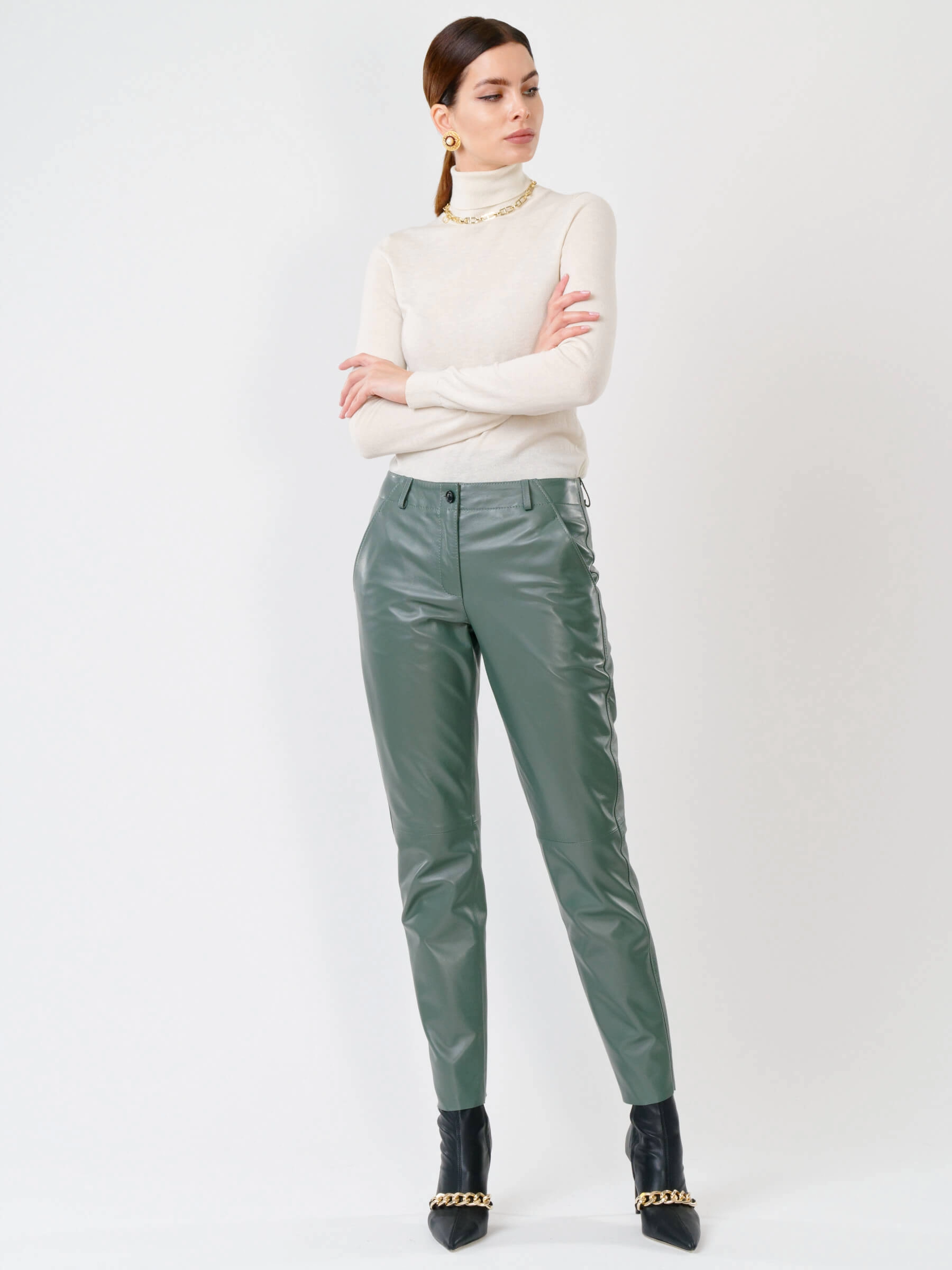 Зауженные женские кожаные брюки 03, оливковые, размер 44, артикул 85260