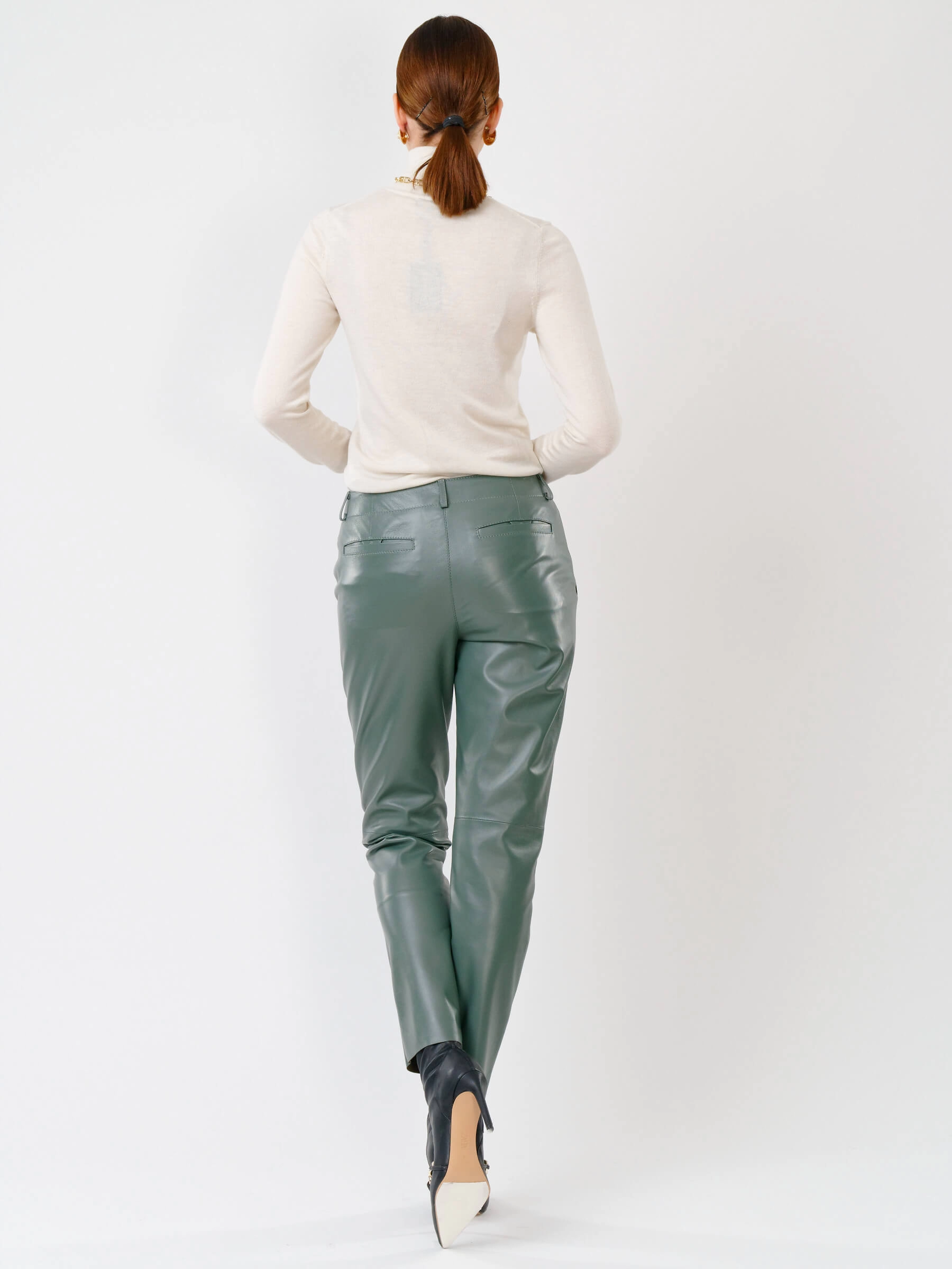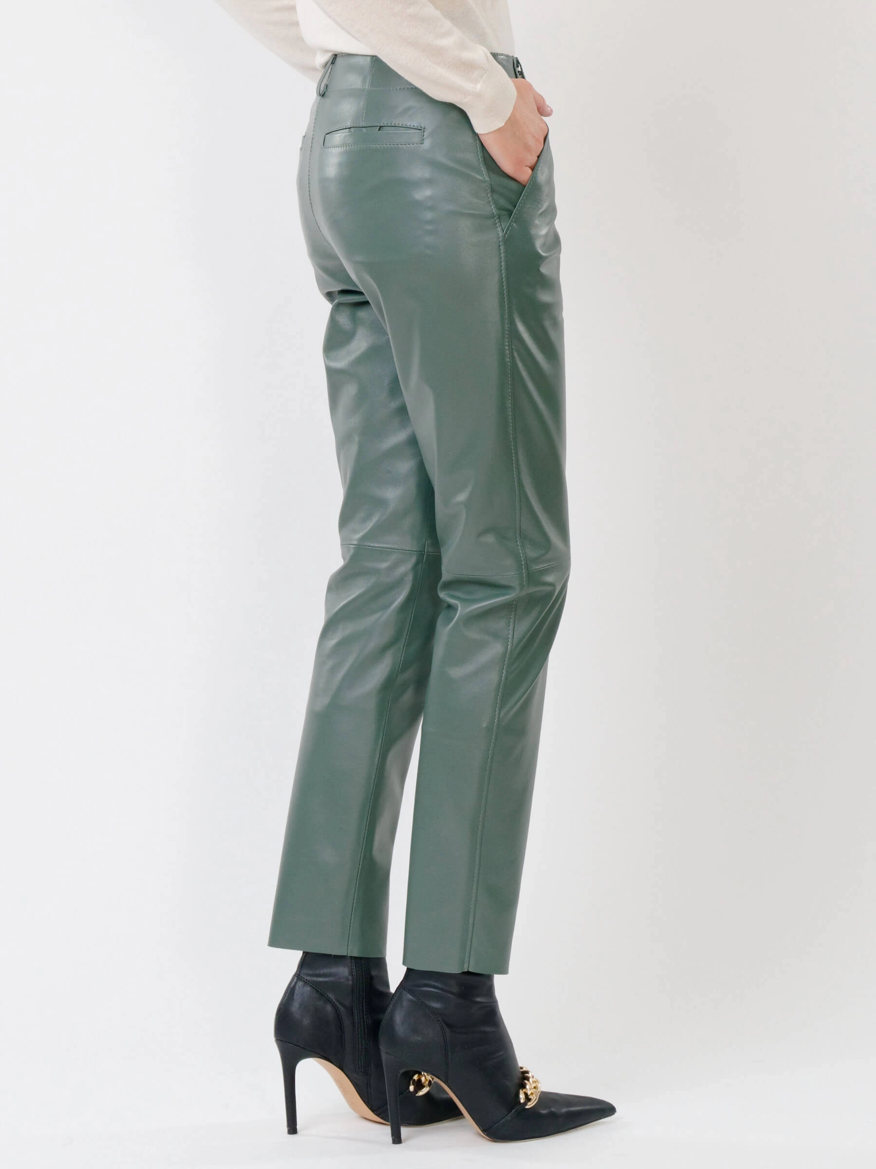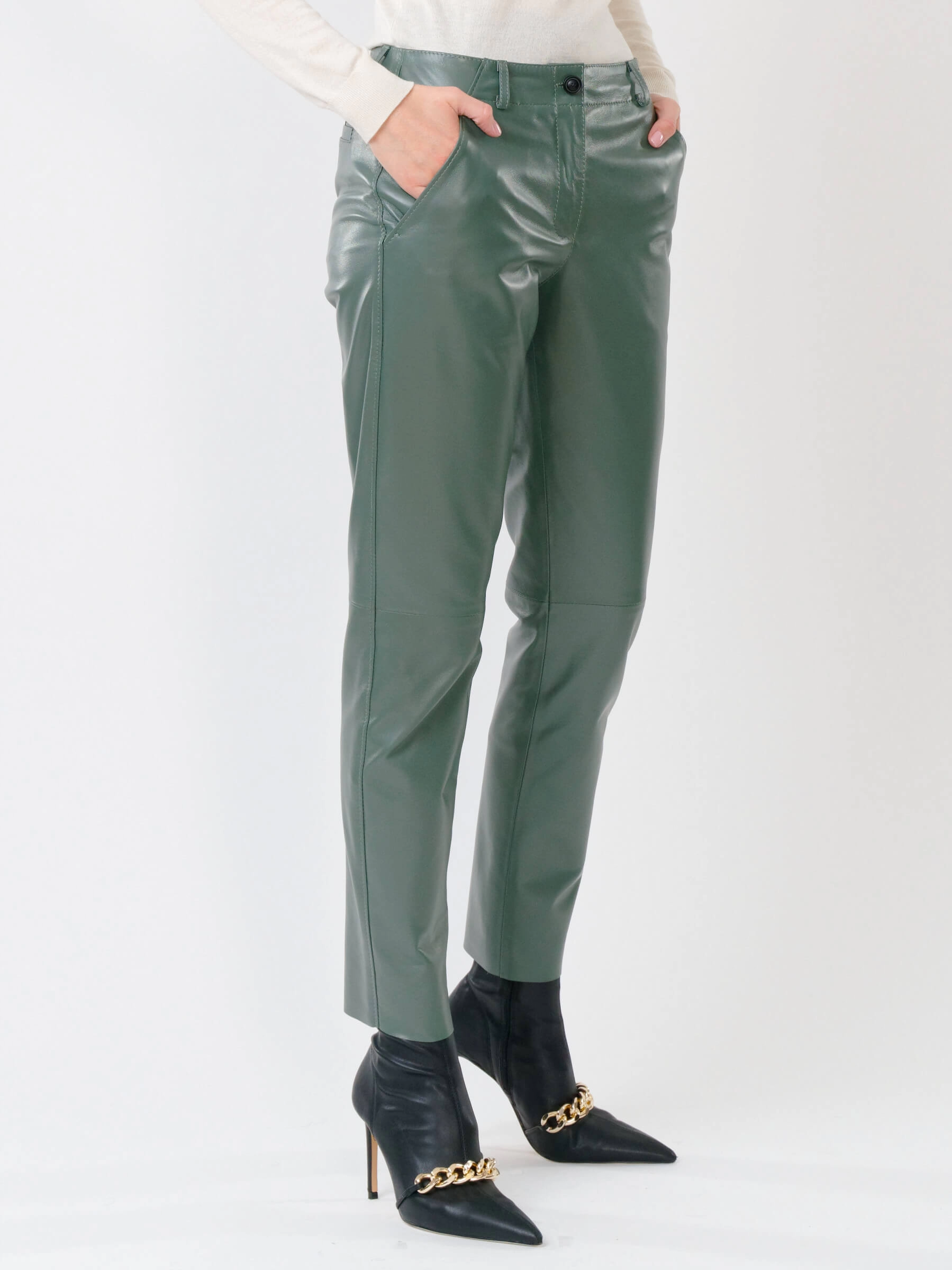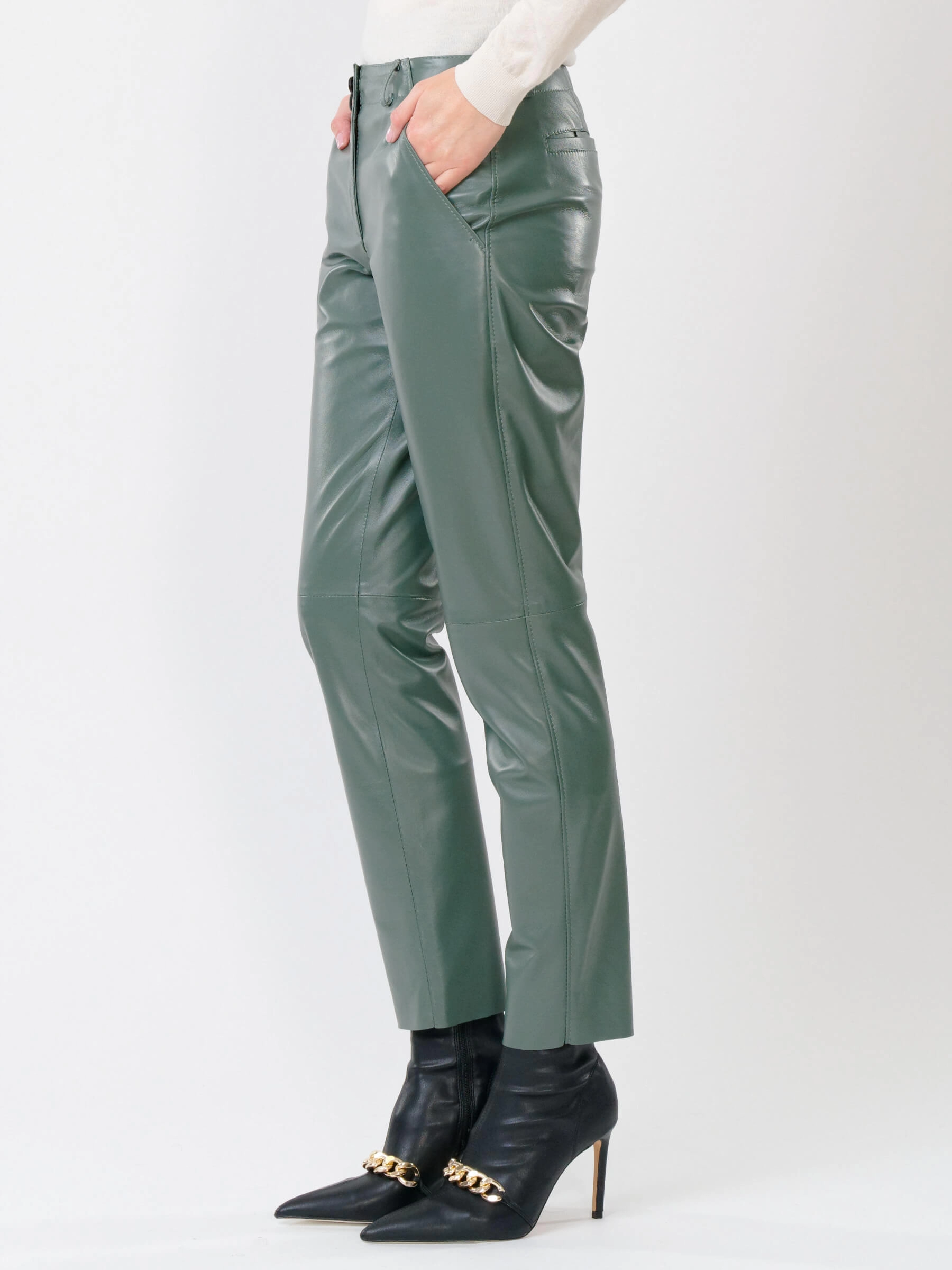 Зауженные женские кожаные брюки 03, оливковые, размер 44, артикул 85260