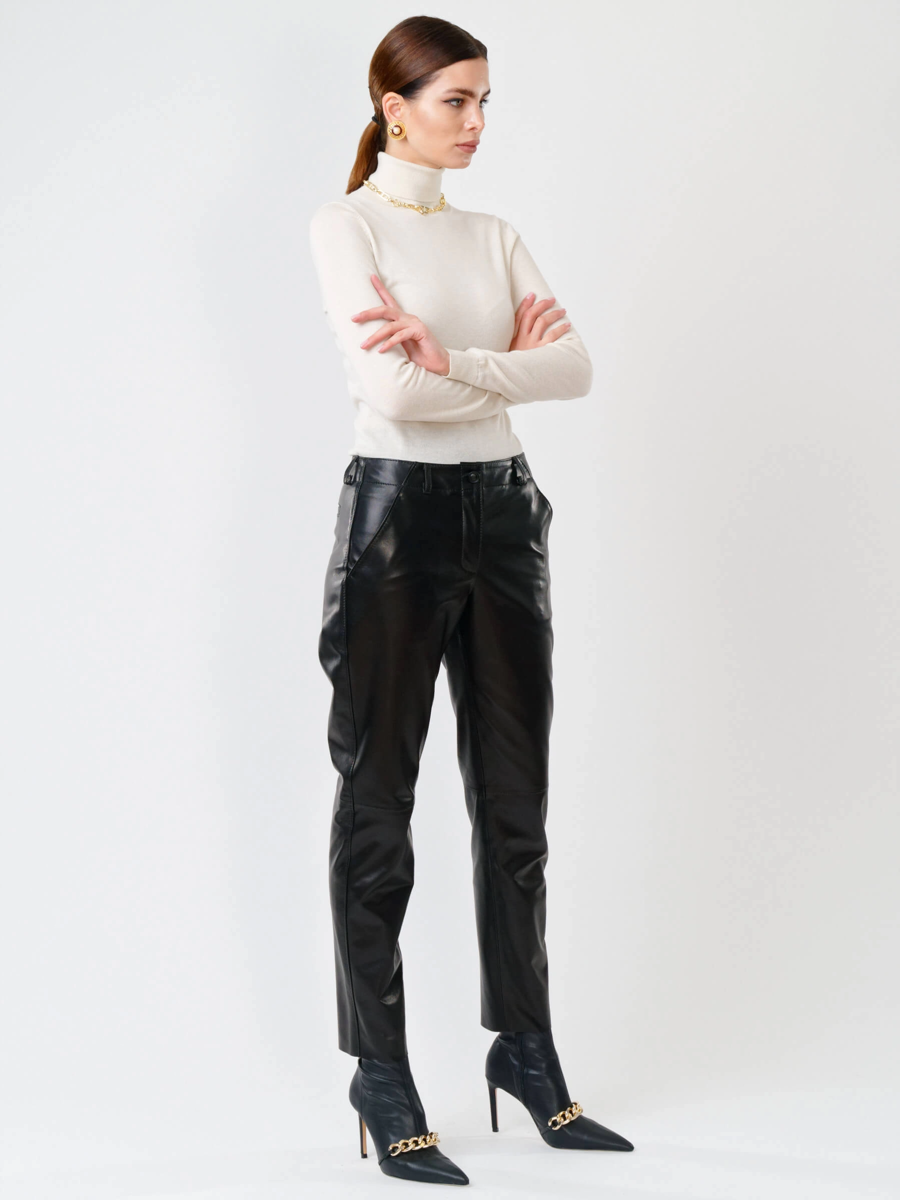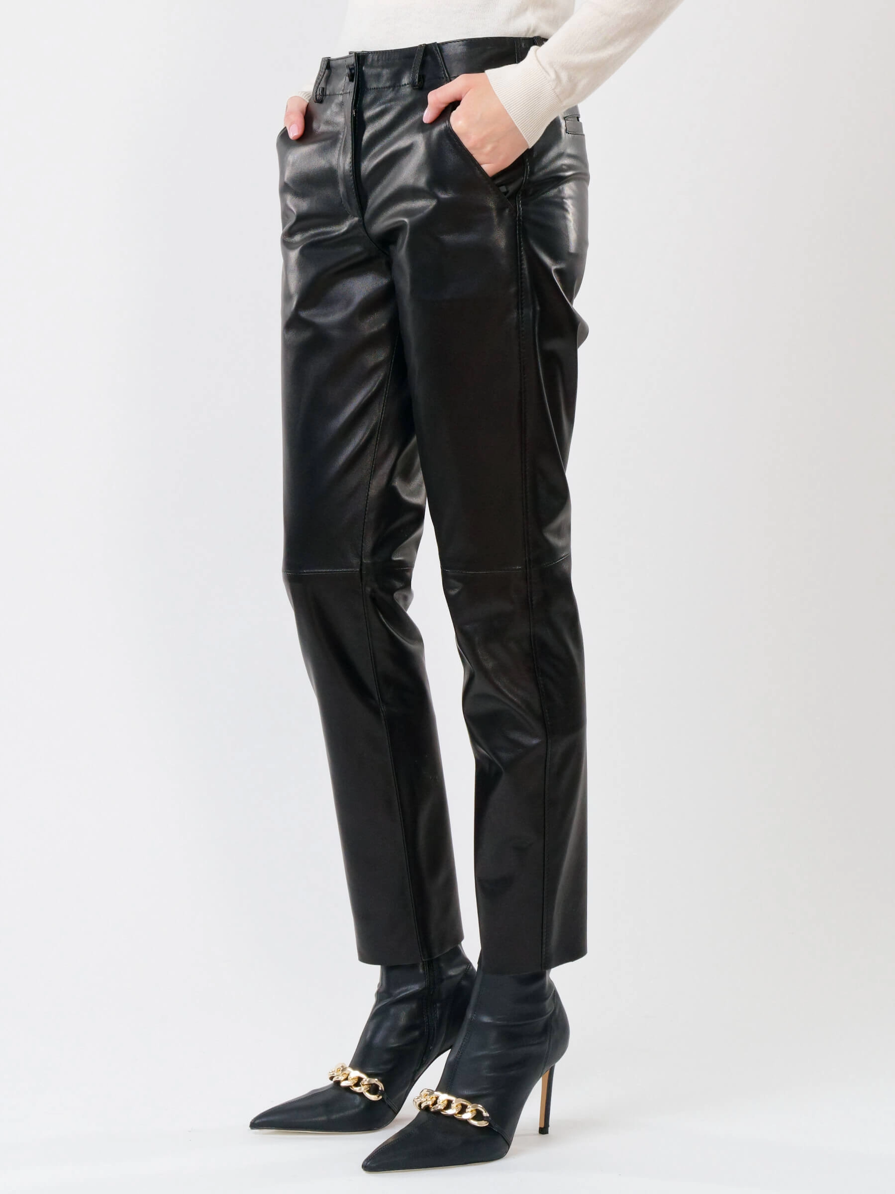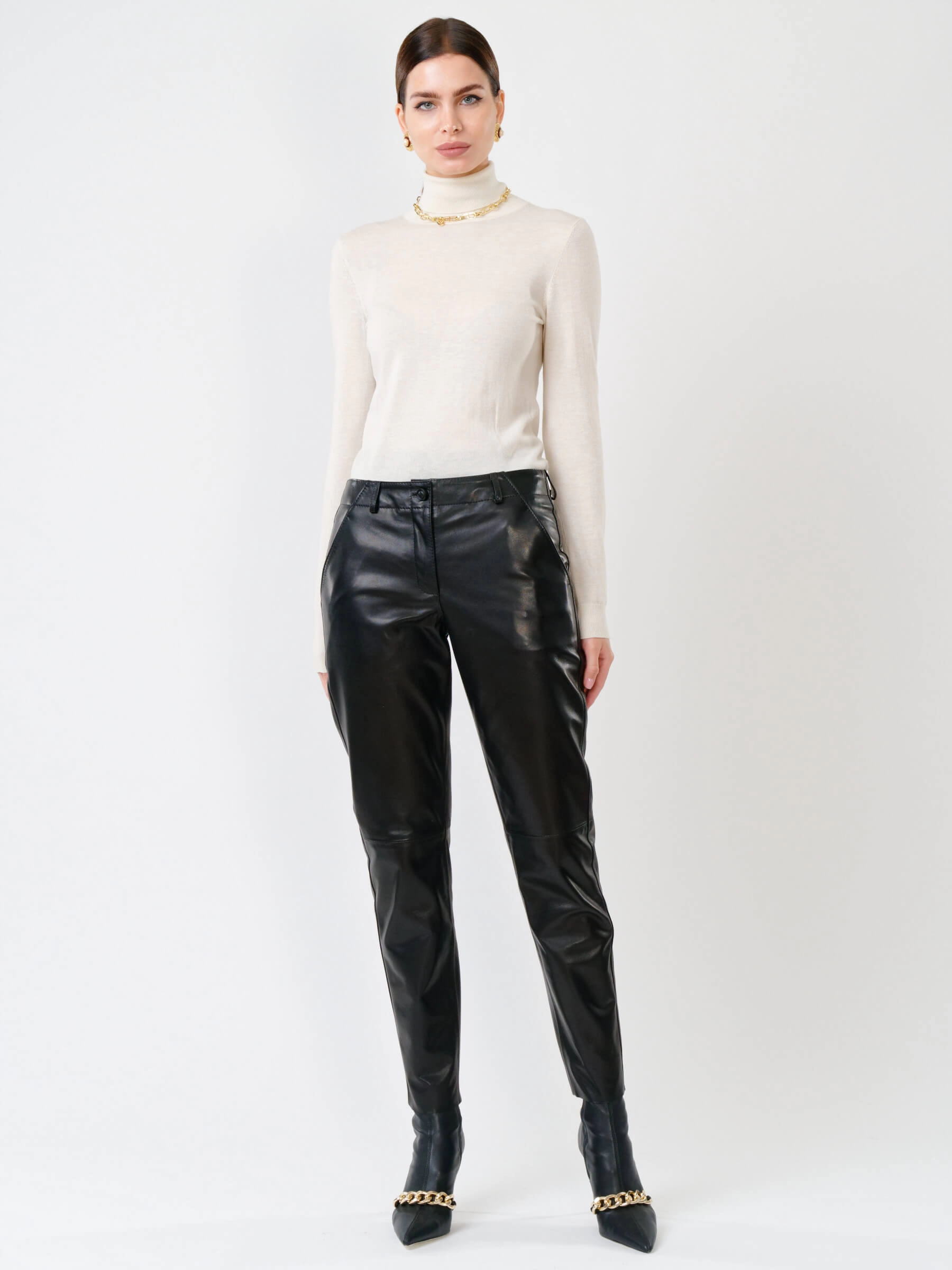 Утончённые женские брюки зауженного кроя из натуральной кожи с элегантной длиной до 98 см. Модель сдержанного дизайна дополнена удобными врезными карманами и мягкой подкладкой из вискозы для максимального комфорта. Потайная молния с аккуратной планкой придаёт образу завершённость. Эти брюки легко впишутся в деловой гардероб, сочетаясь с классической блузой, и в повседневный стиль — с объёмным свитером или кедами. Идеальный выбор для тех, кто ценит лаконичность и универсальность