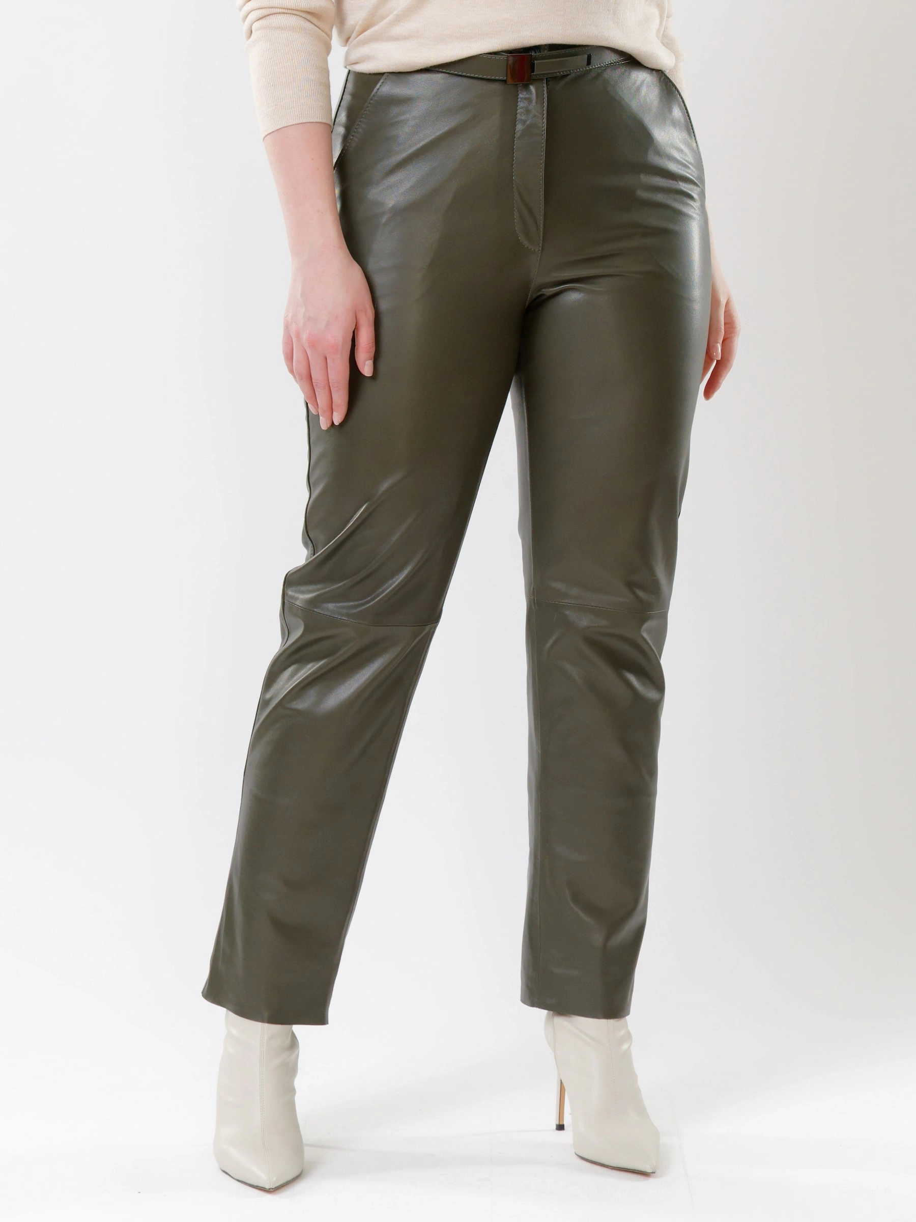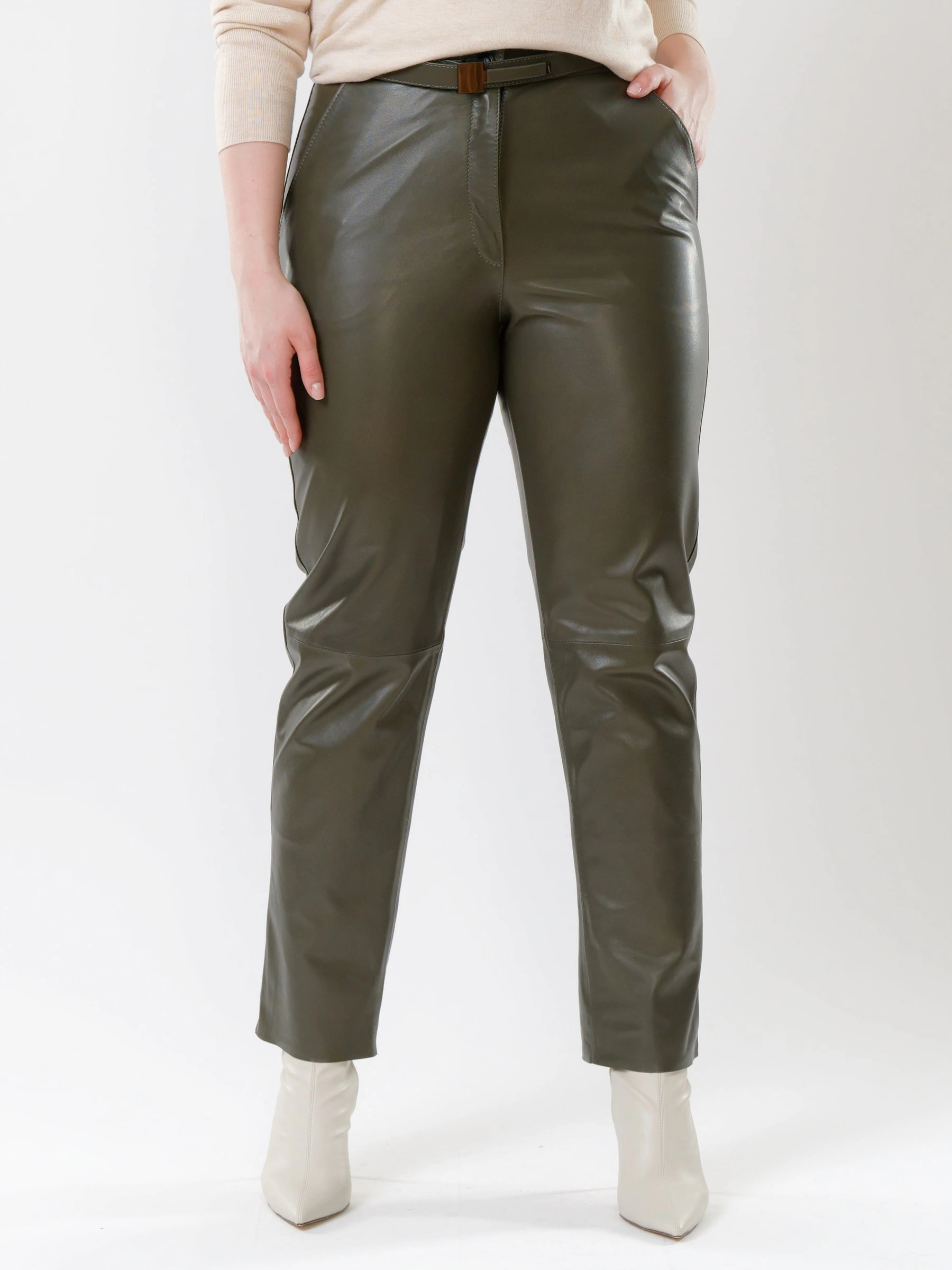 Прямые женские кожаные брюки 04, оливковые, размер 46, артикул 85530