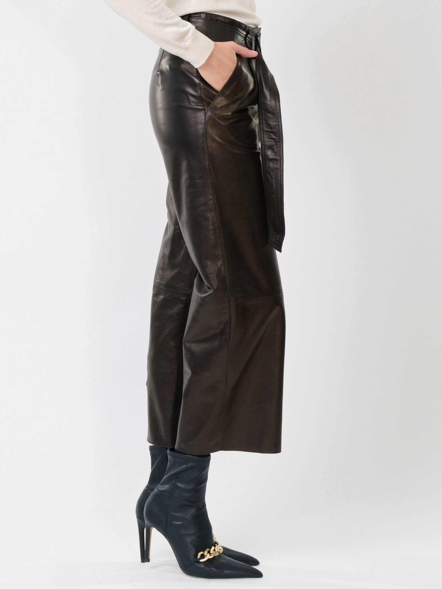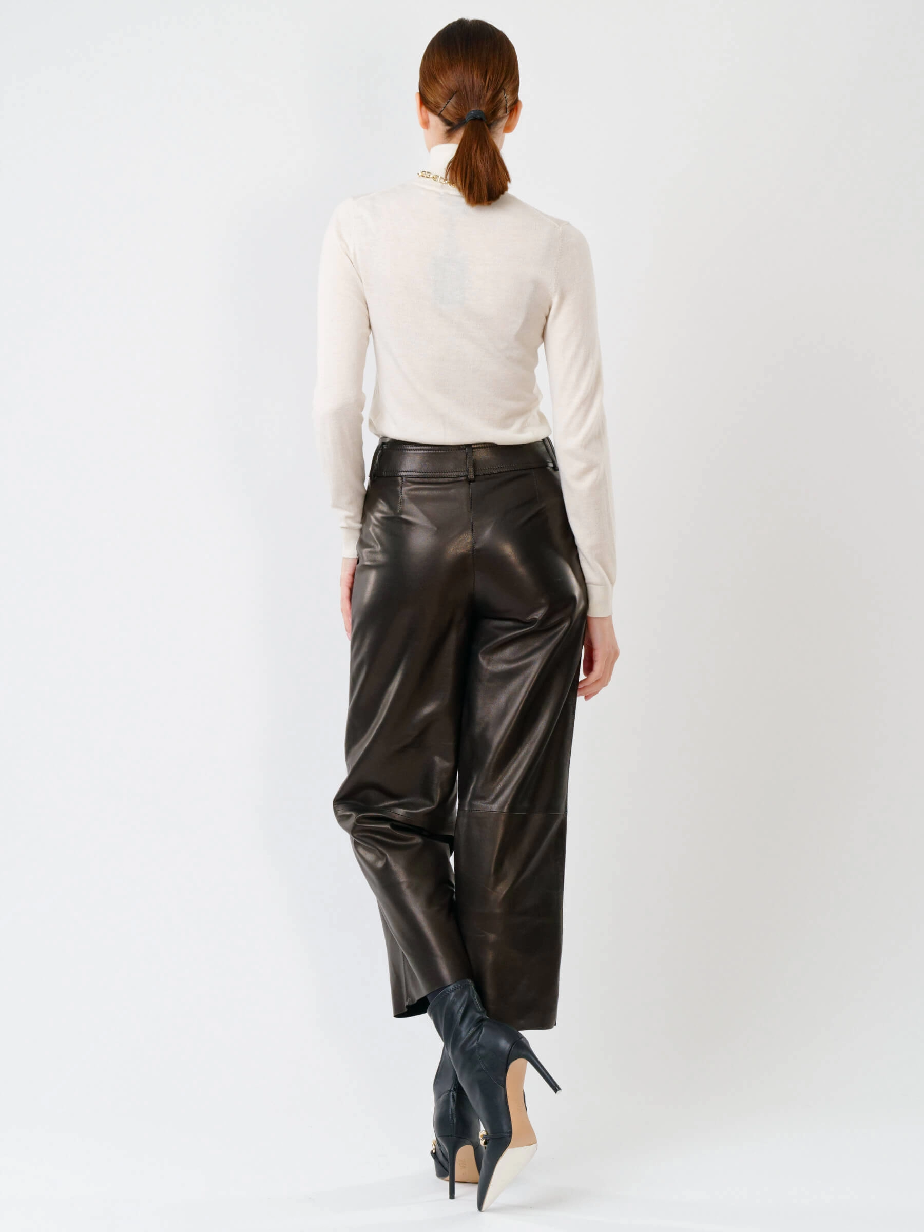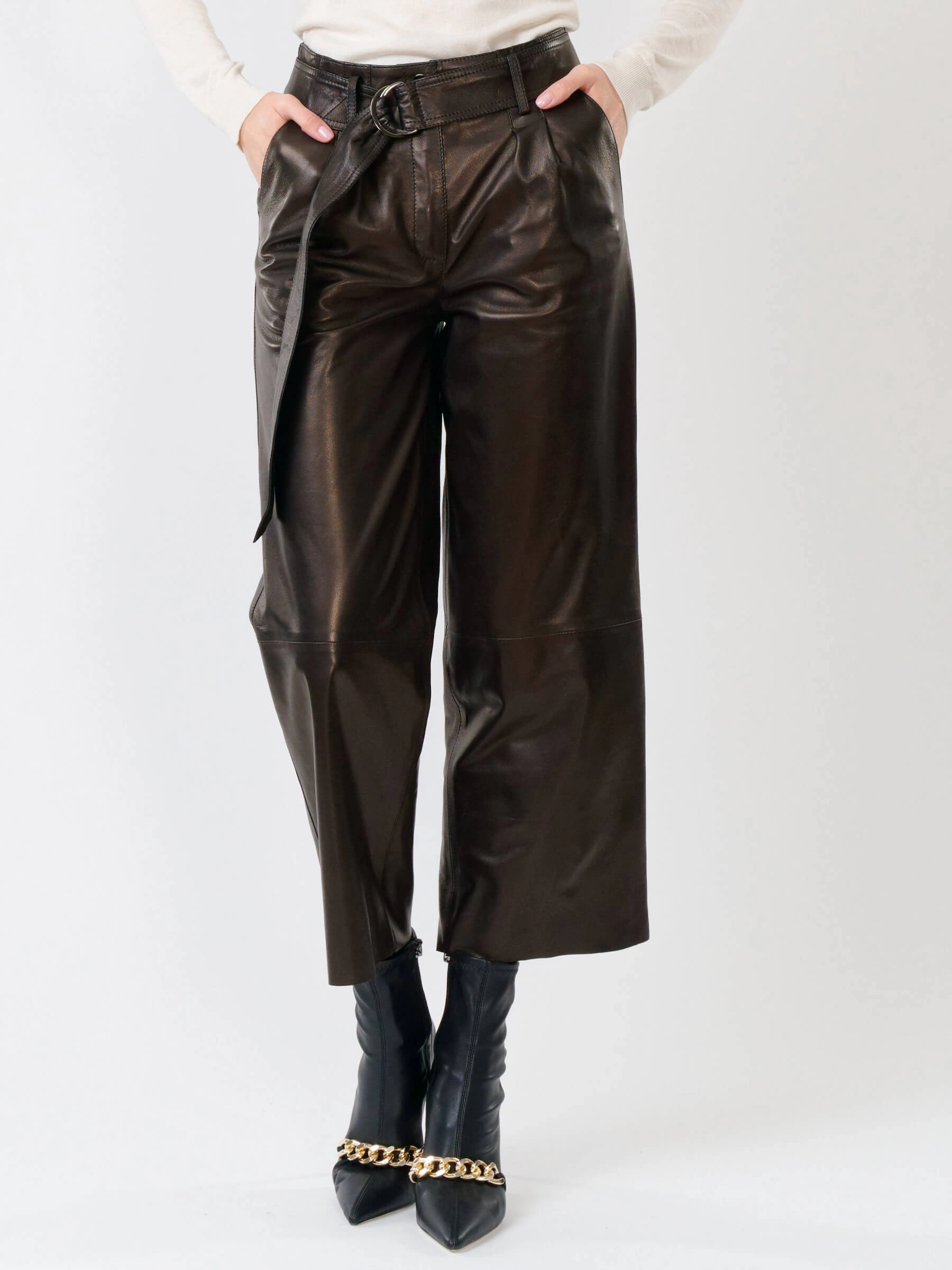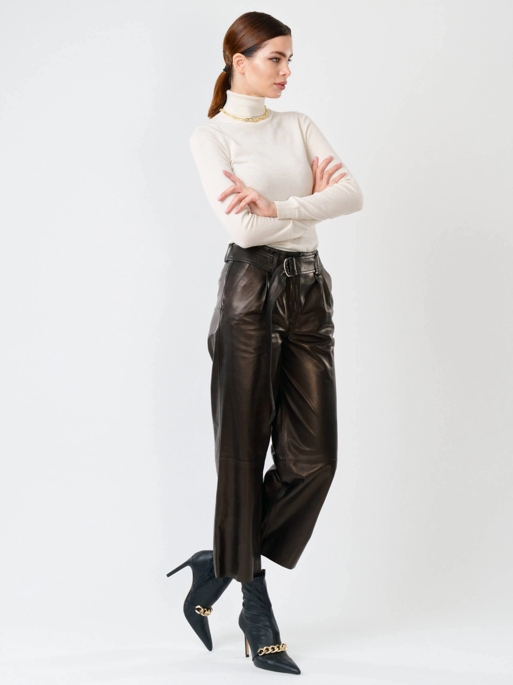 Эти дерзкие кожаные брюки премиум-класса, выполненные в укороченном крое длиной 91 см, предлагают идеальный баланс бунтарского духа и универсальности. Их свободный силуэт с акцентом на широком поясе с пряжкой и застёжкой-молнией создаёт смелый, современный образ, а врезные карманы вносят практичную ноту. Идеальная посадка подчёркивает фигуру, позволяя легко варьировать стиль: от уличного с кедами и кроп-топом до дерзкого офисного — с пиджаком и лаковой обувью, или же для повседневного уюта с массивным свитером.
