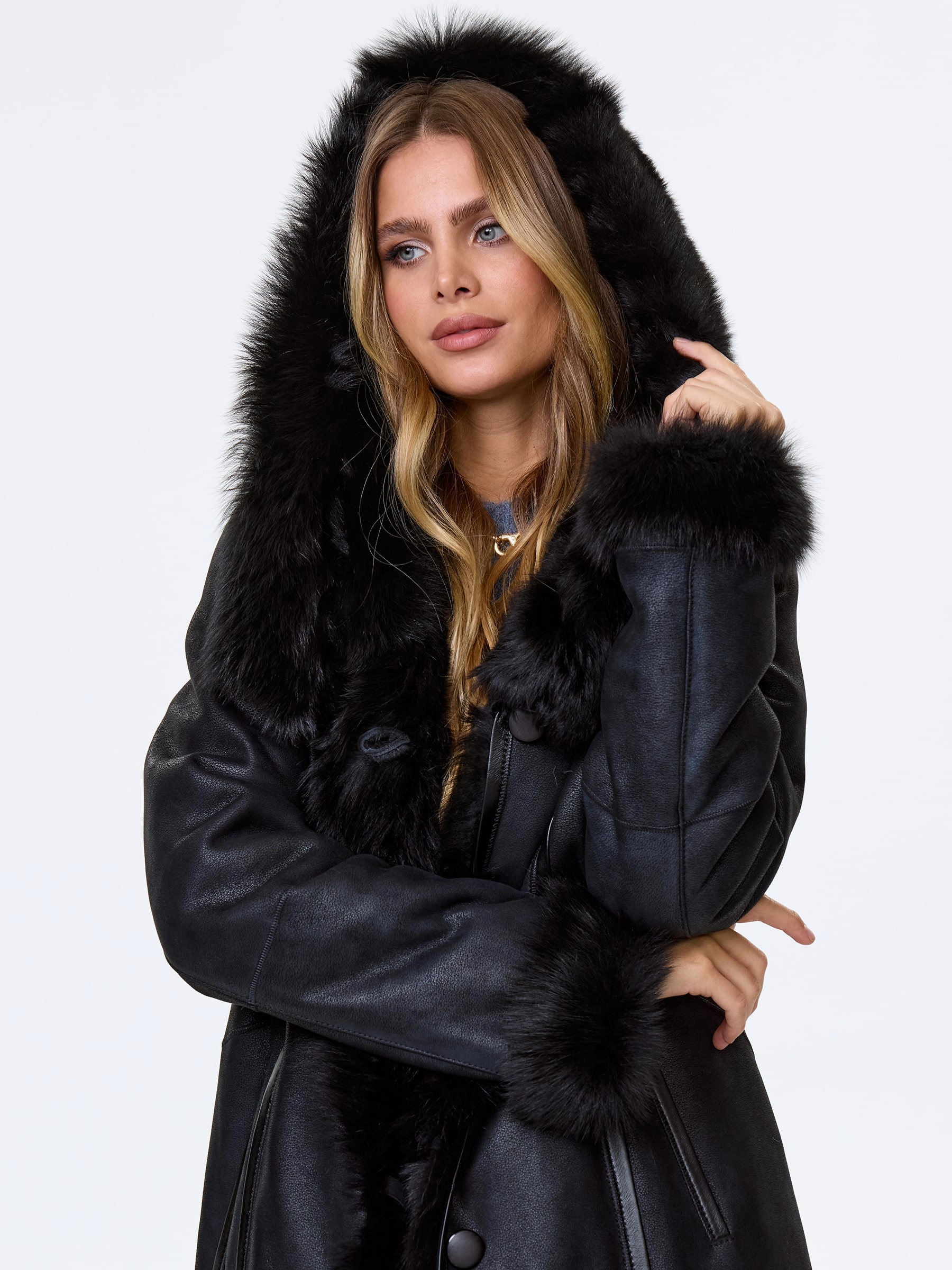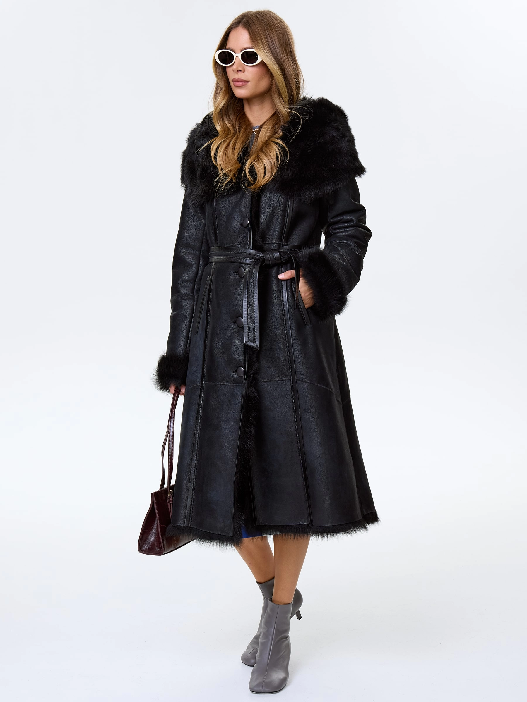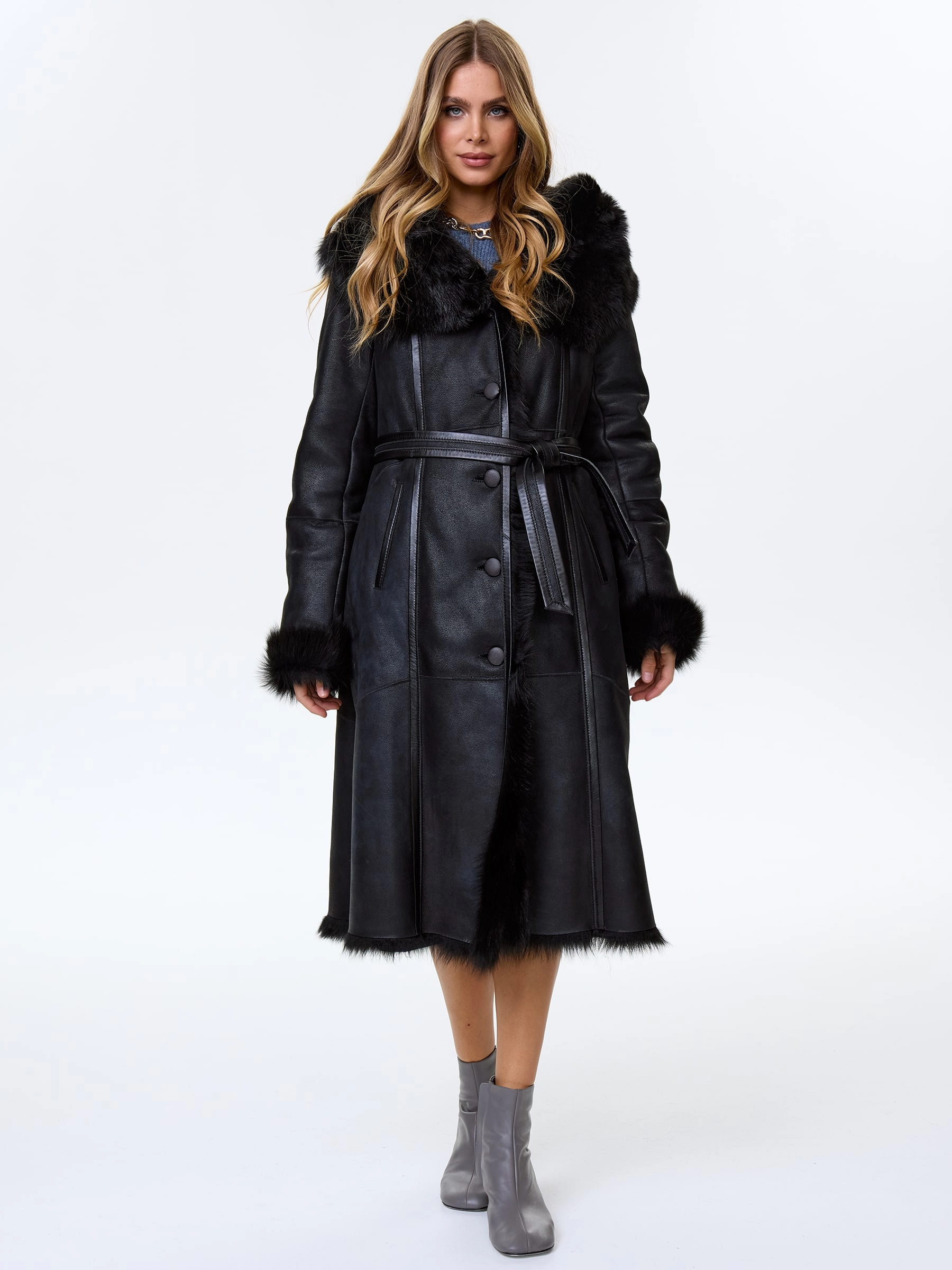 Черная женская дубленка из тосканы с капюшоном премиум-класса — воплощение роскоши, безупречного качества и исключительного комфорта: модель из тосканской овчины в глубоком черном цвете длиной 110 см с полуприлегающим силуэтом и втачным рукавом обеспечивает идеальную посадку по фигуре, подчеркивая женственность и даря свободу движений. Главным акцентом модели стал эффектный широкий несъемный капюшон, который превращается на плечах в изящную шаль, добавляя образу элегантности и универсальности; нежнейший густой и высокий мех тосканы великолепно согревает в любой мороз, а новейшее защитное покрытие надежно предохраняет изделие от царапин, сохраняя безупречный внешний вид. Классическая застежка на пуговицы и отсутствие подкладки подчеркивают премиальное качество и мастерство исполнения. Совет стилиста: трансформируемый капюшон-шаль позволяет создавать разные по настроению образы.