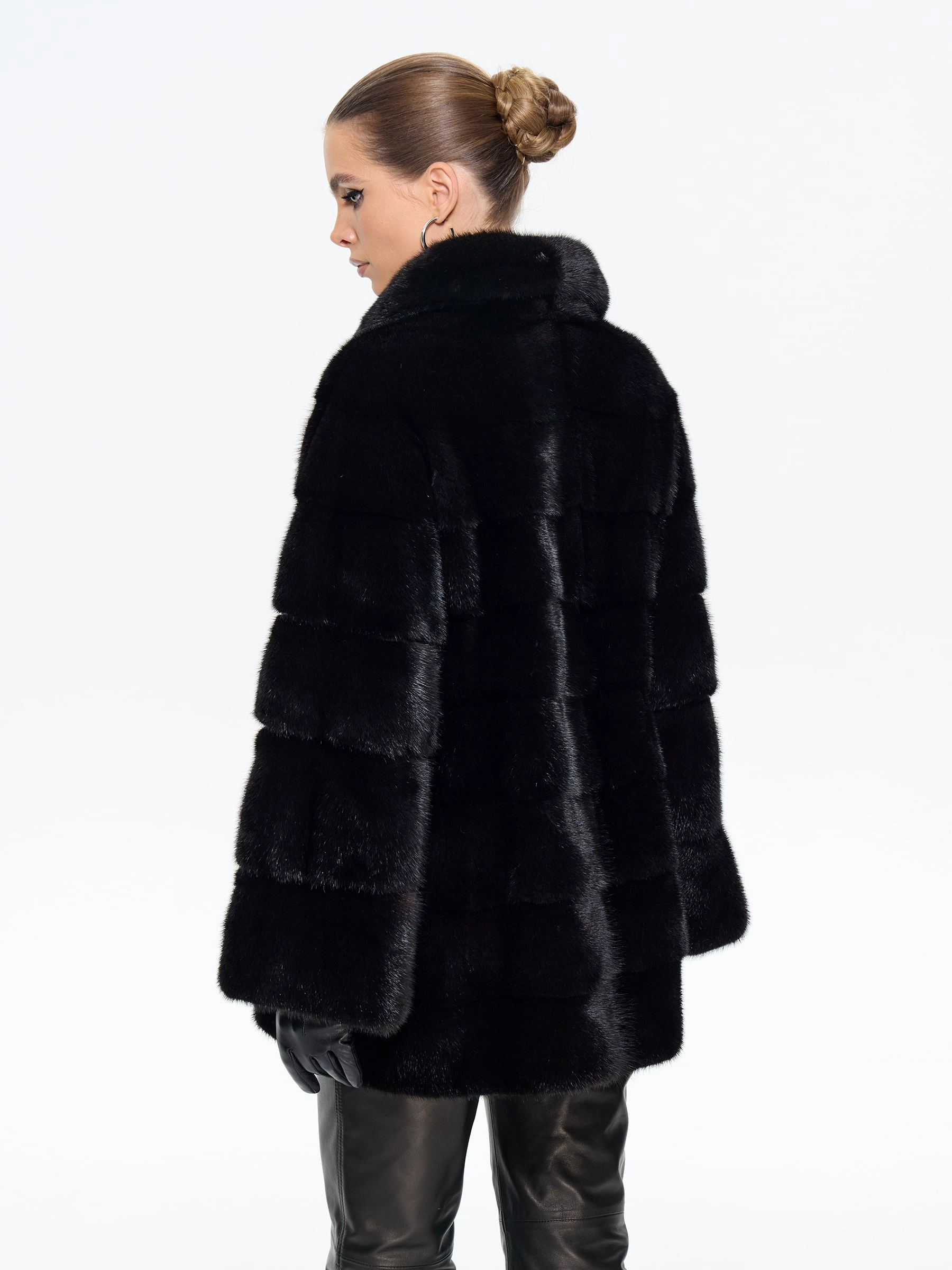 Классическая шуба из густого черного меха норки с блестящим шелковистым ворсом премиального качества сочетает удобство и элегантность. Универсальная длина и прямой крой обеспечивают комфорт для любого типа фигуры, делая модель идеальной для вождения и городских прогулок. Отложной воротник подчеркивает линию шеи, добавляя образу изысканности. Легкое и теплое изделие отлично защищает от мороза, не утяжеляя силуэт. Надежные клипсы-застежки фиксируют шубу, бережно сохраняя мех. MANAKAS — воплощение идеального баланса практичности и роскоши.