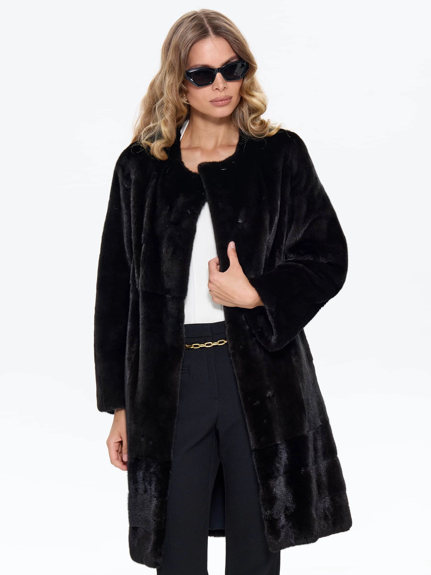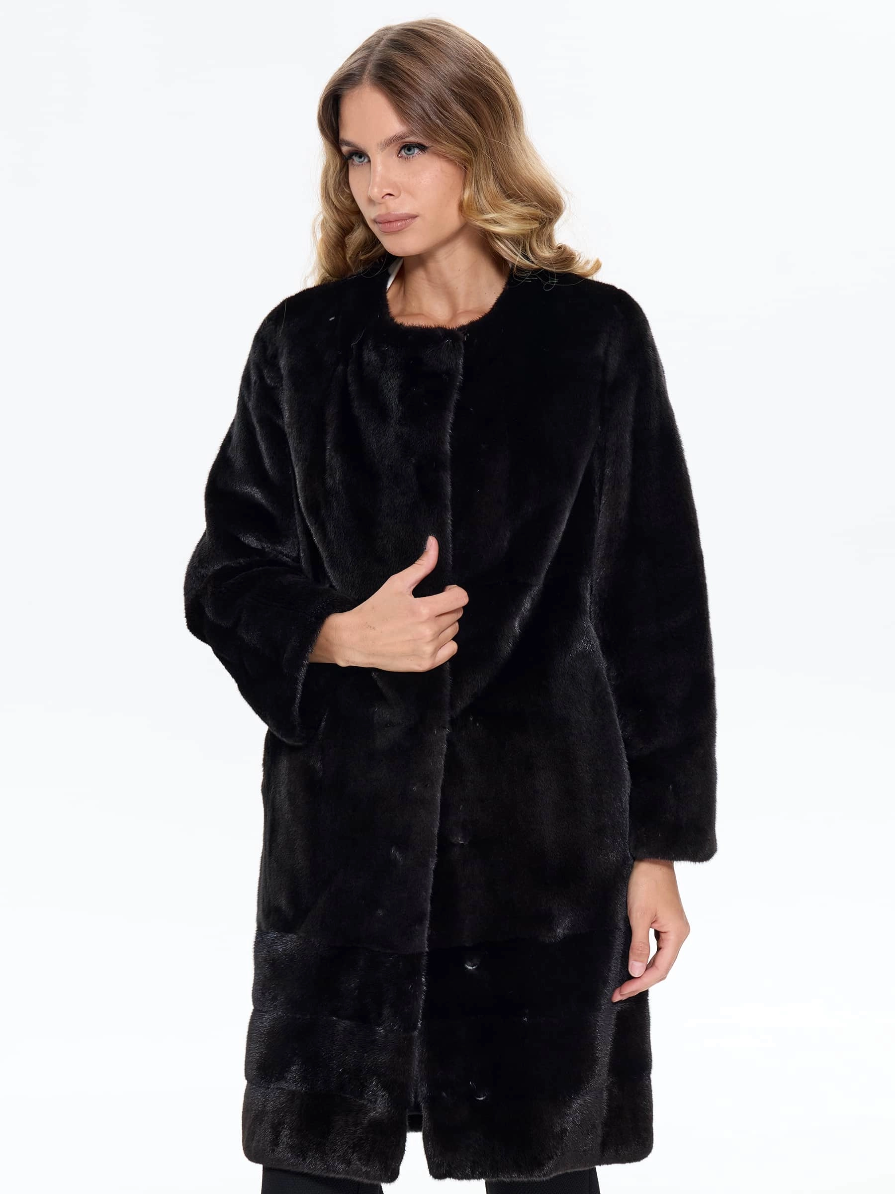 Для пошива этой шубы мастера использовали густой мех норки глубокого черного цвета с металлическим отливом, где шкурки выложены перпендикулярно хребтовой линии, создавая эффект плетеной текстуры. Универсальный прямой крой визуально стройнит фигуру, а отсутствие воротника дает свободу для объемных снудов и шелковых платков, в то время как бесшовное соединение плеча и рукава реглана устраняет давление на верхнюю часть тела, обеспечивая абсолютную свободу движений. Усиленные проймы с двойной строчкой предотвращают деформацию при ношении объемной одежды, а длина midi, закрывающая бедра и часть колен, создает оптимальный баланс тепла и мобильности. Изделие с двумя боковыми карманами идеально подходит для города, удобно в транспорте и отлично сохраняет тепло в суровые морозы, завершая образ аккуратной застежкой на скрытых клипсах.