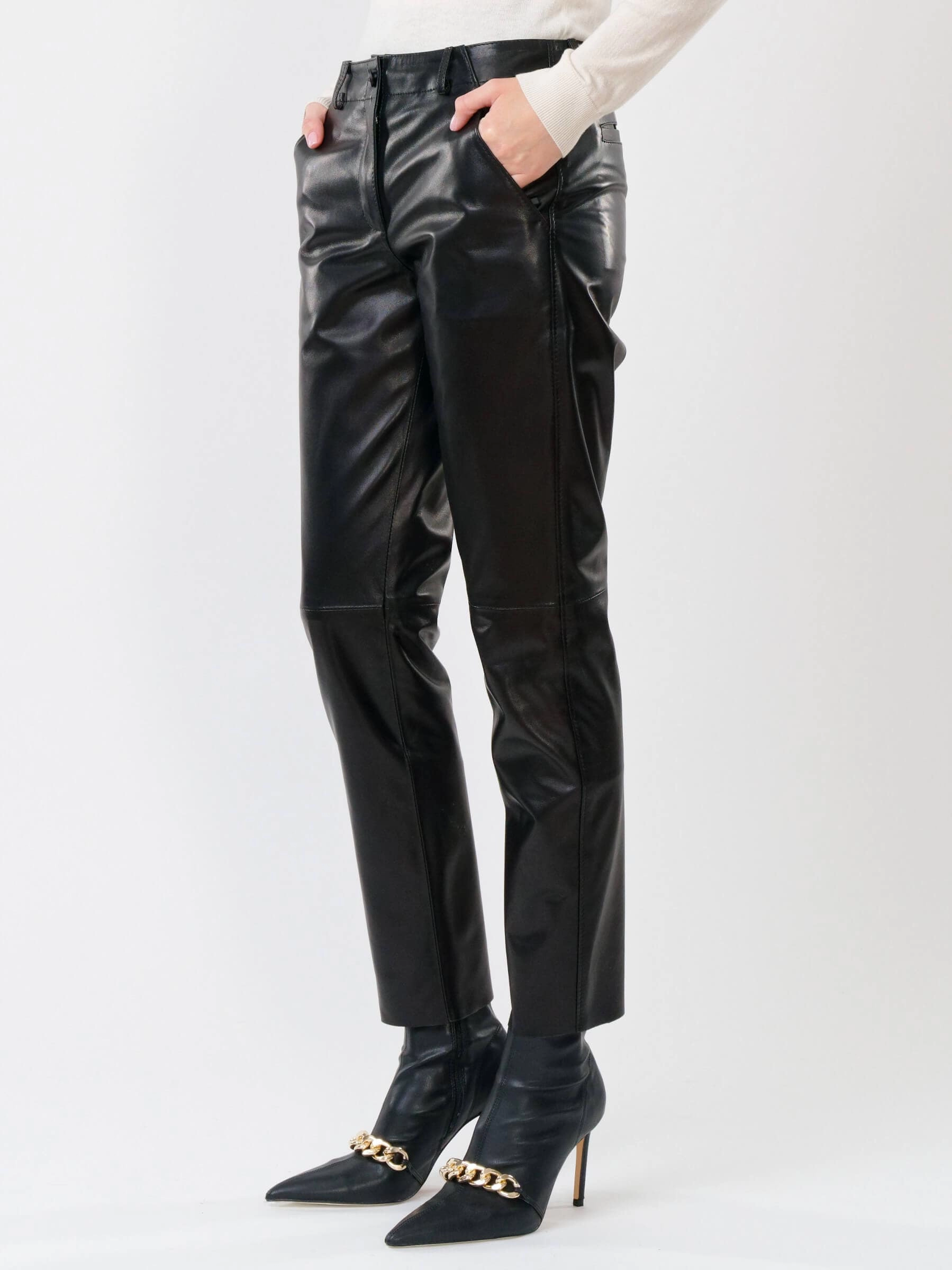 Товар черные зауженные женские кожаные брюки 03, размер 48, артикул 85502 выполнен из натуральной кожи с застежкой молния. Рассчитан на сезон: демисезон. Длина изделия 98 см, силуэт зауженный.
