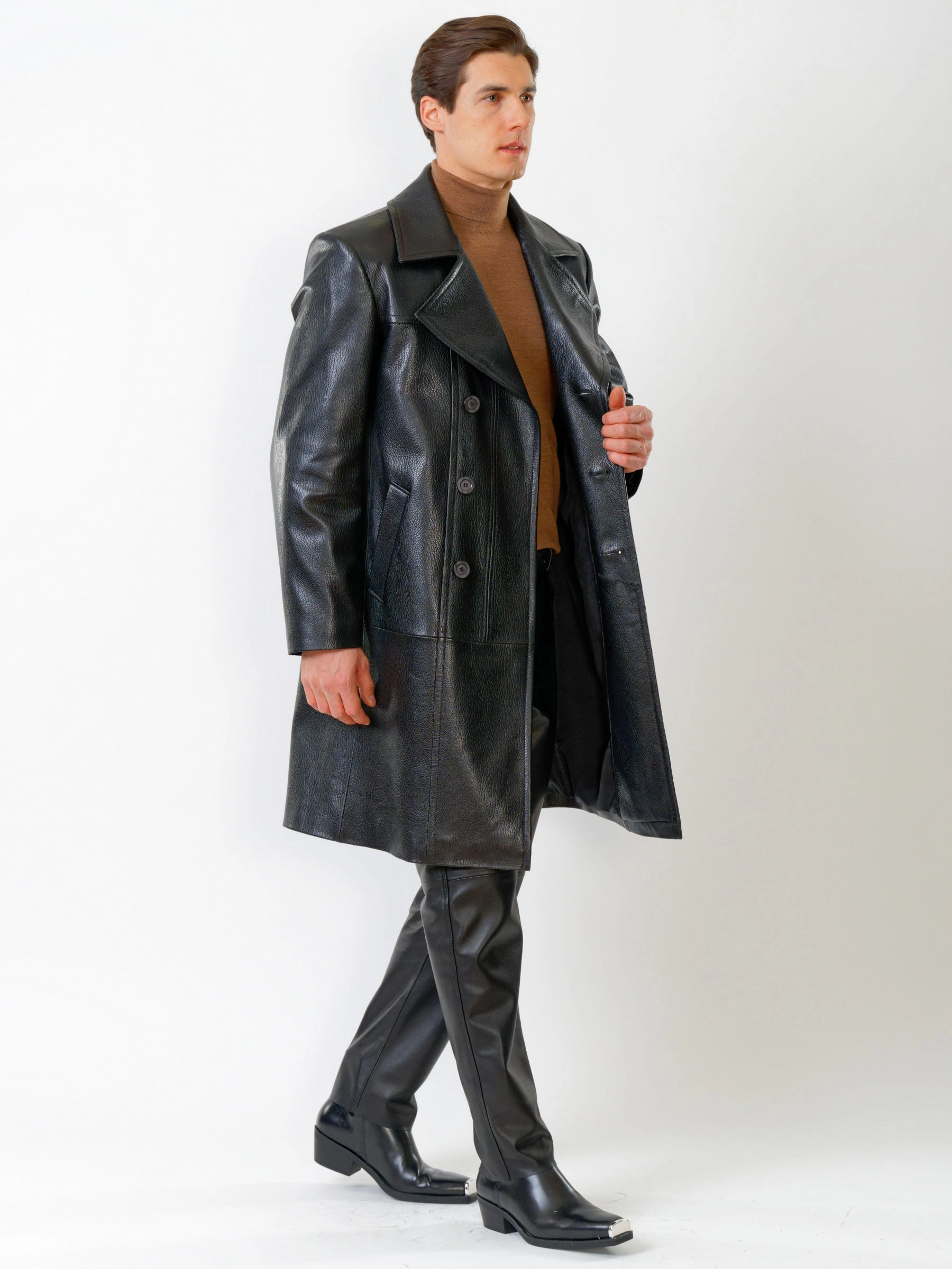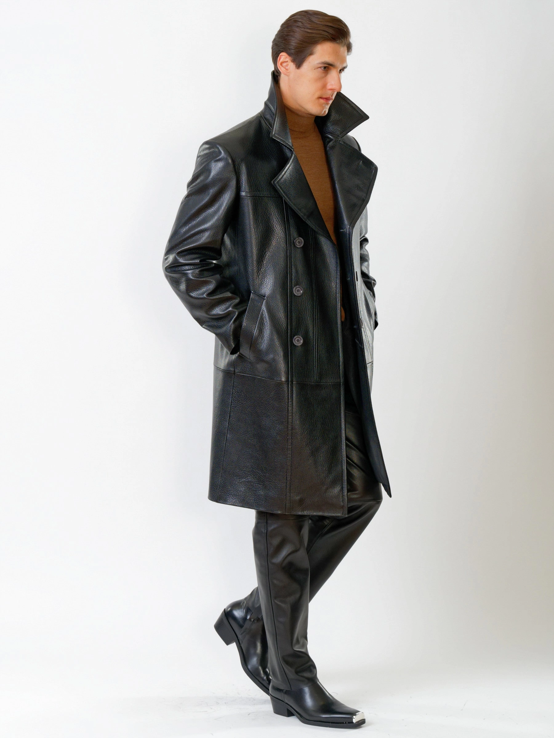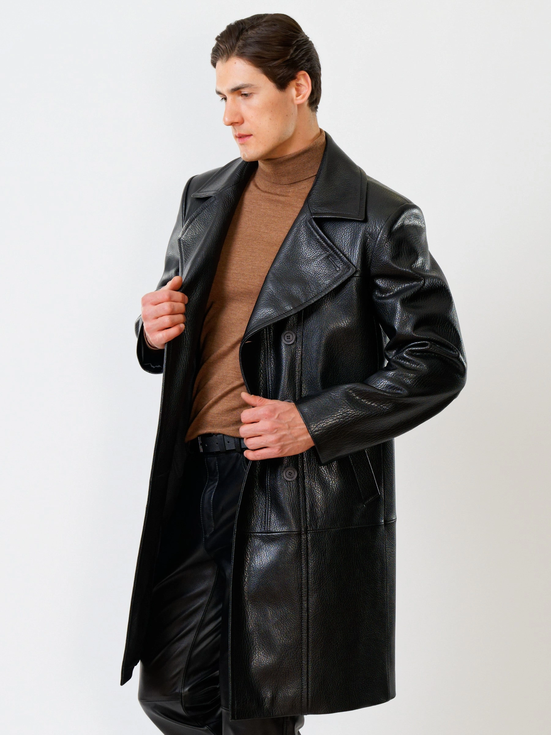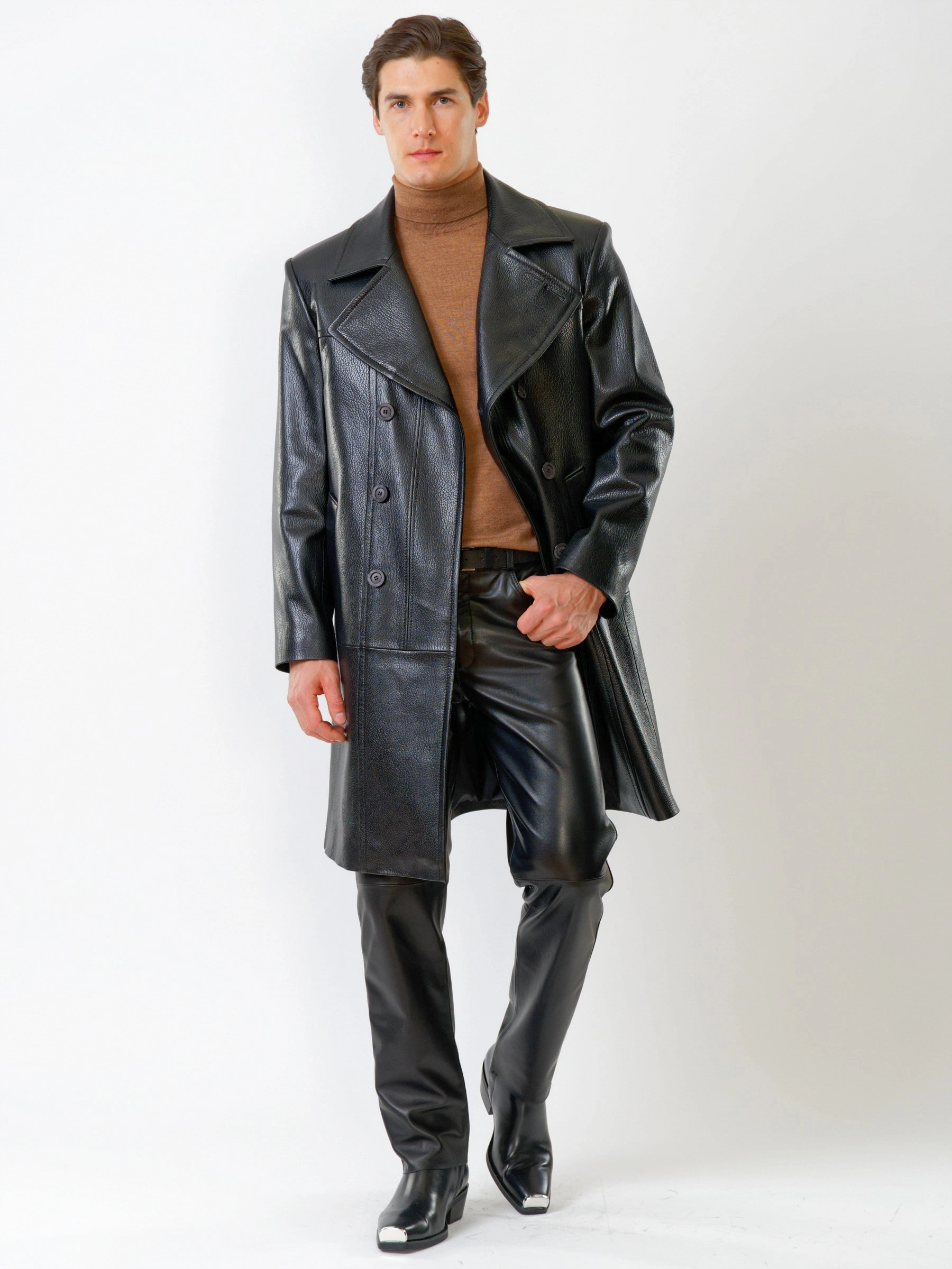 Двубортное кожаное пальто и кожаные брюки. Брутальный образ. Кожа премиального качества. Безупречная работа портных. Комфортная посадка по фигуре.