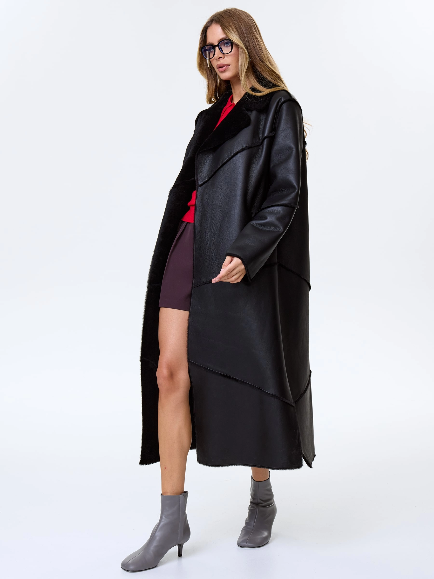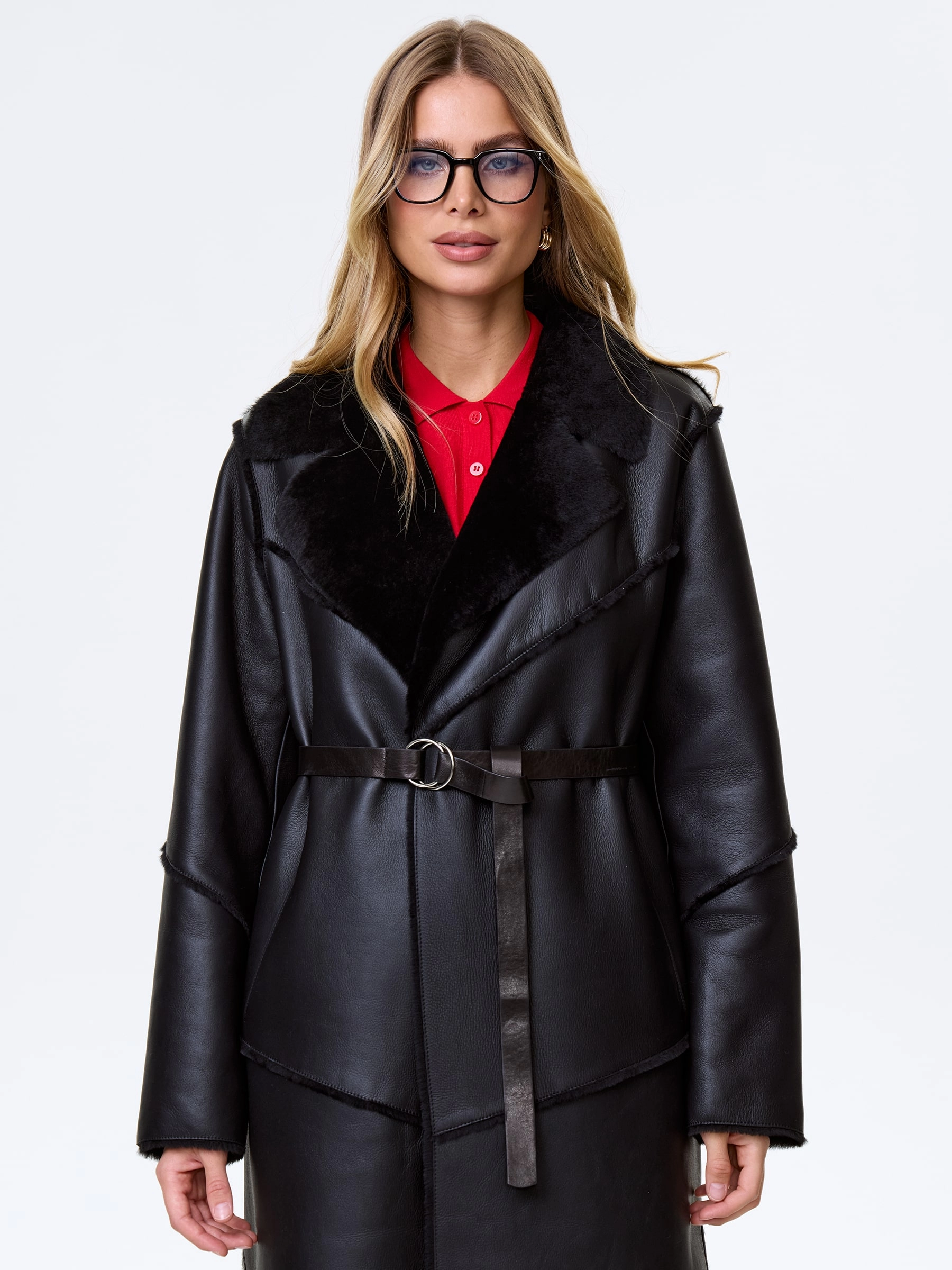 Длинную классическую дубленку с вывернутыми наружу швами выполнили из бережно выделанной овчины в черном цвете. Изделие получилась максимально теплым и легким. Прямой крой, английский воротник, два врезных боковых кармана. Застежка фиксируется кожаным поясом. Отсутствие декора, позволяет делать модель универсальной и всегда востребованной.