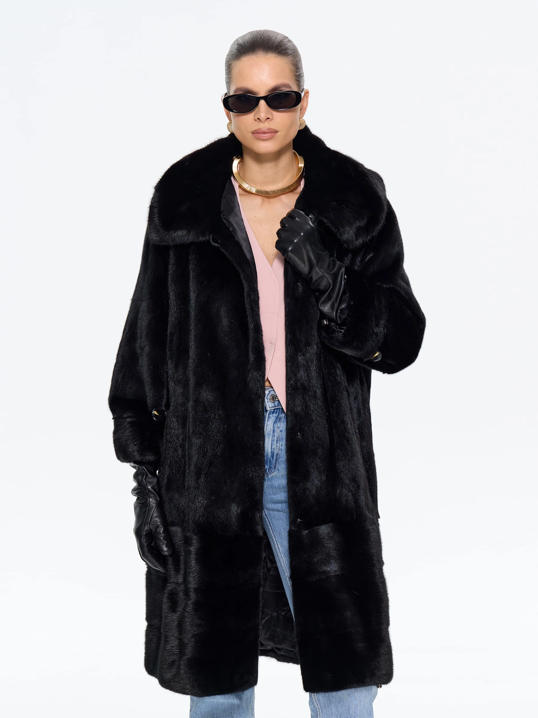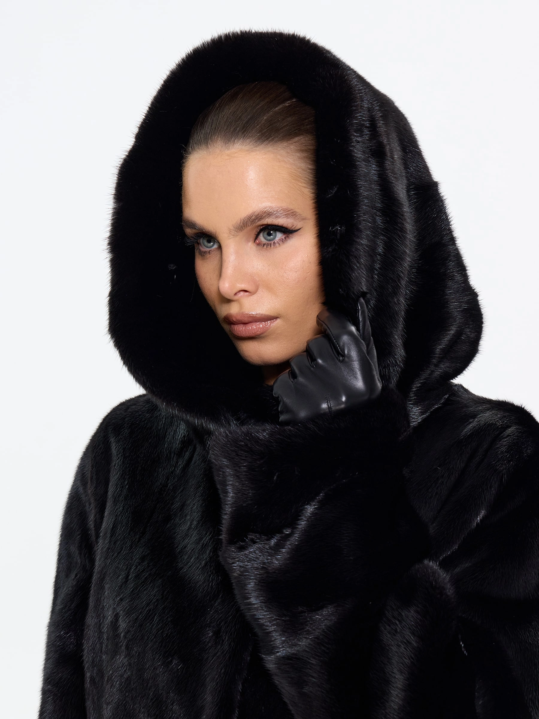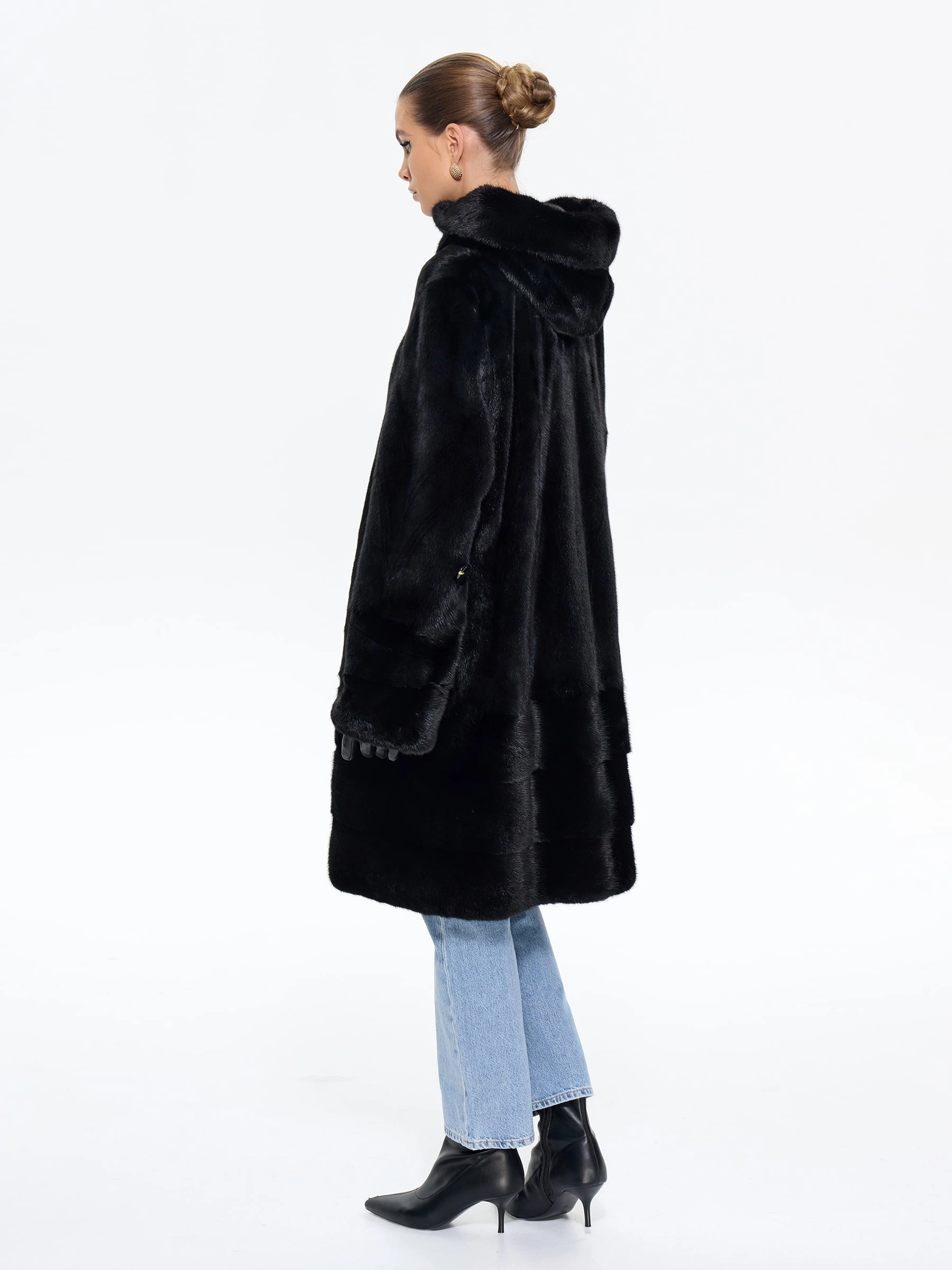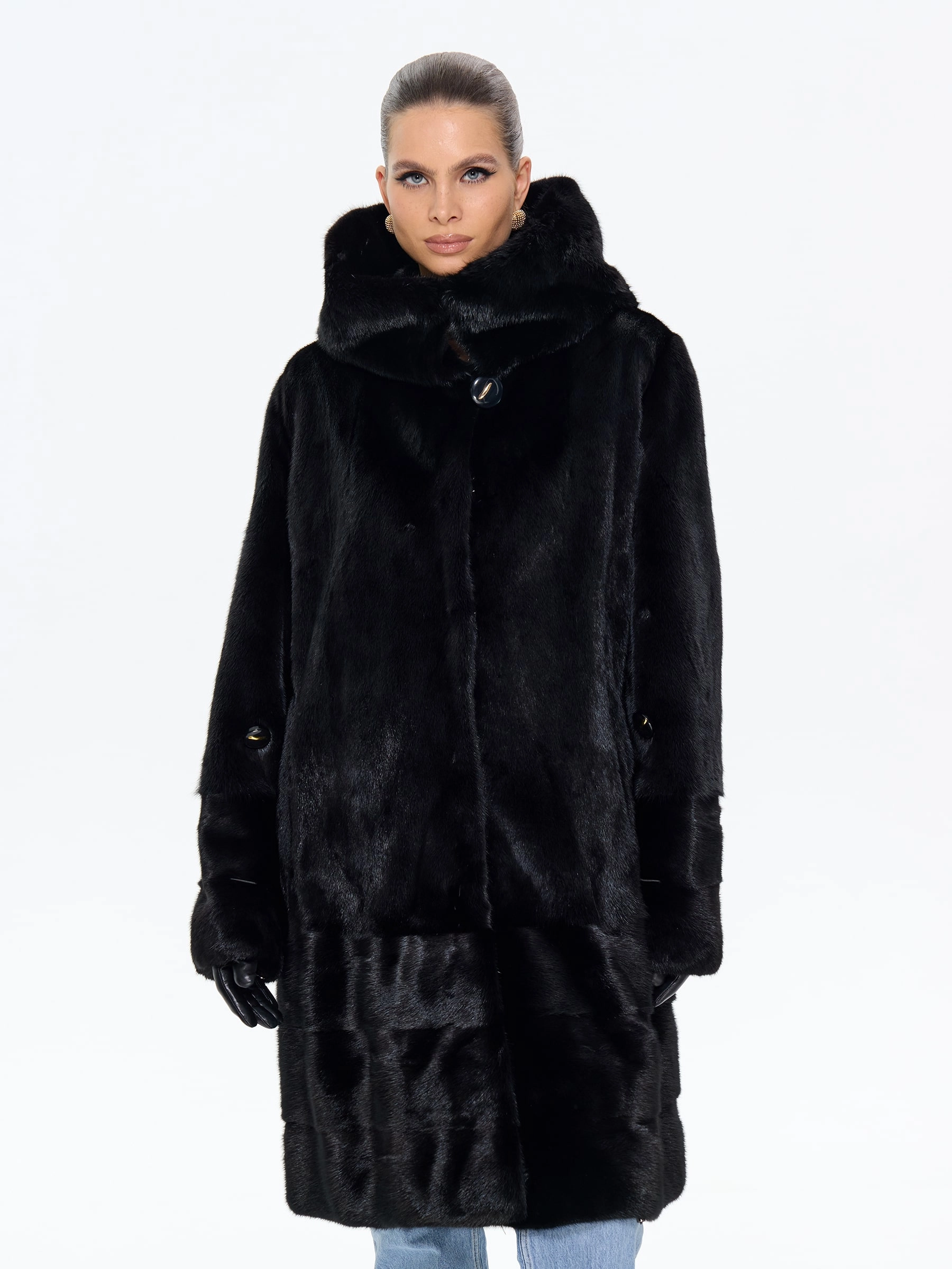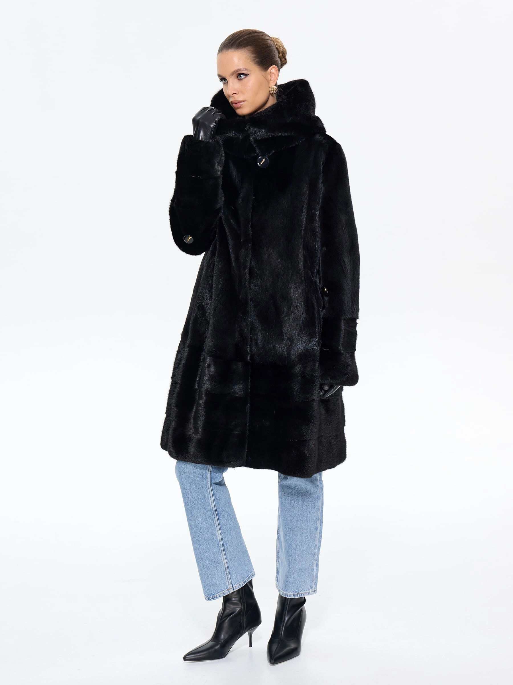 Роскошная шуба из черной норки премиум-класса с глубоким капюшоном и элегантным прямым силуэтом. Модель длиной 100 см отличается изысканной деталью — поперечной выкладкой меха по низу изделия, а также практичными втачными рукавами с регулируемой длиной. Стилисты рекомендуют носить эту утепленную шубу с джинсами, грубыми ботинками и объемным свитером для повседневного образа или с кожаными брюками и каблуками для вечернего выхода — ее универсальность и вневременная элегантность обеспечат вам безупречный вид в любую погоду.