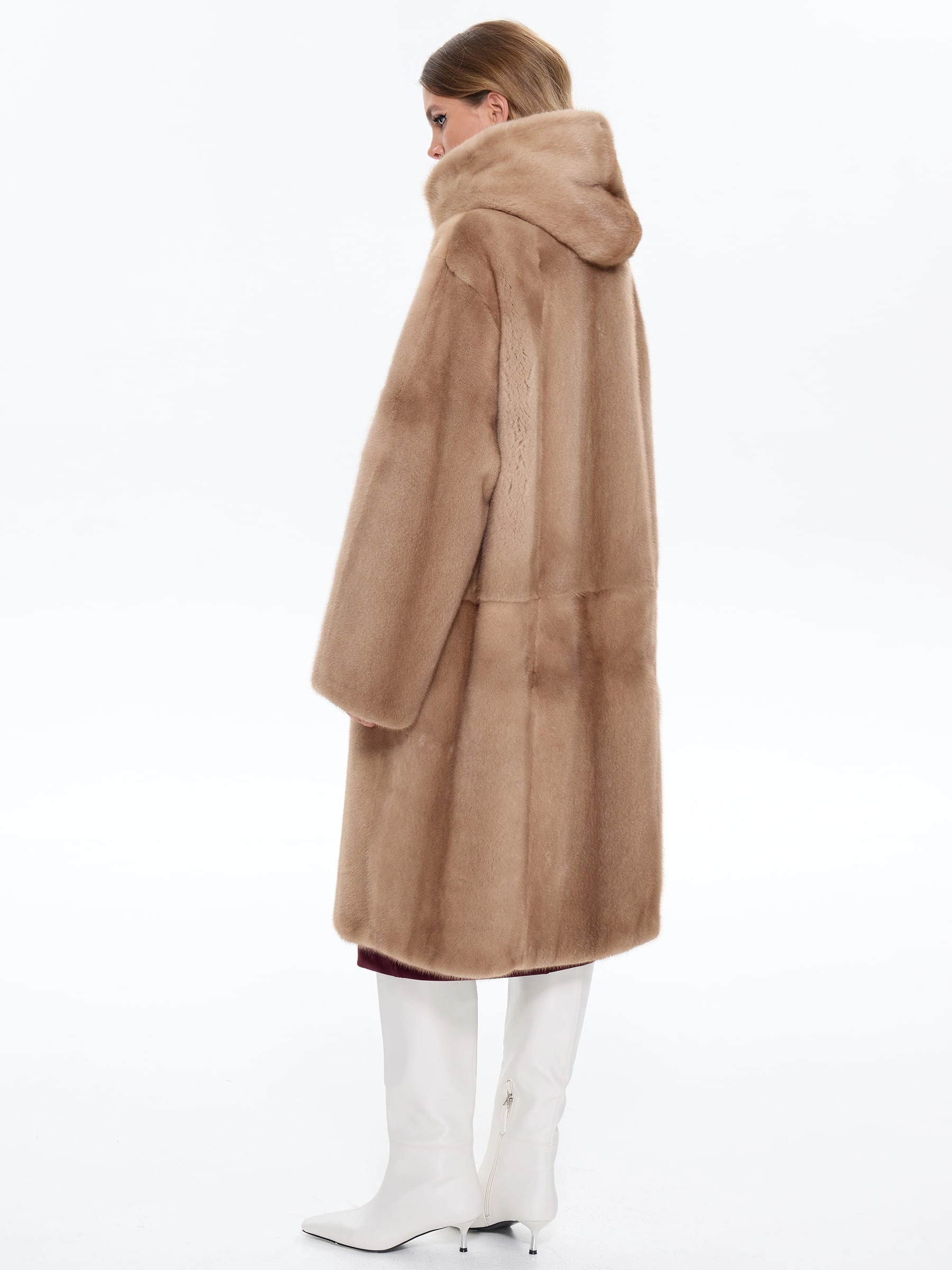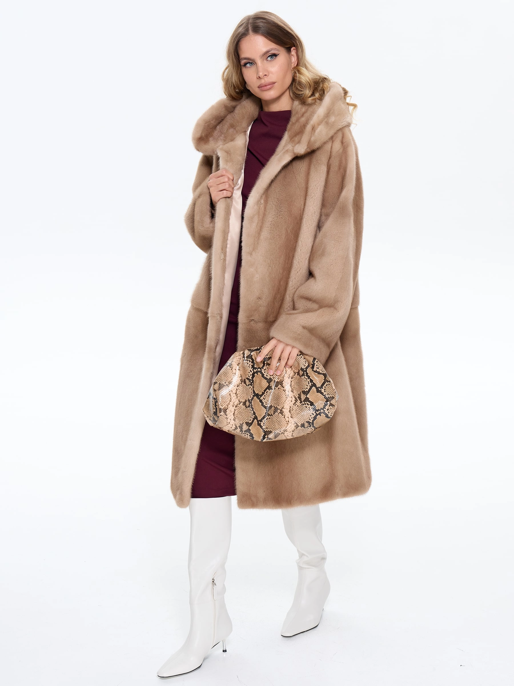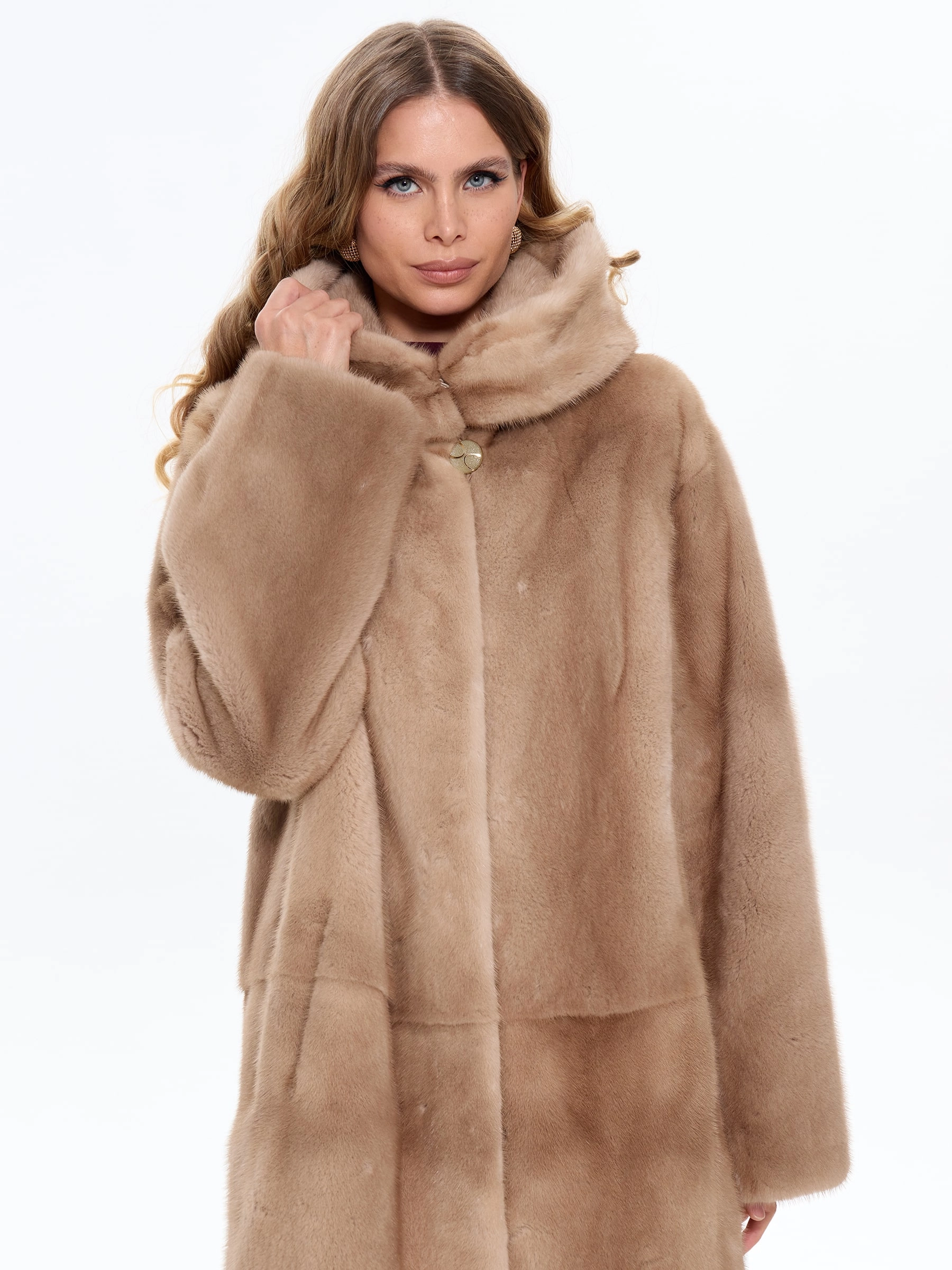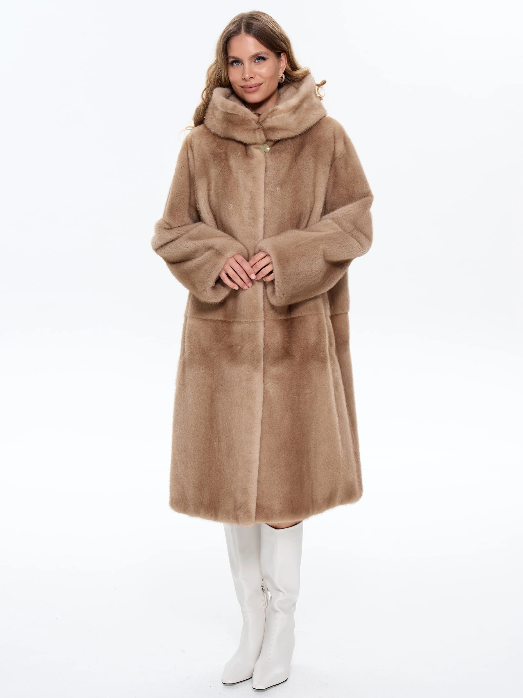 Элегантная длинная шуба из шелковистого меха норки с капюшоном пастельного оттенка модели «Жанет» создает образ утонченной роскоши. А-образный силуэт и объемный капюшон не только обеспечивают комфорт и защиту от непогоды, но и подчеркивают безупречный вкус своей обладательницы. Рекомендация стилиста: эту модель можно носить с облегающими брюками и высокими сапогами для создания элегантного повседневного образа или сочетать с платьем-миди и замшевыми ботильонами для особого случая. Идеальное сочетание королевской элегантности и современного комфорта.