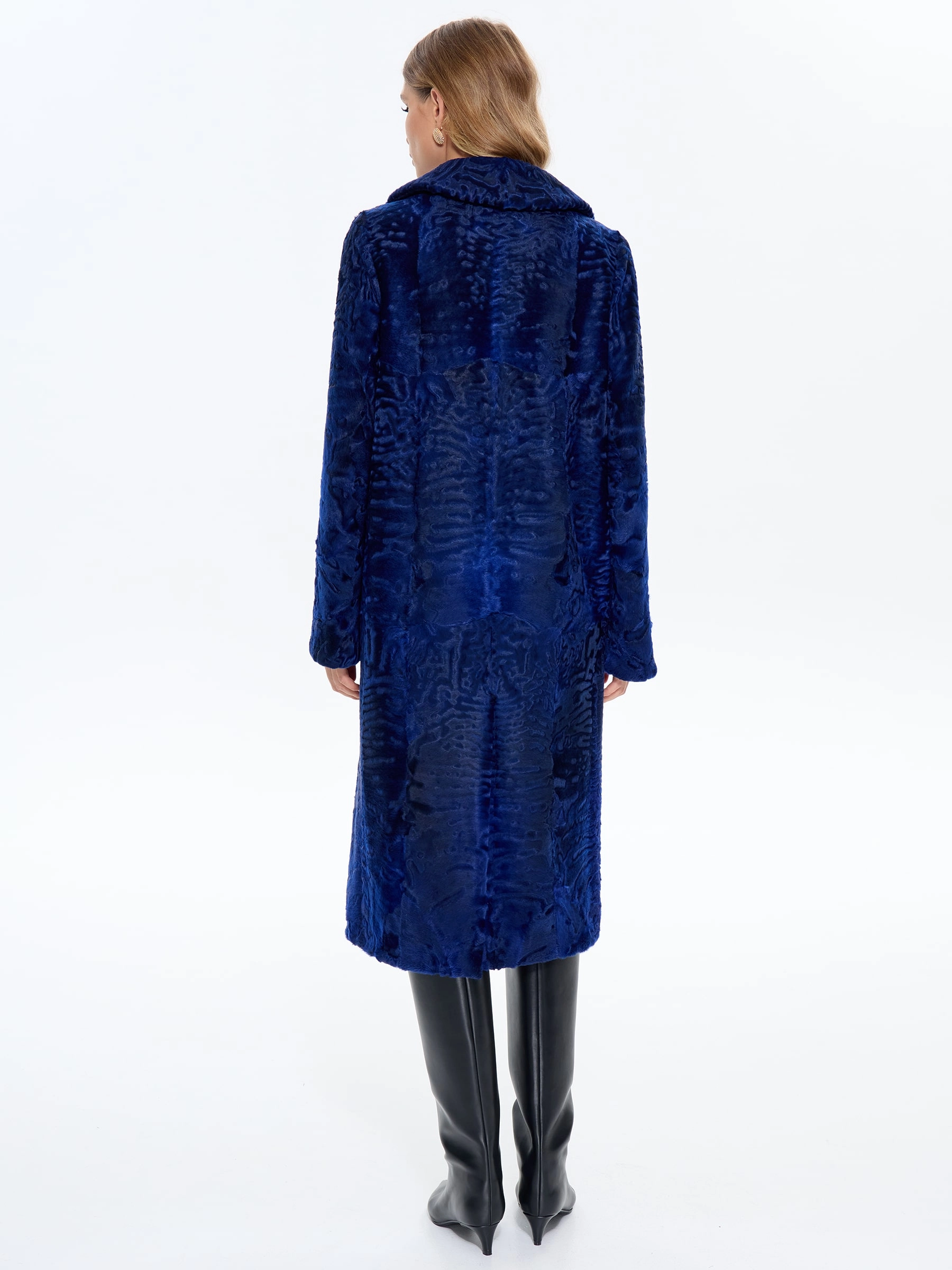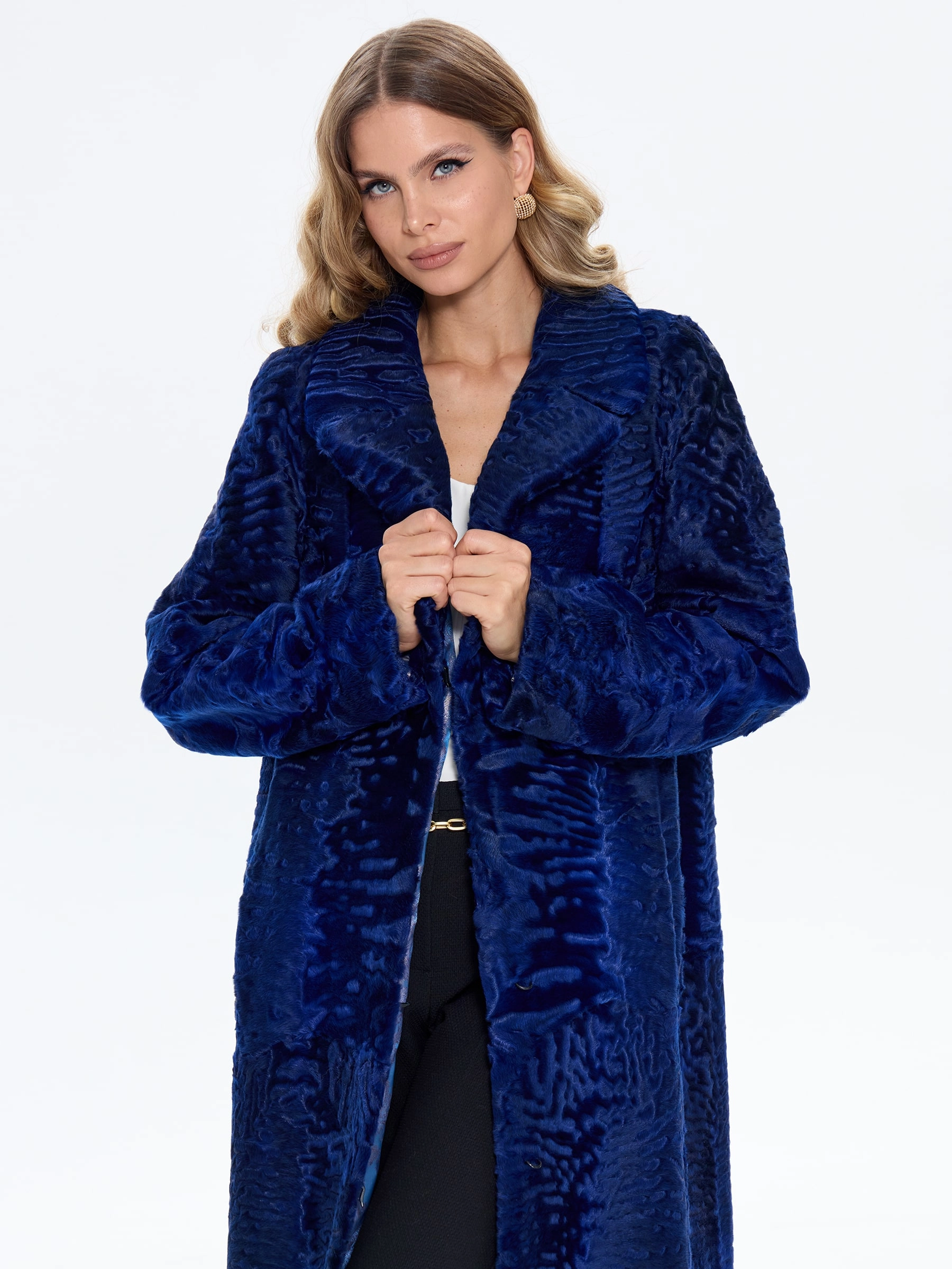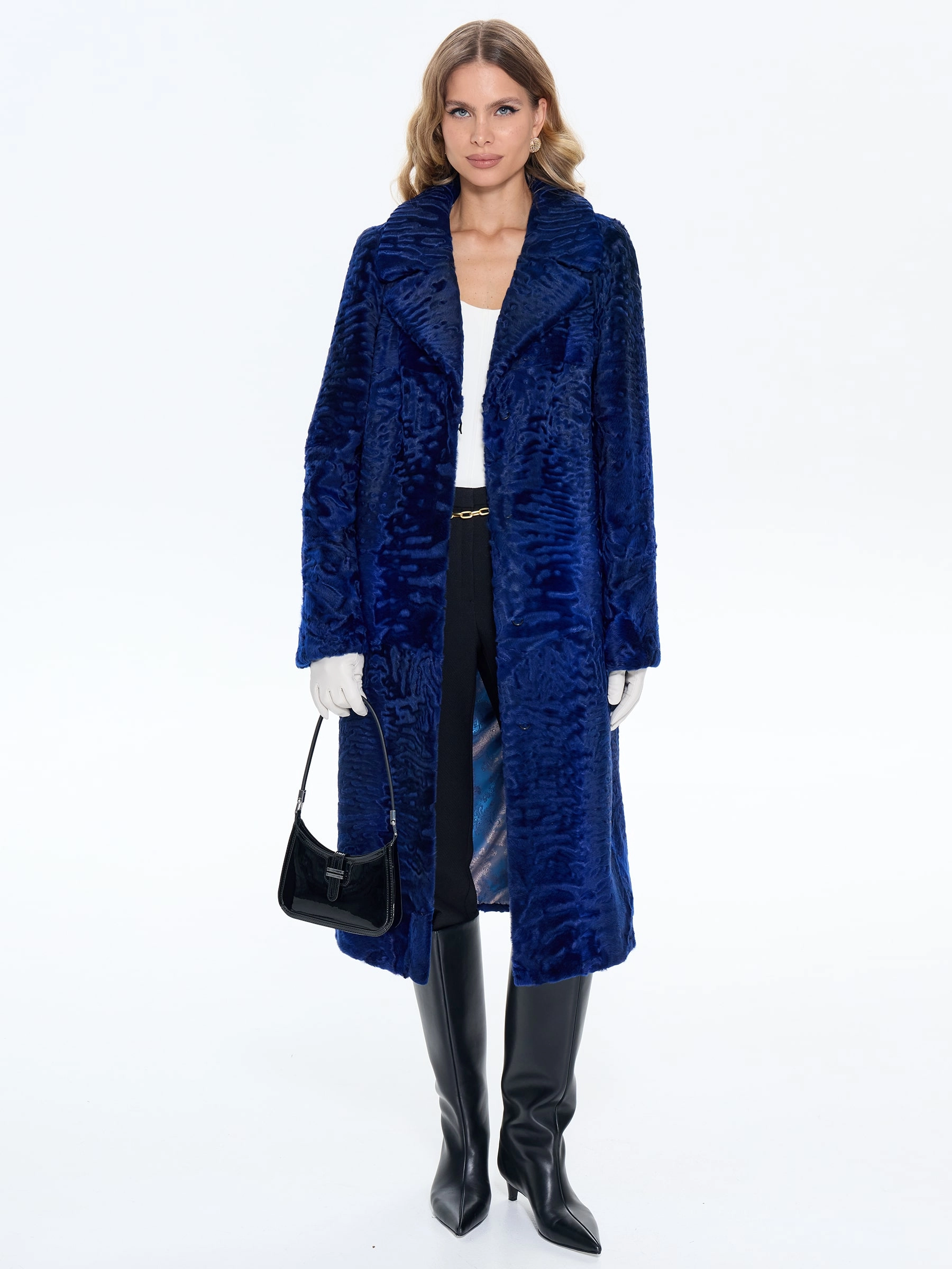 Элегантная длинная шуба из шелковистого меха каракульчи с английским воротником модели «Алиса» в насыщенном синем цвете. Прямой силуэт с удлиненной шлицей сзади и уникальный муаровый рисунок меха создают образ утонченной роскоши, обеспечивая одновременно свободу движения и безупречный вид. Рекомендация стилиста: сочетайте эту модель с облегающими брюками-дудочками и туфлями-лодочками для дневного выхода или с платьем-футляром и клатчем для вечернего мероприятия. Идеальный выбор для ценительниц классического шика и благородной элегантности.