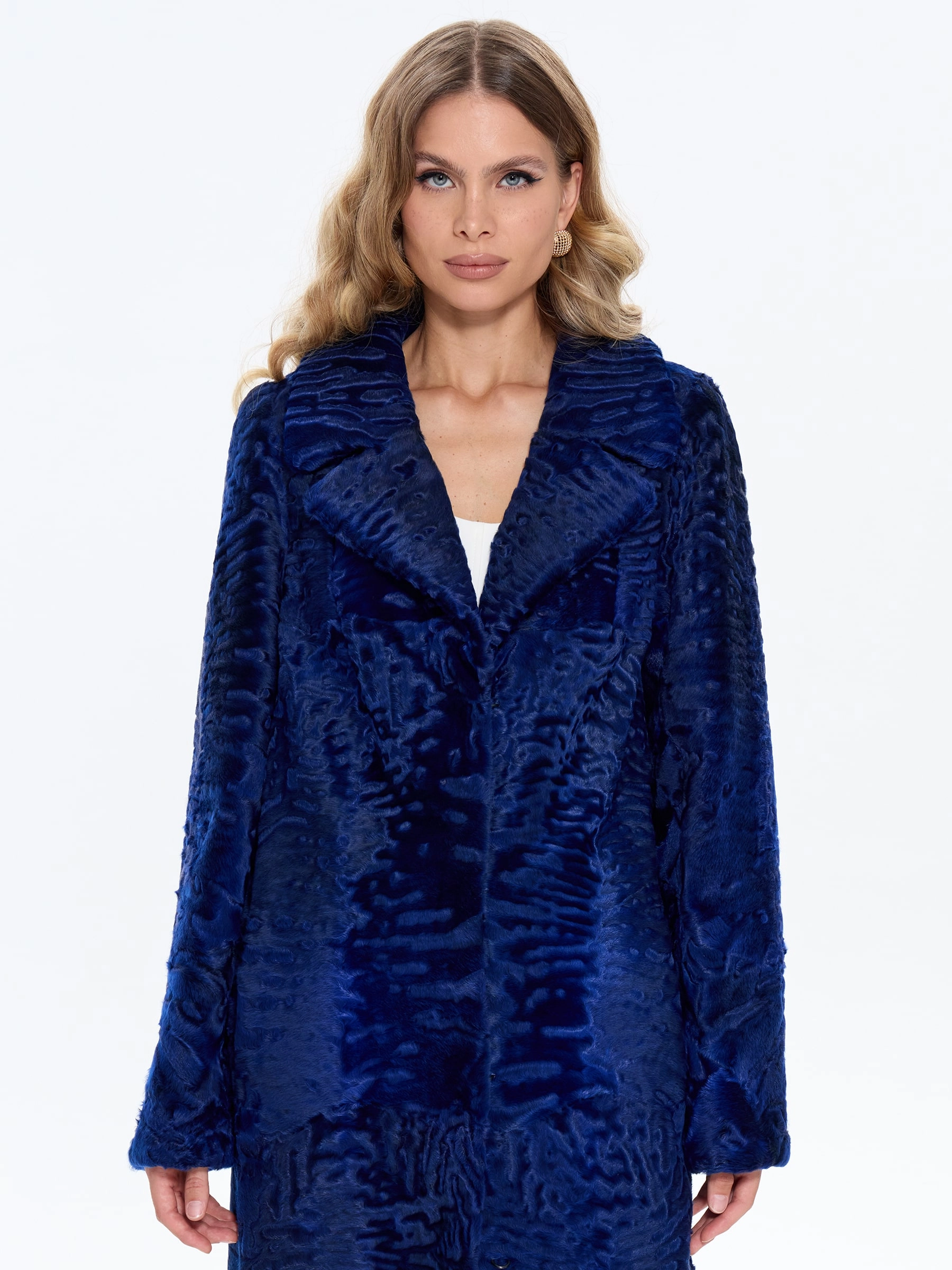 Товар длинная синяя каракулевая женская шуба алиса, размер 48, артикул 65190 выполнен из мех каракульчи с застежкой клипсы. Рассчитан на сезон: весна-осень. Длина изделия 110 см, силуэт прямой.