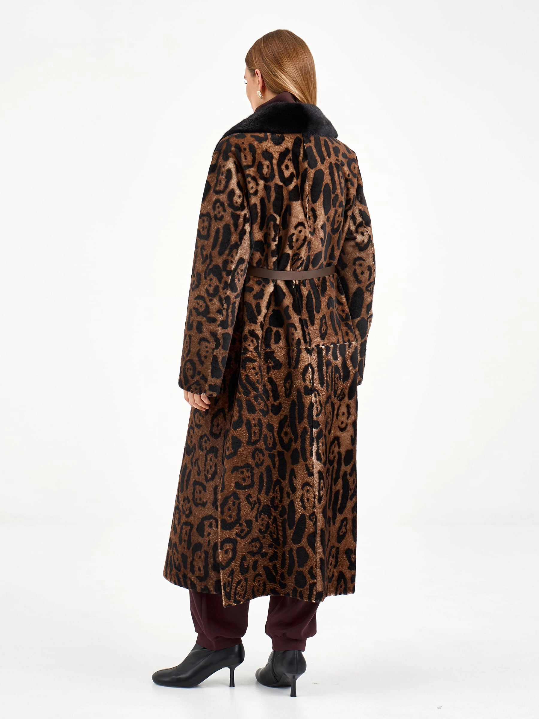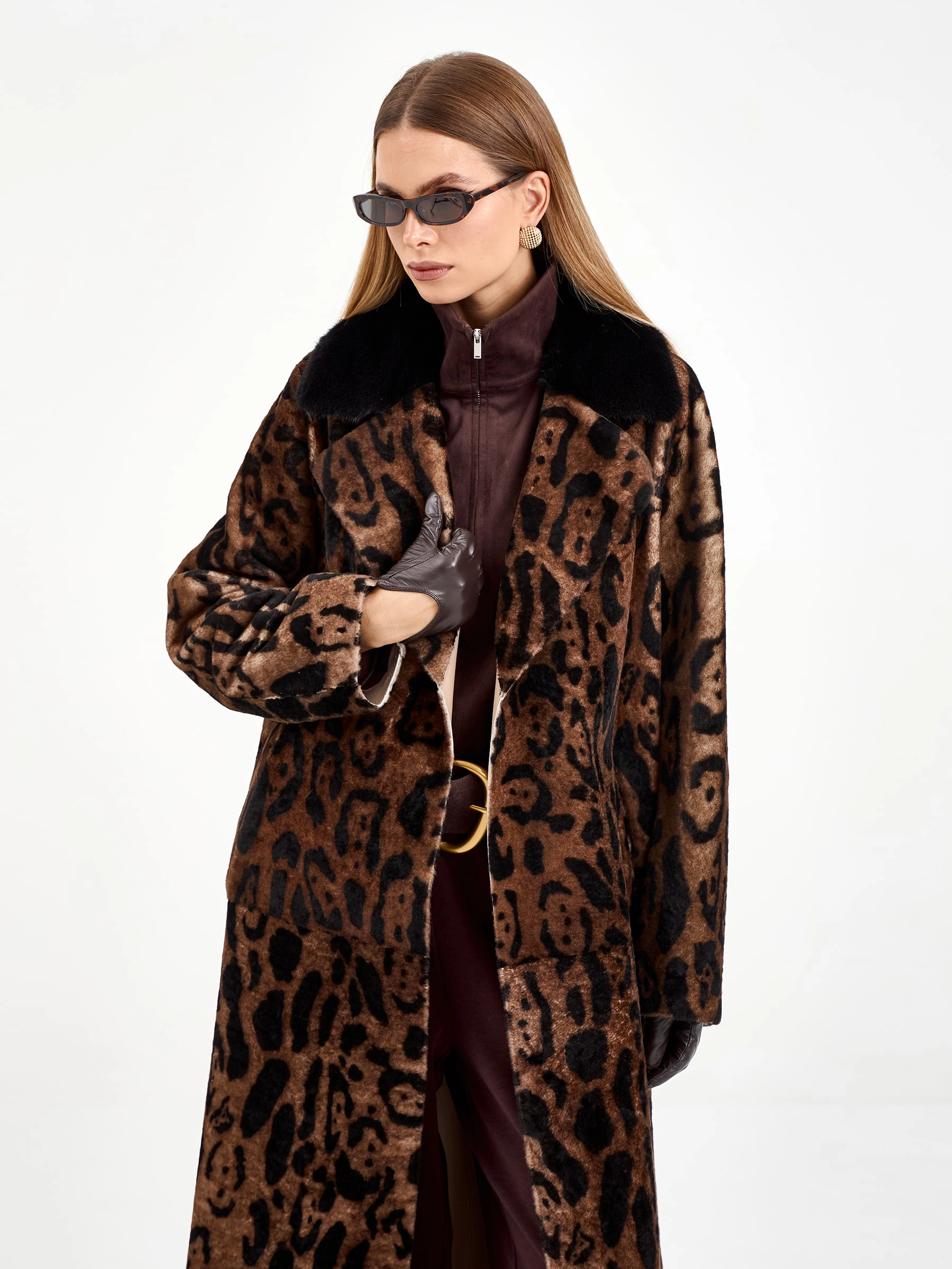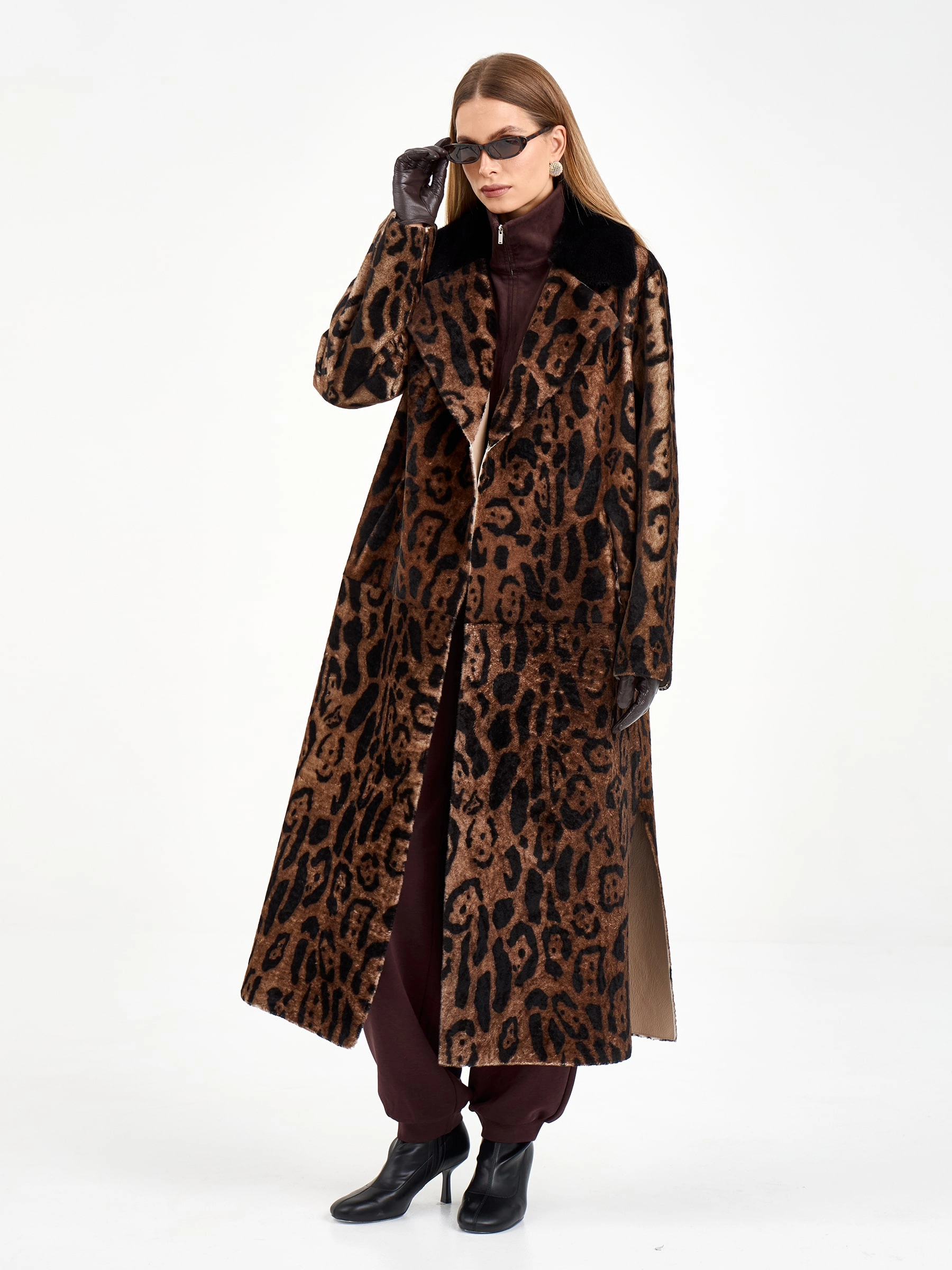 Длинная дубленка из натуральной овчины с леопардовым принтом и роскошным воротником из норки — это воплощение элегантности и комфорта. Свободный силуэт и спущенный рукав создают непринужденный образ, который легко дополнить поясом для акцента на талии. Стилисты рекомендуют носить эту модель с однотонными базовыми вещами — например, с черными брюками-клеш и водолазкой, чтобы позволить принту и текстуре норки стать главным акцентом образа.