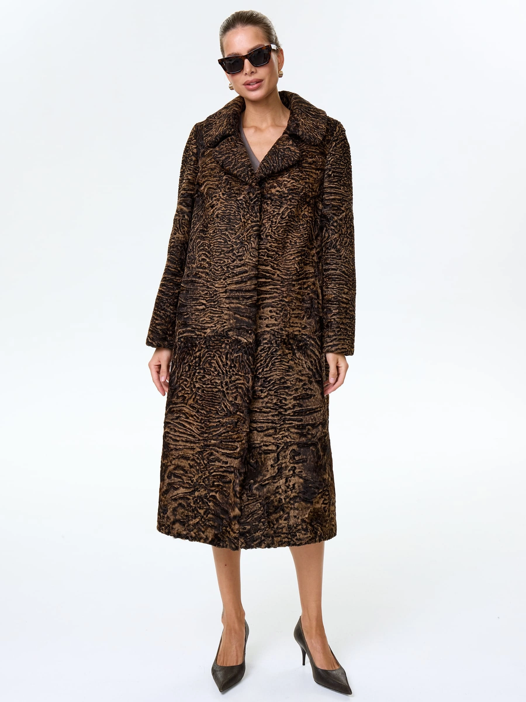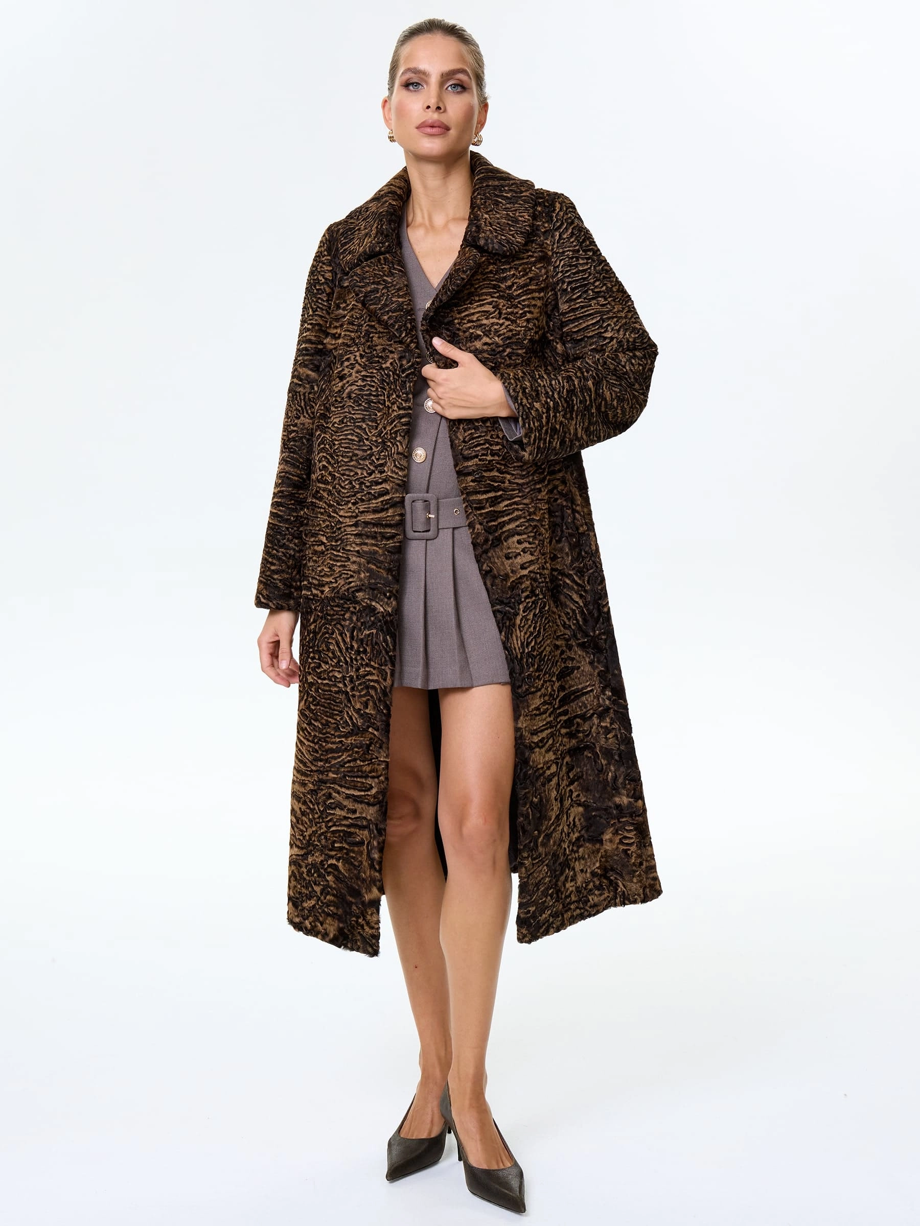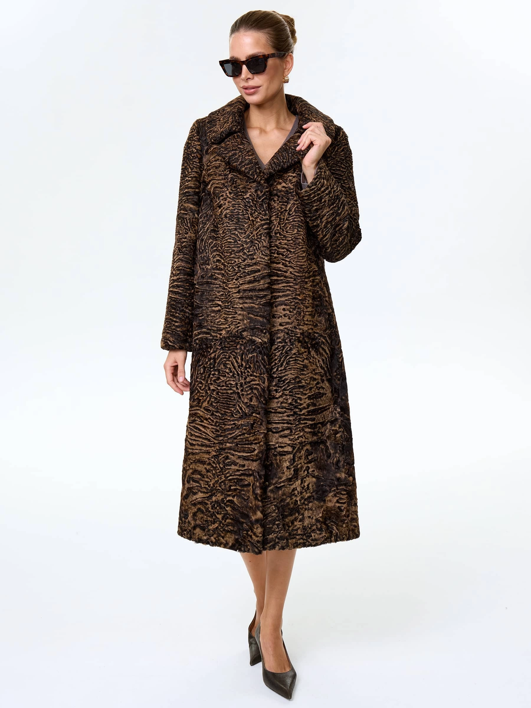 Афганская каракульча темно-коричневого цвета. Английский воротник. Аккуратная работа портных. Чёткая посадка по фигуре. Премиальное качество.