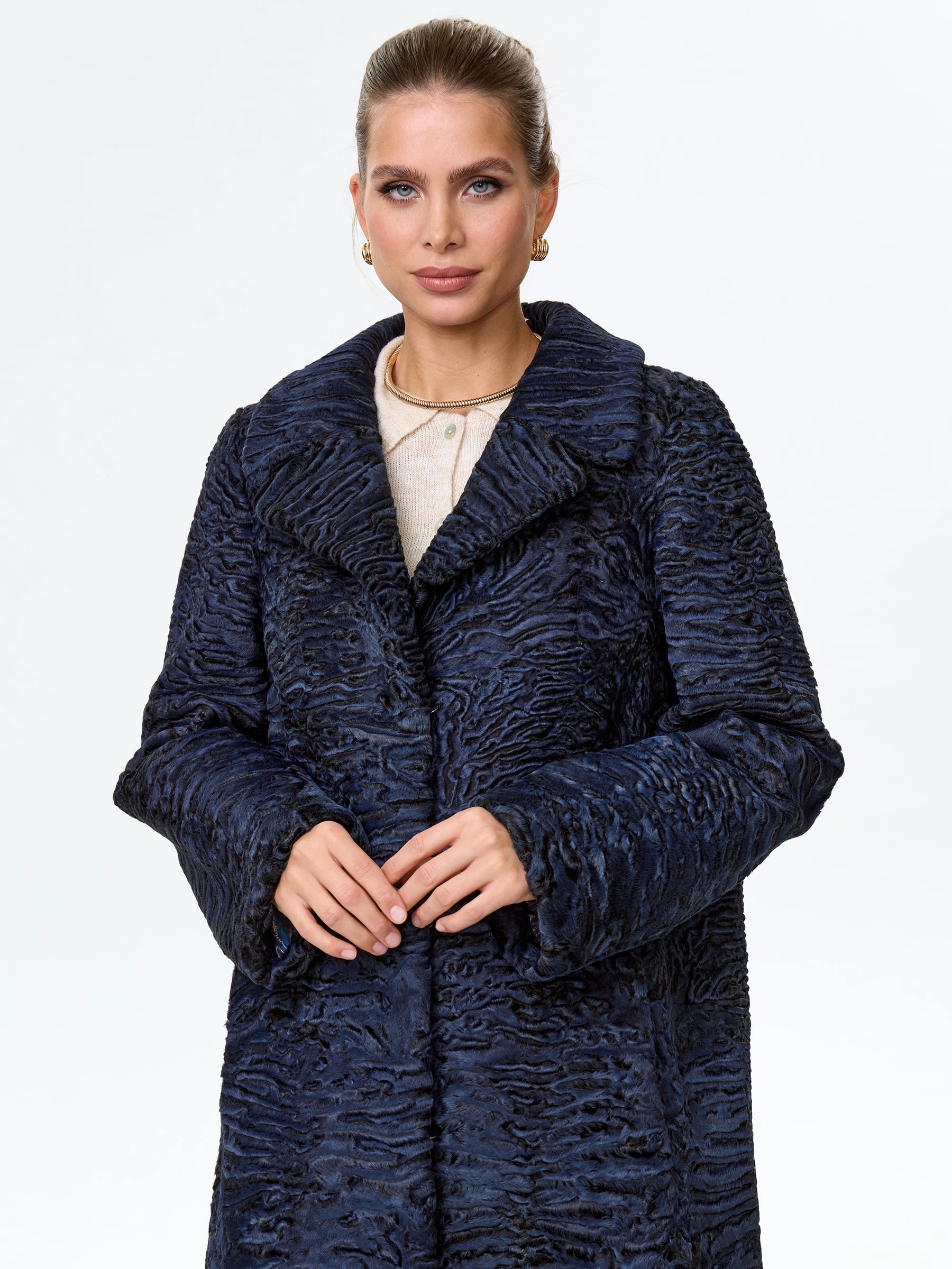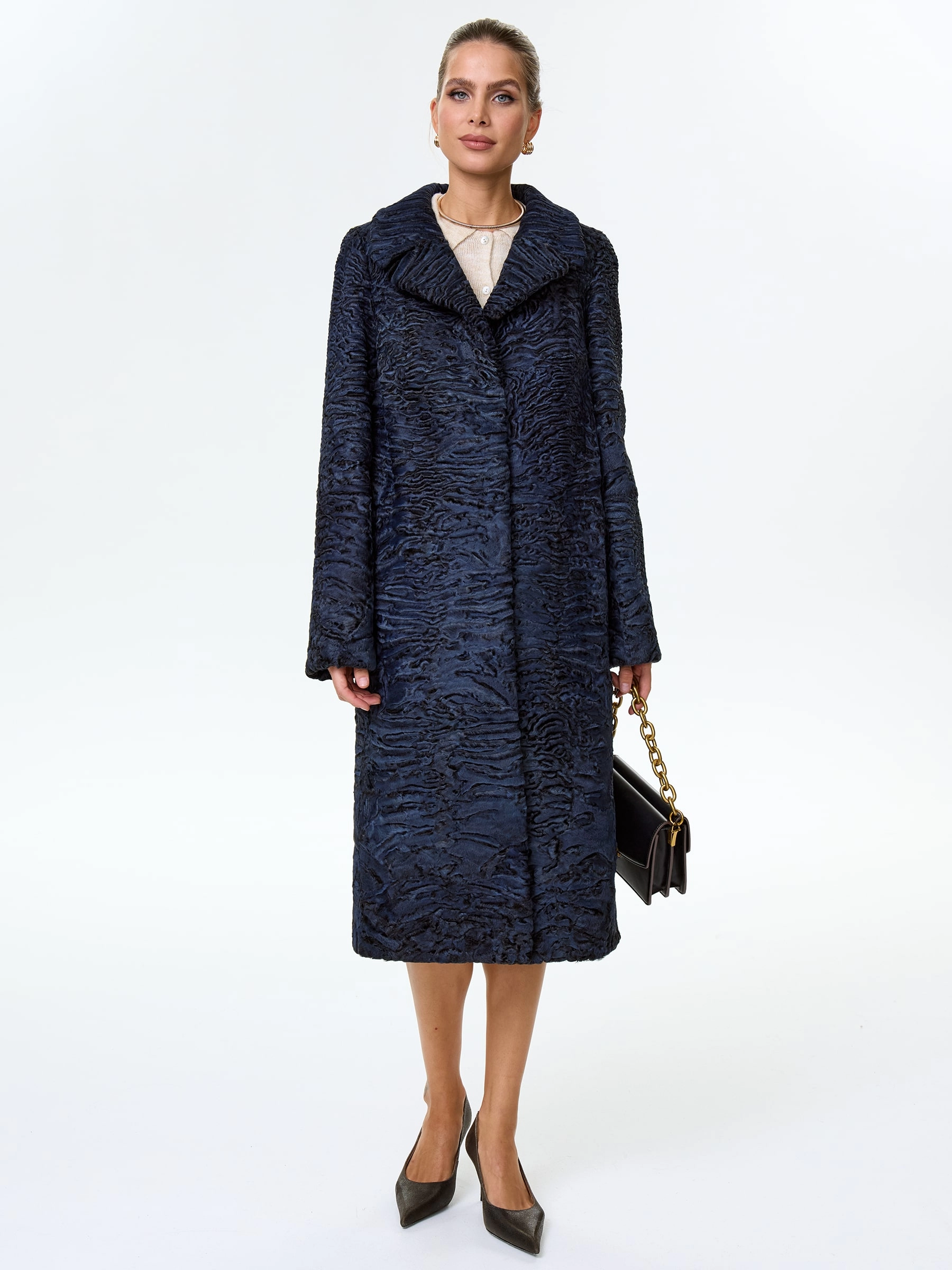 Товар длинное пальто из меха каракульчи для женщин премиум класса лола(ав), синее, размер 48, артикул 33970 выполнен из каракульча с застежкой клипсы. Рассчитан на сезон: весна-осень. Длина изделия 114 см, силуэт прямой.