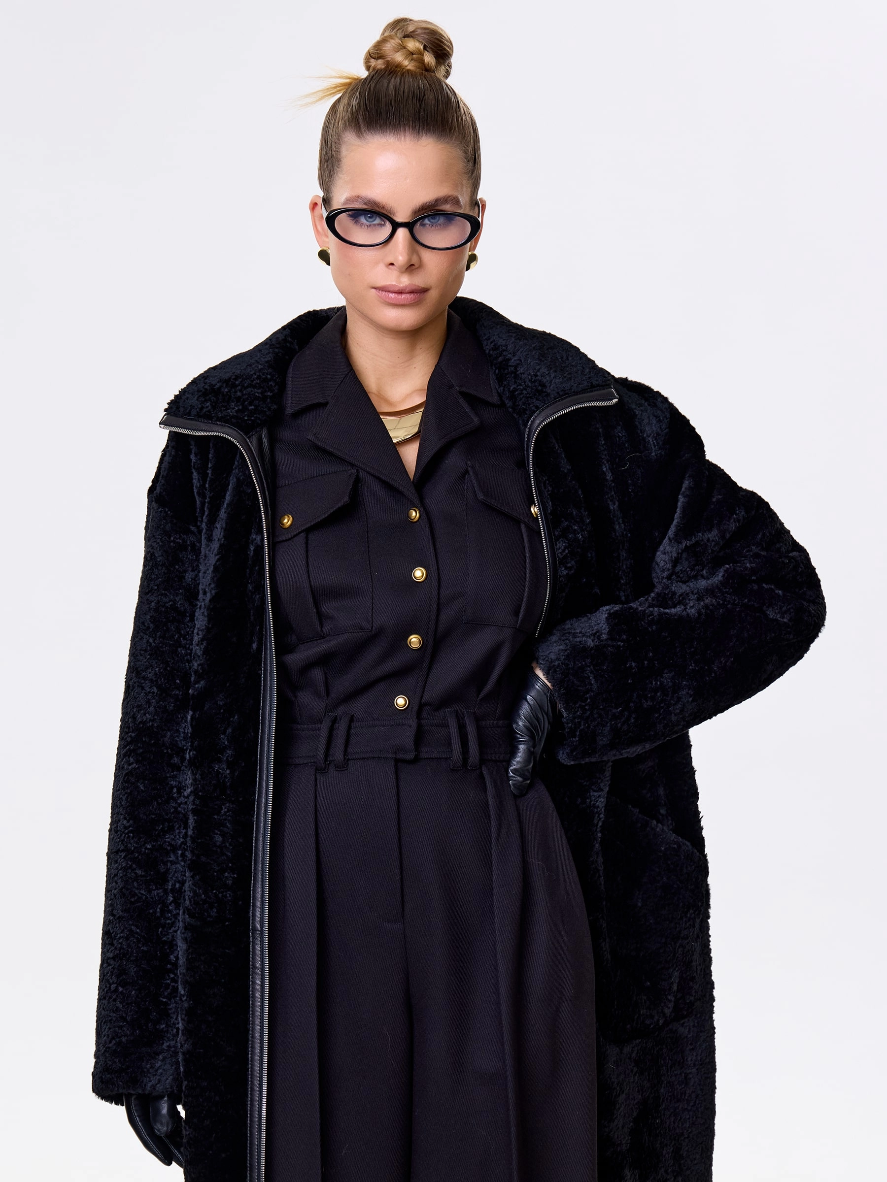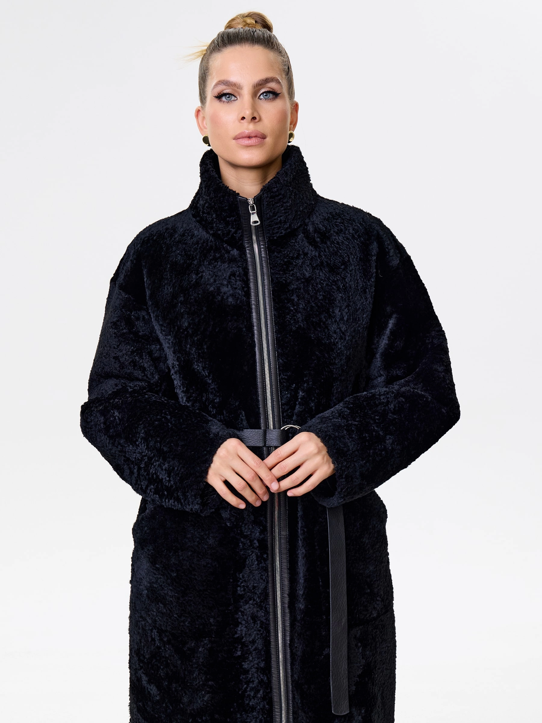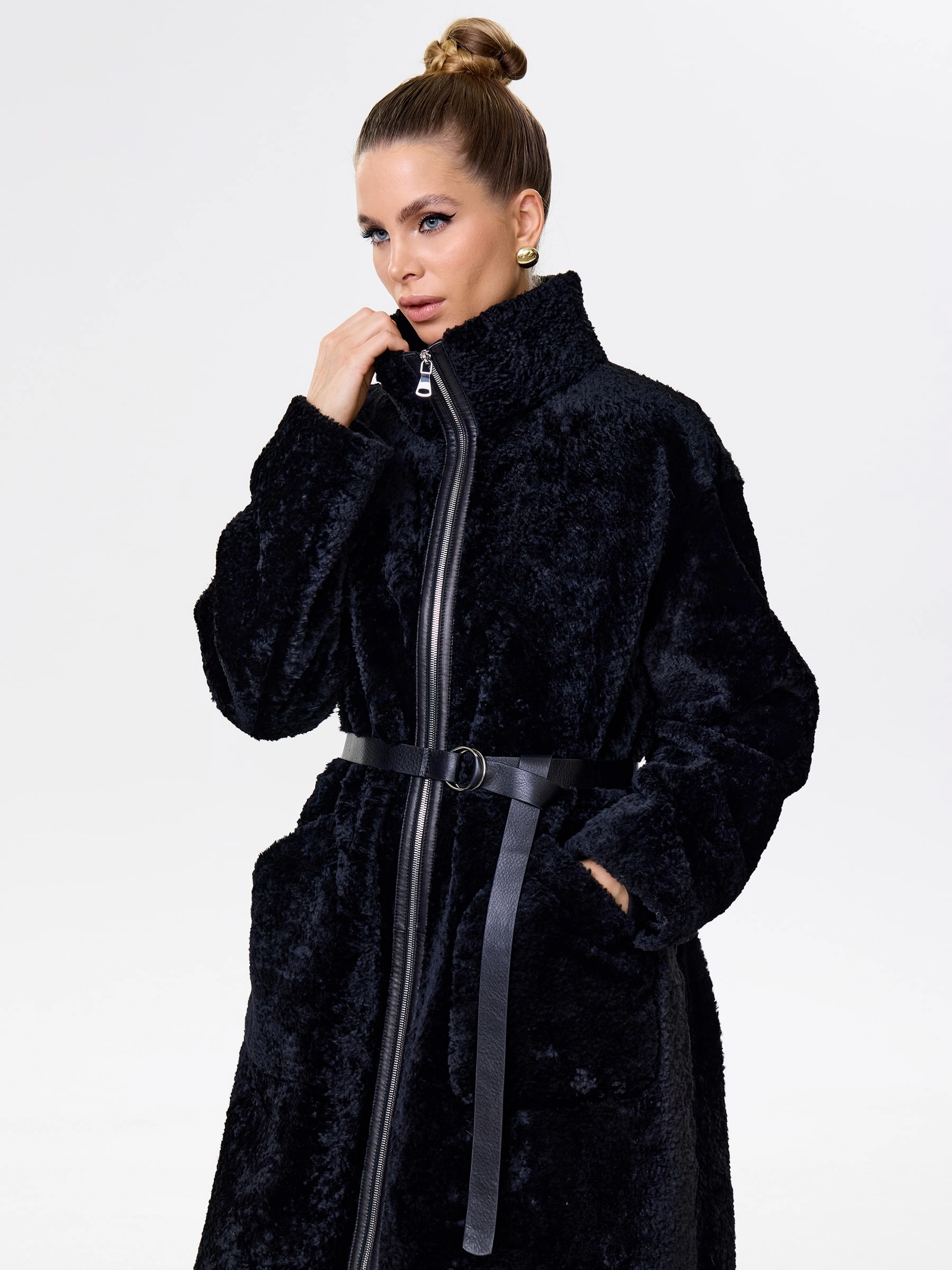 Длинное пальто выполнили из бархатистой мягкой овчины. Однотонную модель прямого кроя можно носить и гладкой и фактурной стороной наружу. Прямой крой, невысокий воротник-стойка, два боковых кармана. Застежка - молния. Декором к изделию послужил кожаный пояс с пряжкой.