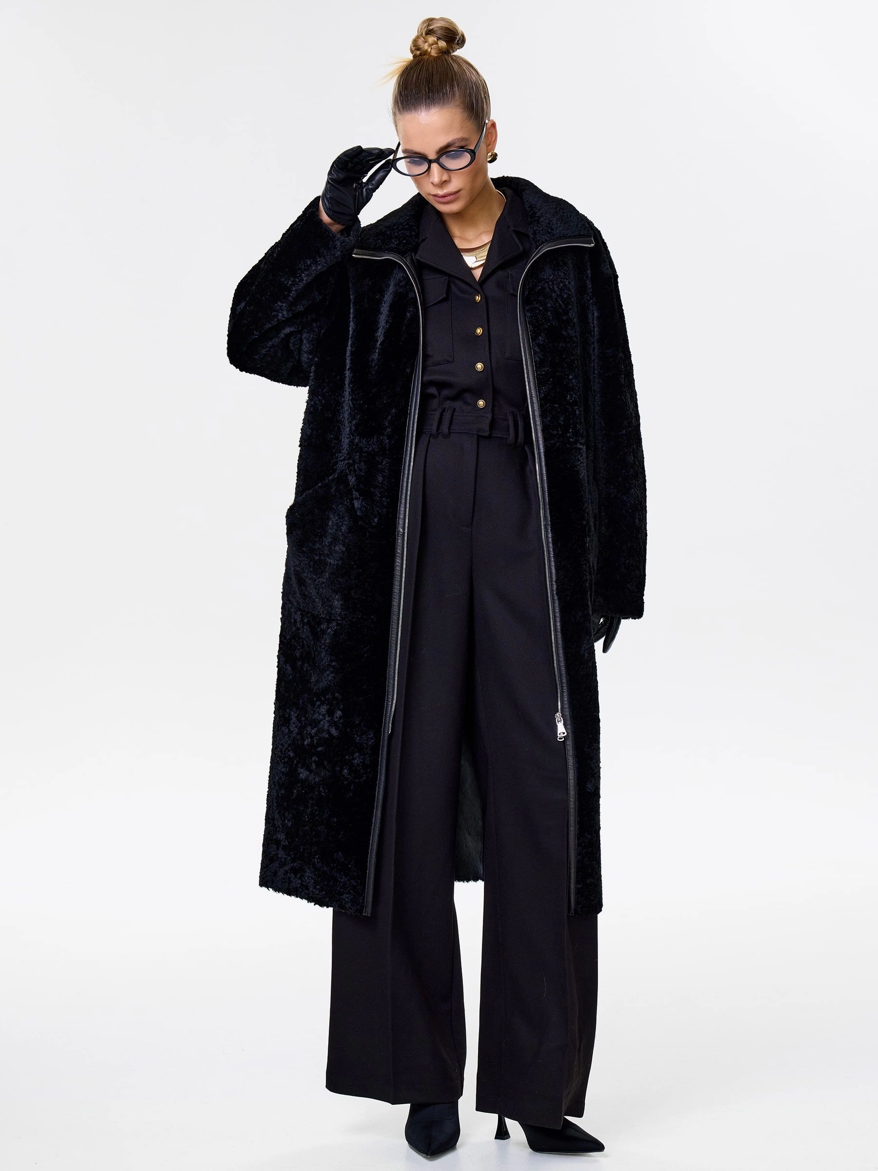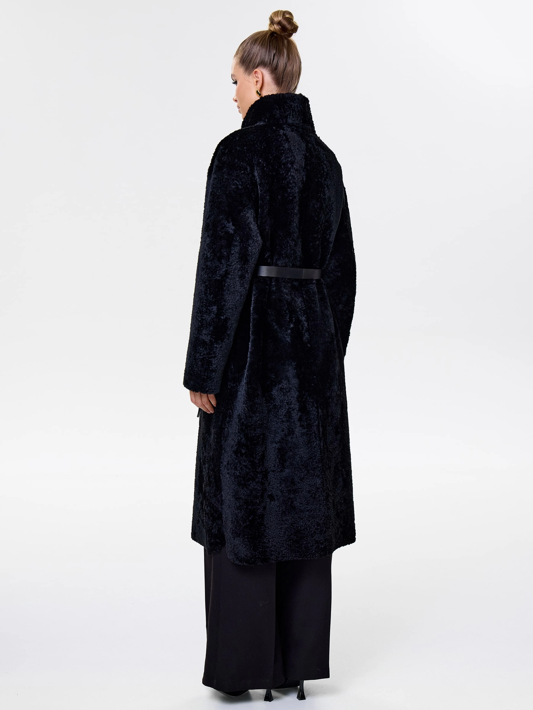 Товар длинное женское пальто из натуральной овчины астрагана премиум класса 2060, черное, размер 46, артикул 64320 выполнен из овчина "мерино" с застежкой молния. Рассчитан на сезон: осень-зима. Длина изделия 117 см, силуэт прямой.