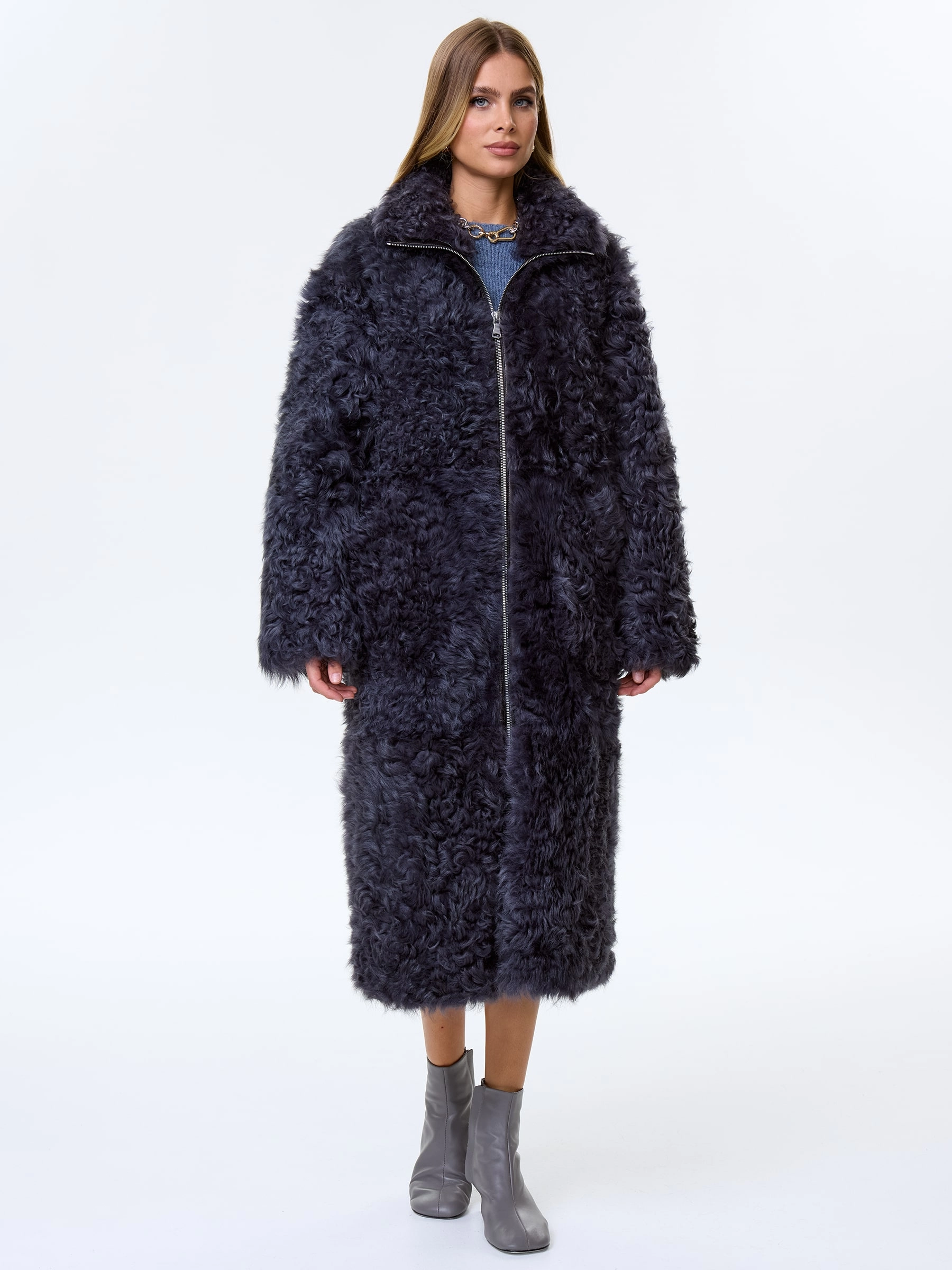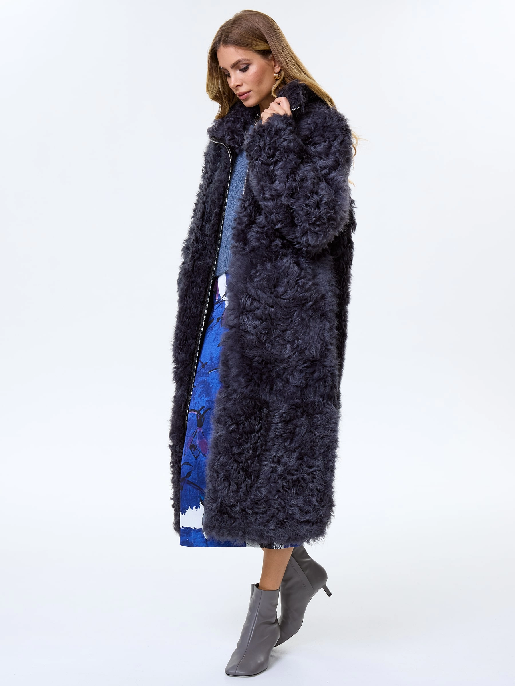 Длинное женское пальто из натуральной овчины тиградо премиум-класса глубокого темно-серого цвета — воплощение молодежного стиля и природной роскоши: модель выполнили из натуральной овчины калган (тиградо) с характерным мелкозавитковым фактурным ворсом снаружи и гладкой кожаной поверхностью внутри, создавая выразительный объем и благородную текстуру, а свободный молодежный крой длиной 117 см со спущенным плечом обеспечивает полный комфорт и не сковывает движений. Лаконичный воротник-стойка добавляет модели современного звучания, боковые карманы усиливают практичность, а пояс позволяет при желании изменить силуэт, подчеркнув линию талии; удобная застежка-молния и отсутствие подкладки сохраняют естественную структуру натурального меха, делая пальто теплым, но при этом легким. Совет стилиста: фактурная овчина тиградо и темно-серый оттенок задают образу благородную сдержанность — носите это пальто с монохромной базой в серой, черной или белой гамме, позволяя объемному ворсу быть главным акцентом, а пояс поможет до
