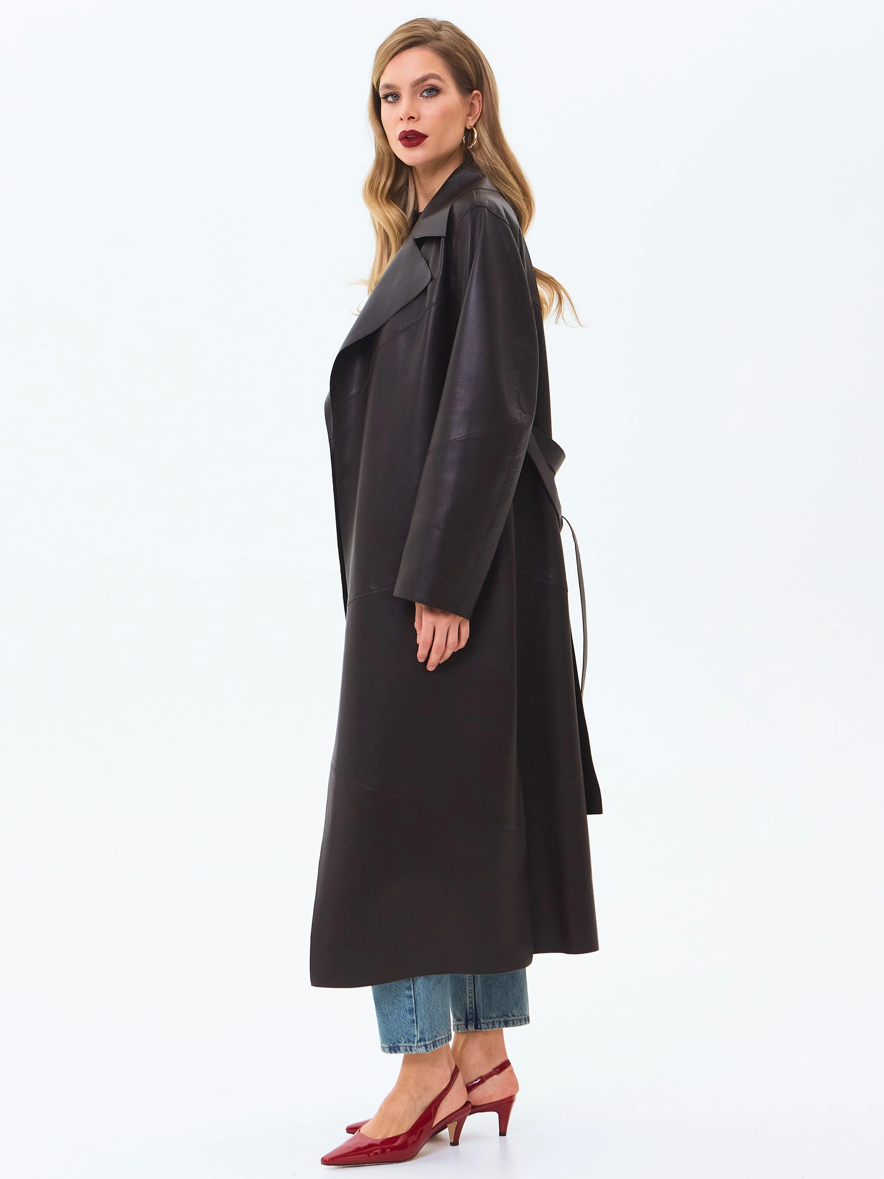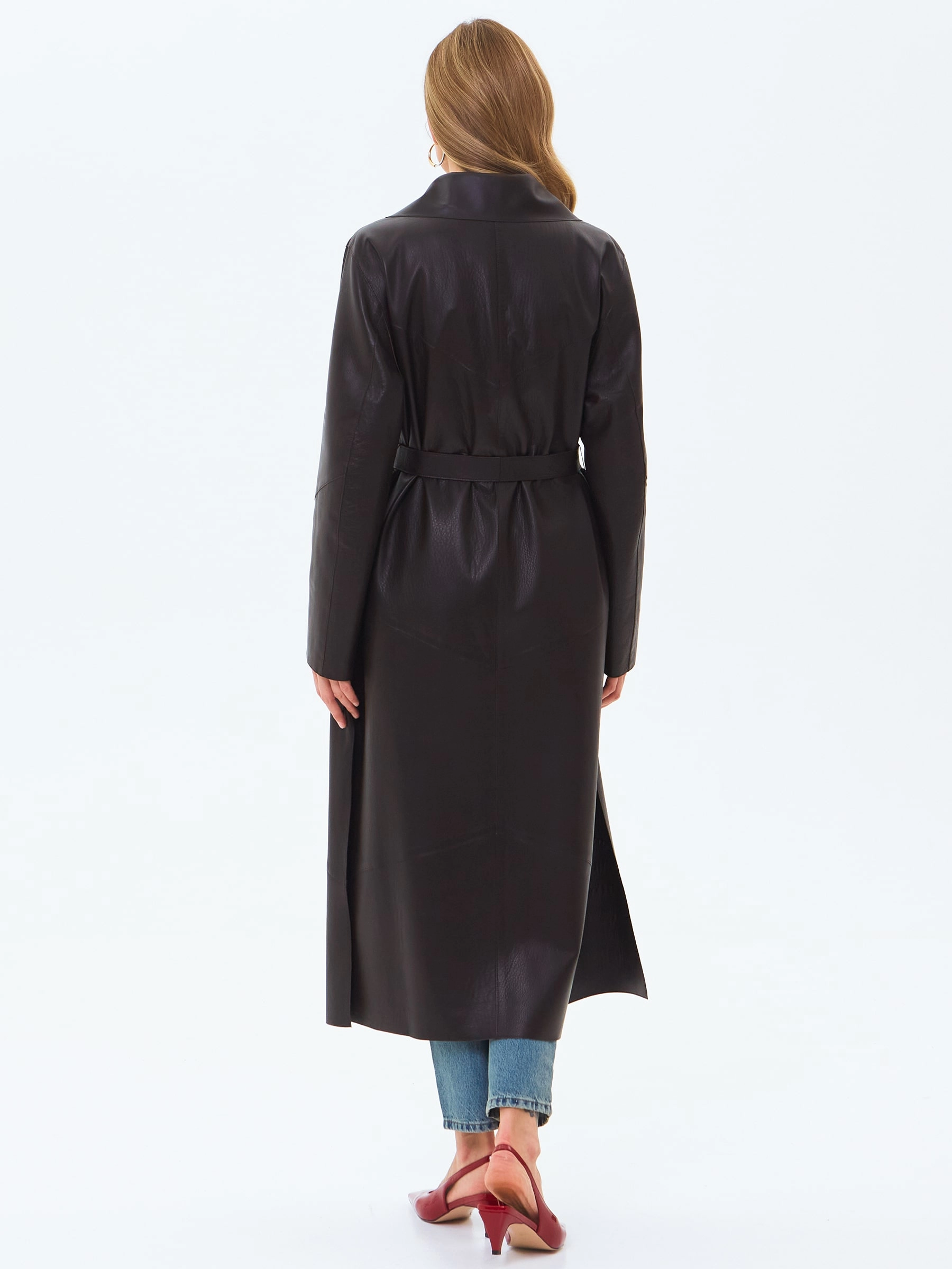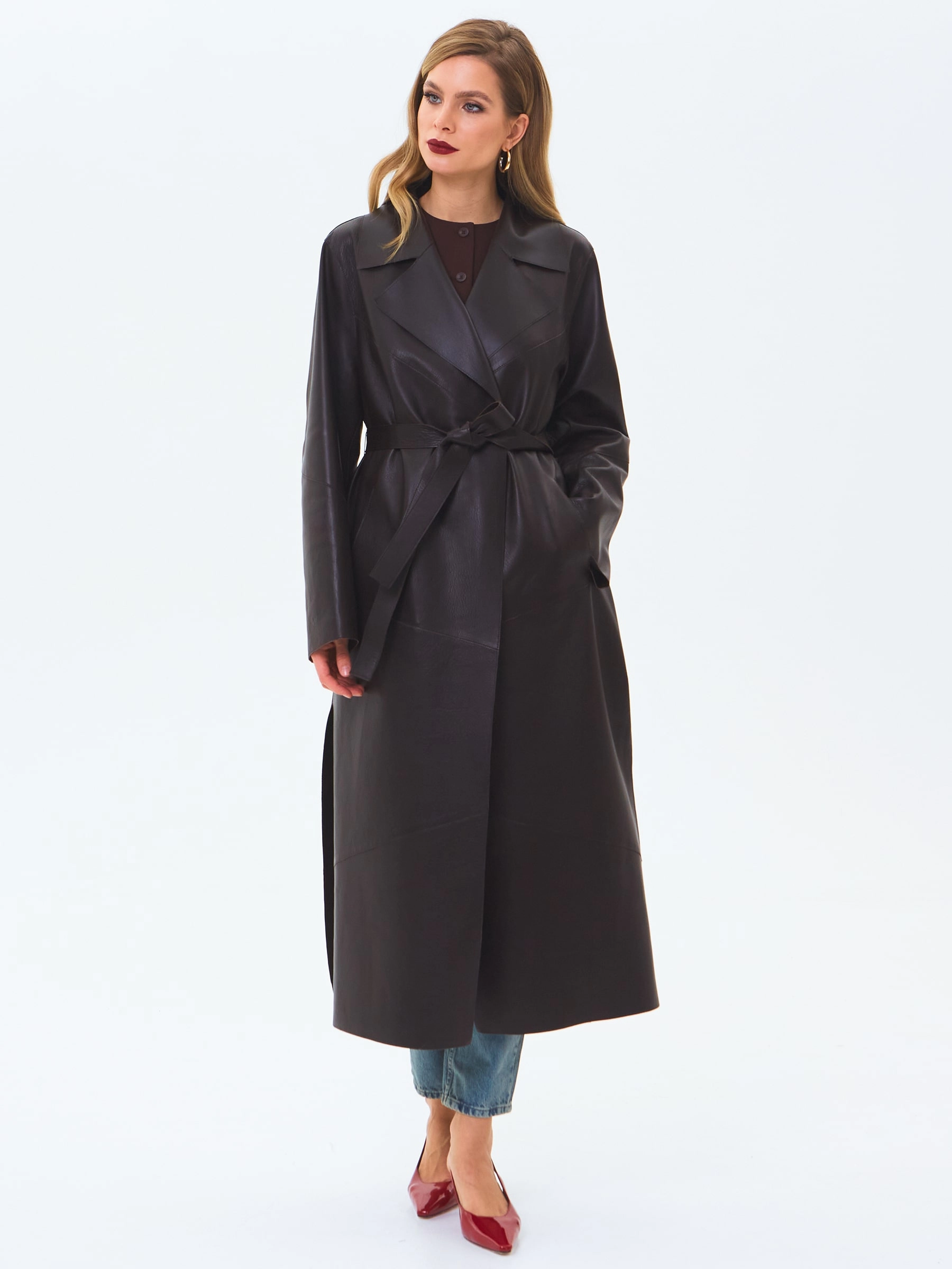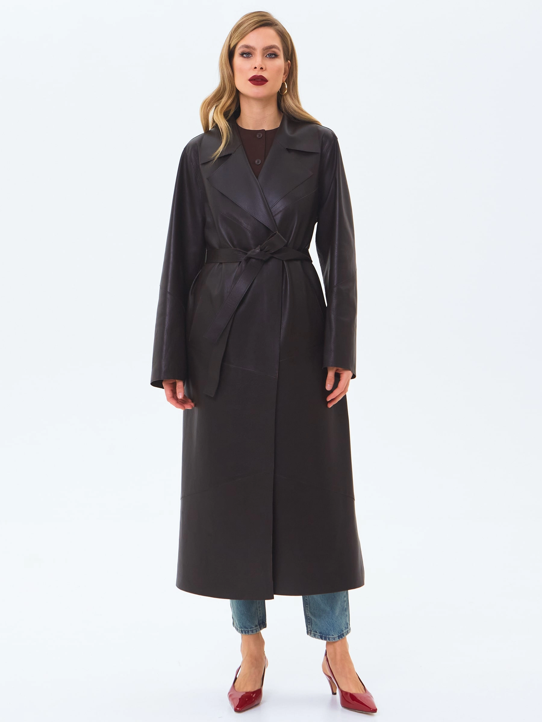 Длинный женский кожаный плащ премиум класса 3081, коричневый, размер 50, артикул 24660