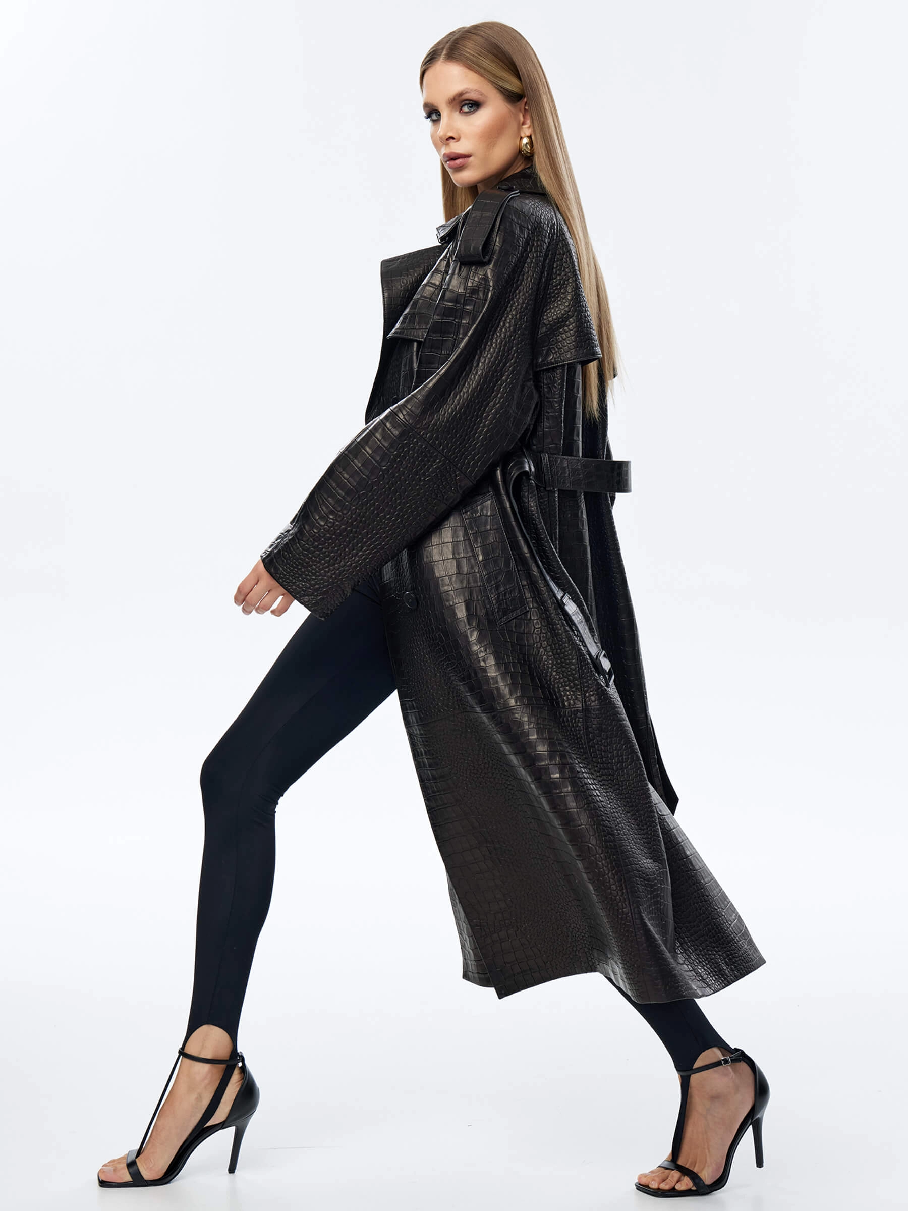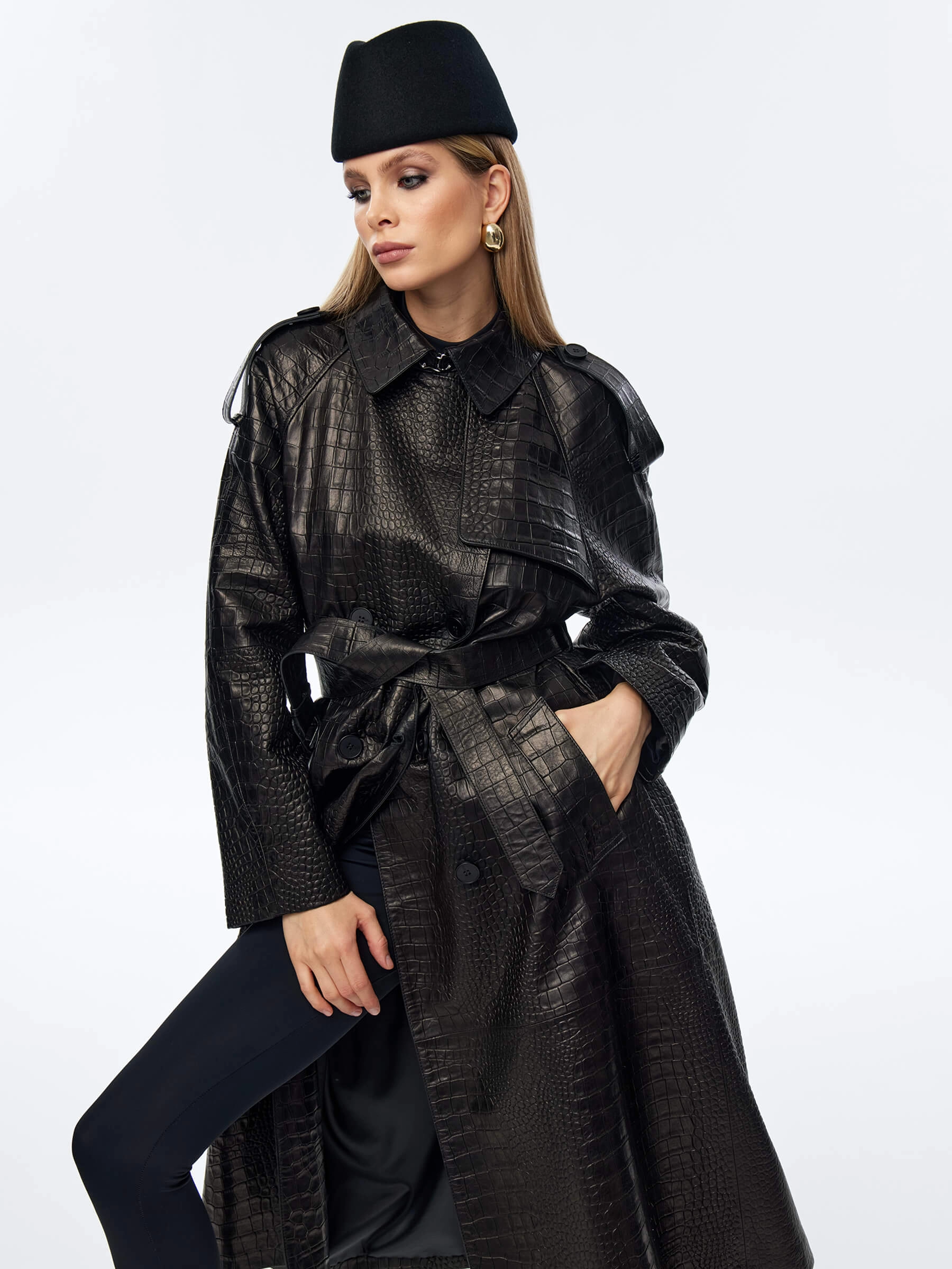 Длинный двубортный плащ выполнили из фактурной кожи премиум класса. Прямой крой, английский воротник, врезные боковые карманы. Изделие дарит не только комфорт, но и подчеркивает женственность. Модель с отлетной кокеткой и погонами дополнили широким кожаным поясом в тон.