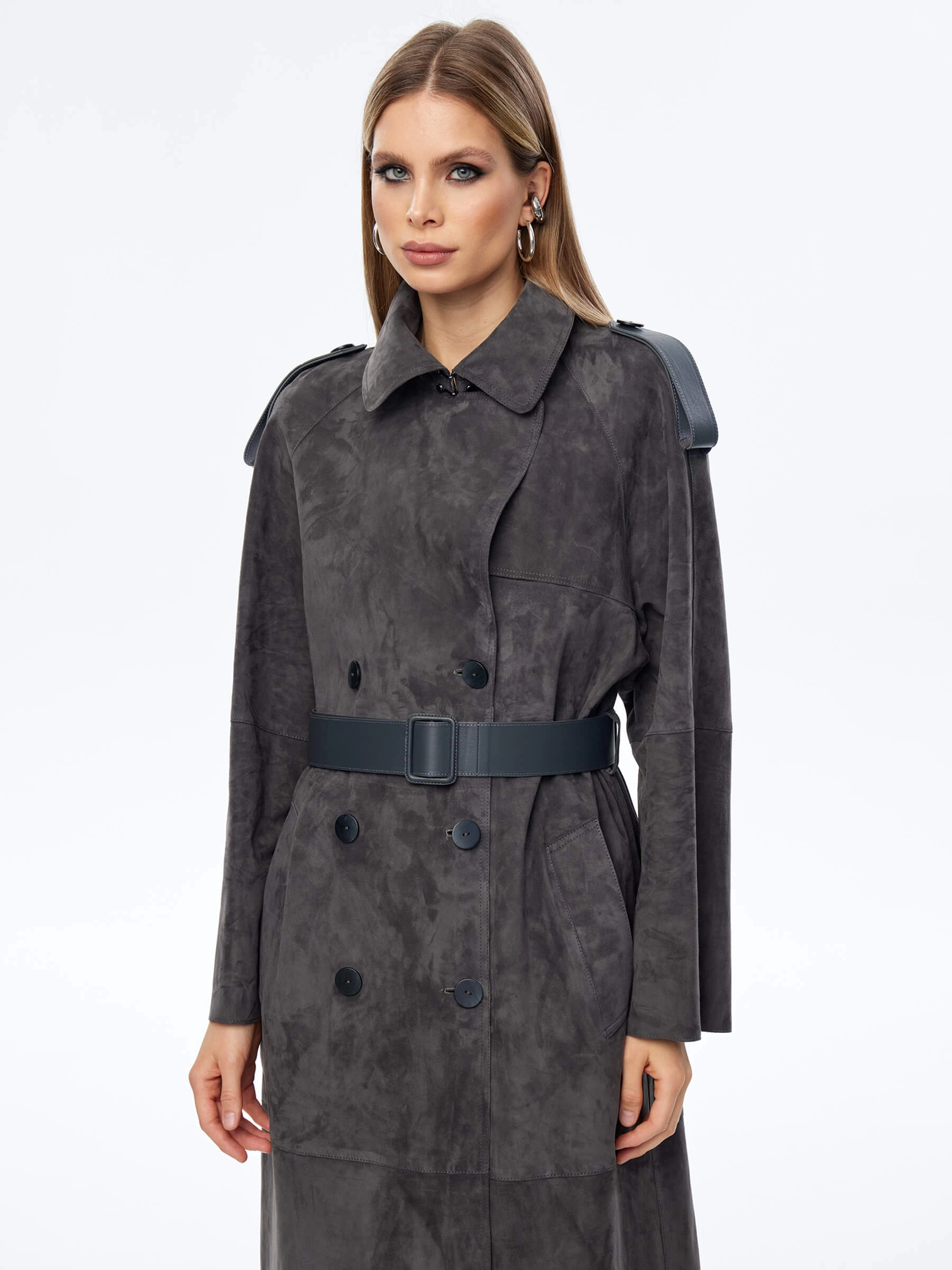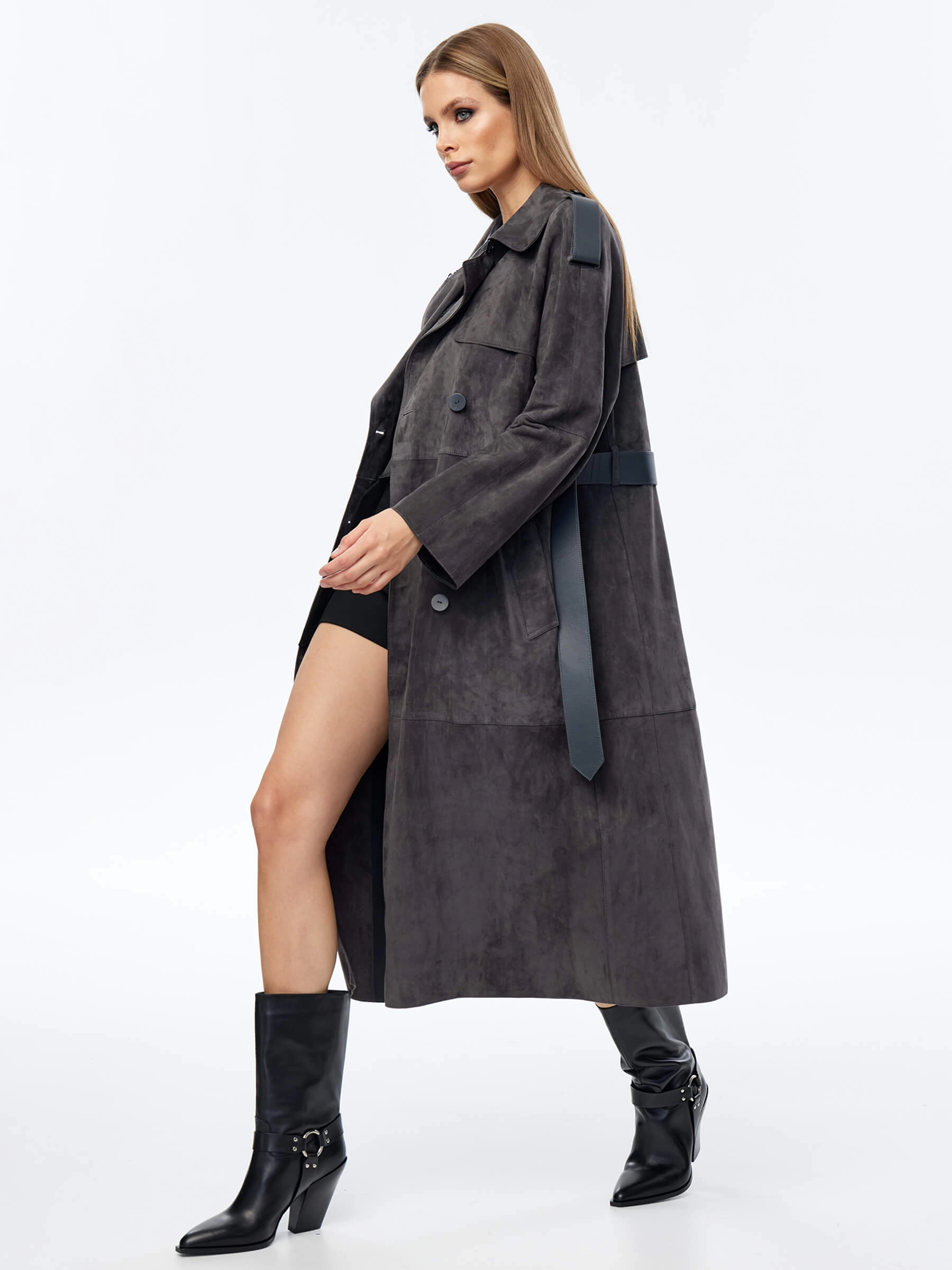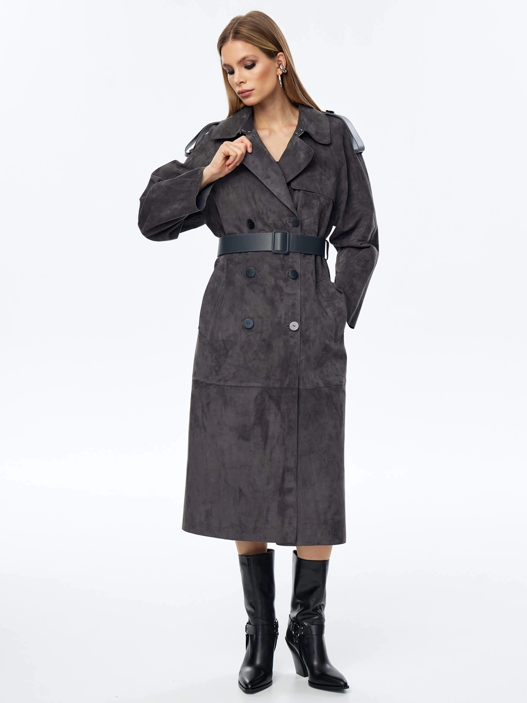 Длинный женский замшевый плащ френч оверсайз премиум класса 3070з, темно-серый, размер 44, артикул 23850