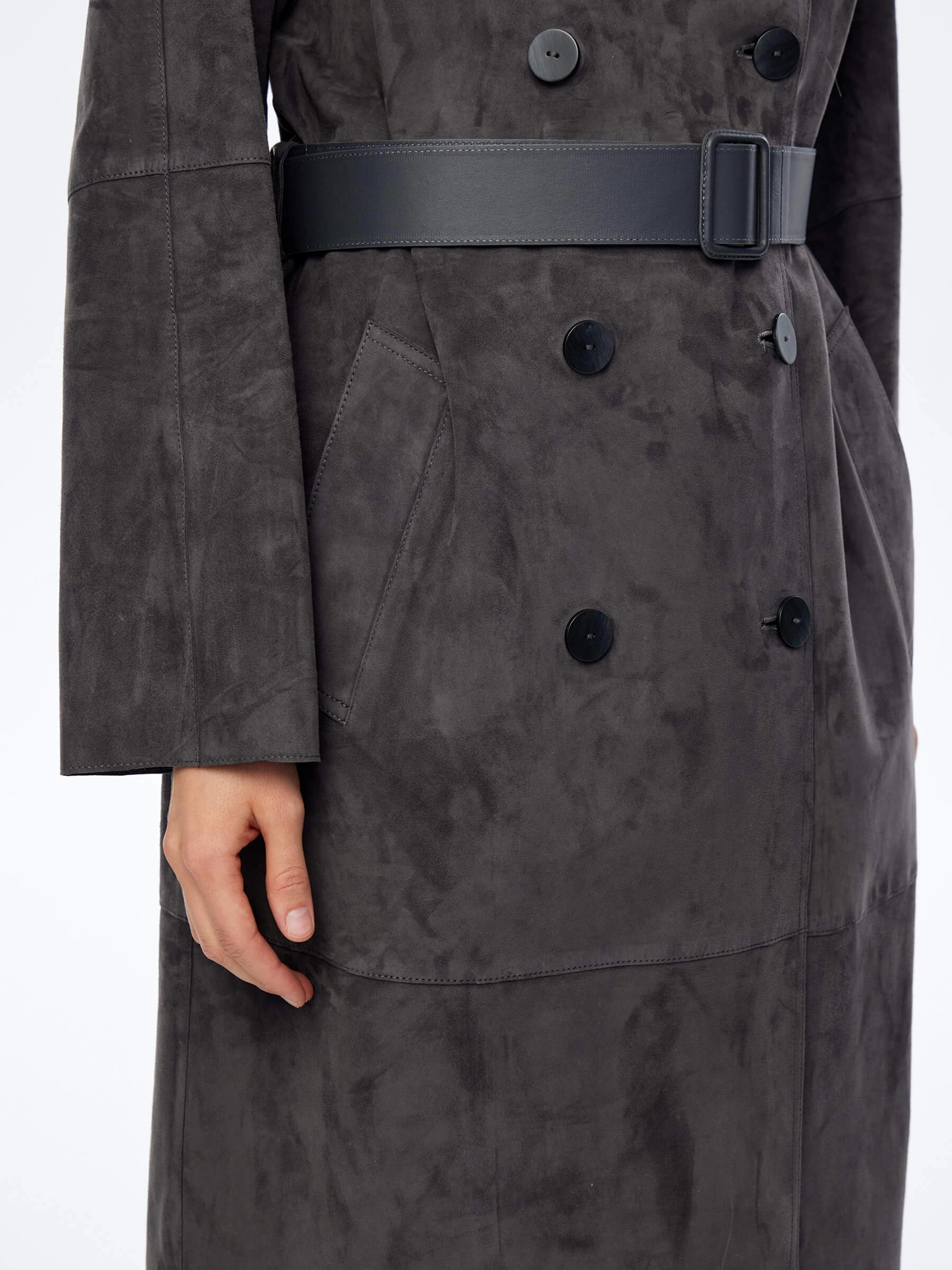 Длинный двубортный плащ выполнили из тонкой нежной замши. Прямой крой, английский воротник, врезные боковые карманы. Изделие дарит не только комфорт,но и подчеркивает женственность. Модель с отлетной кокеткой и погонами дополнили широким кожаным поясом в тон.