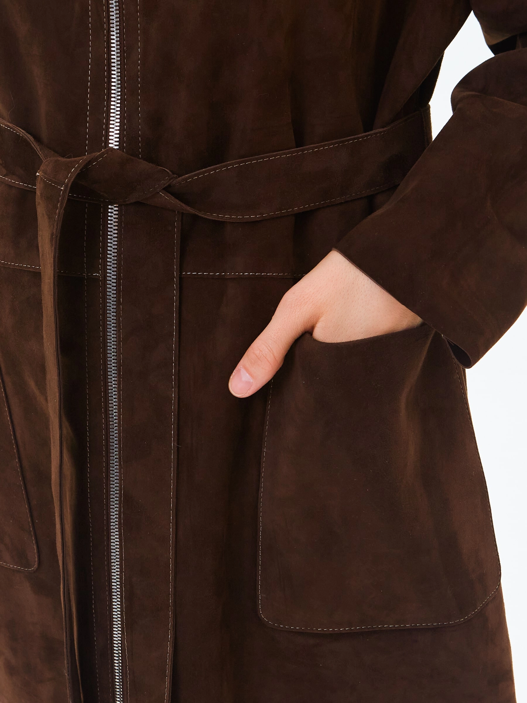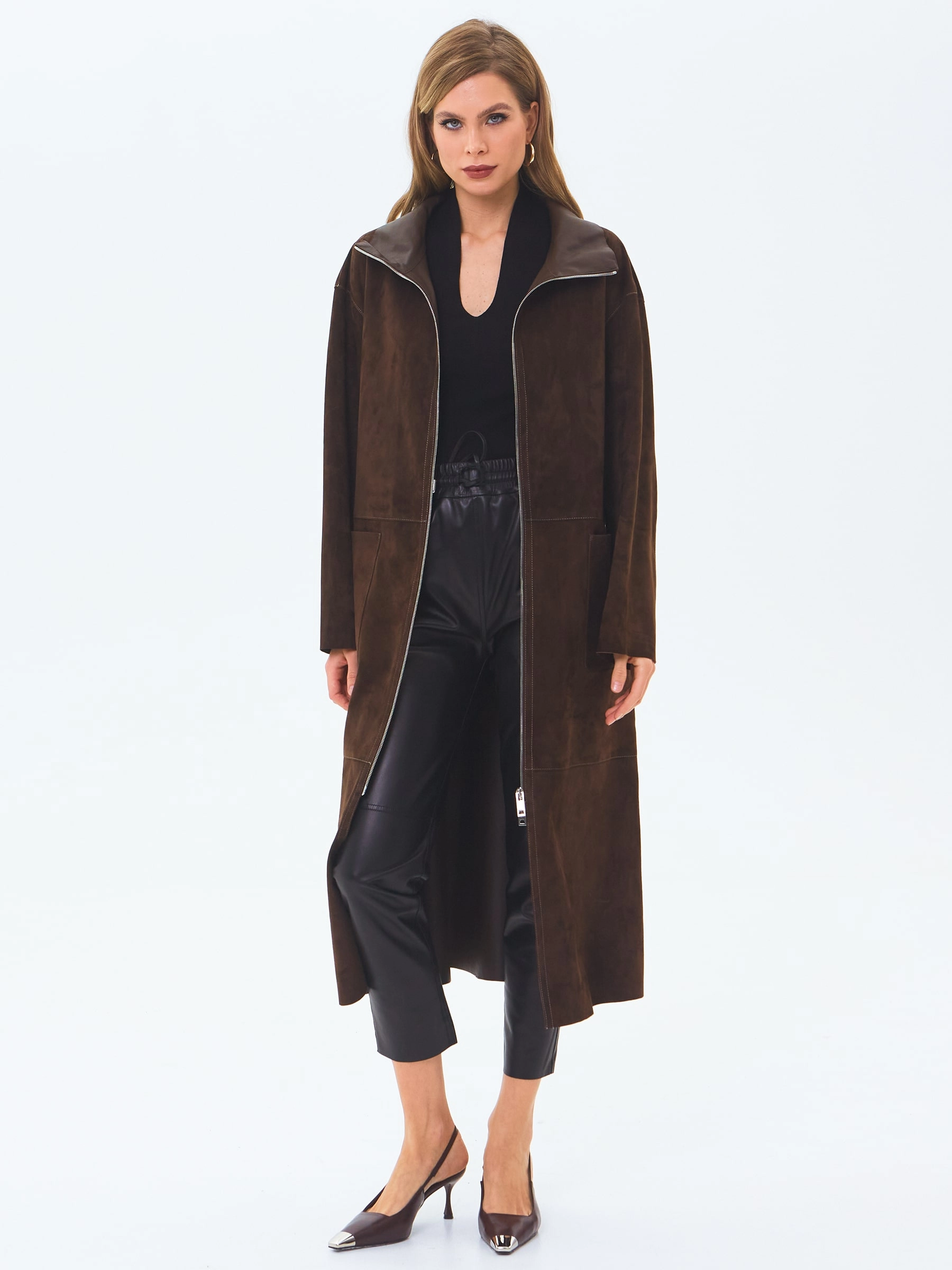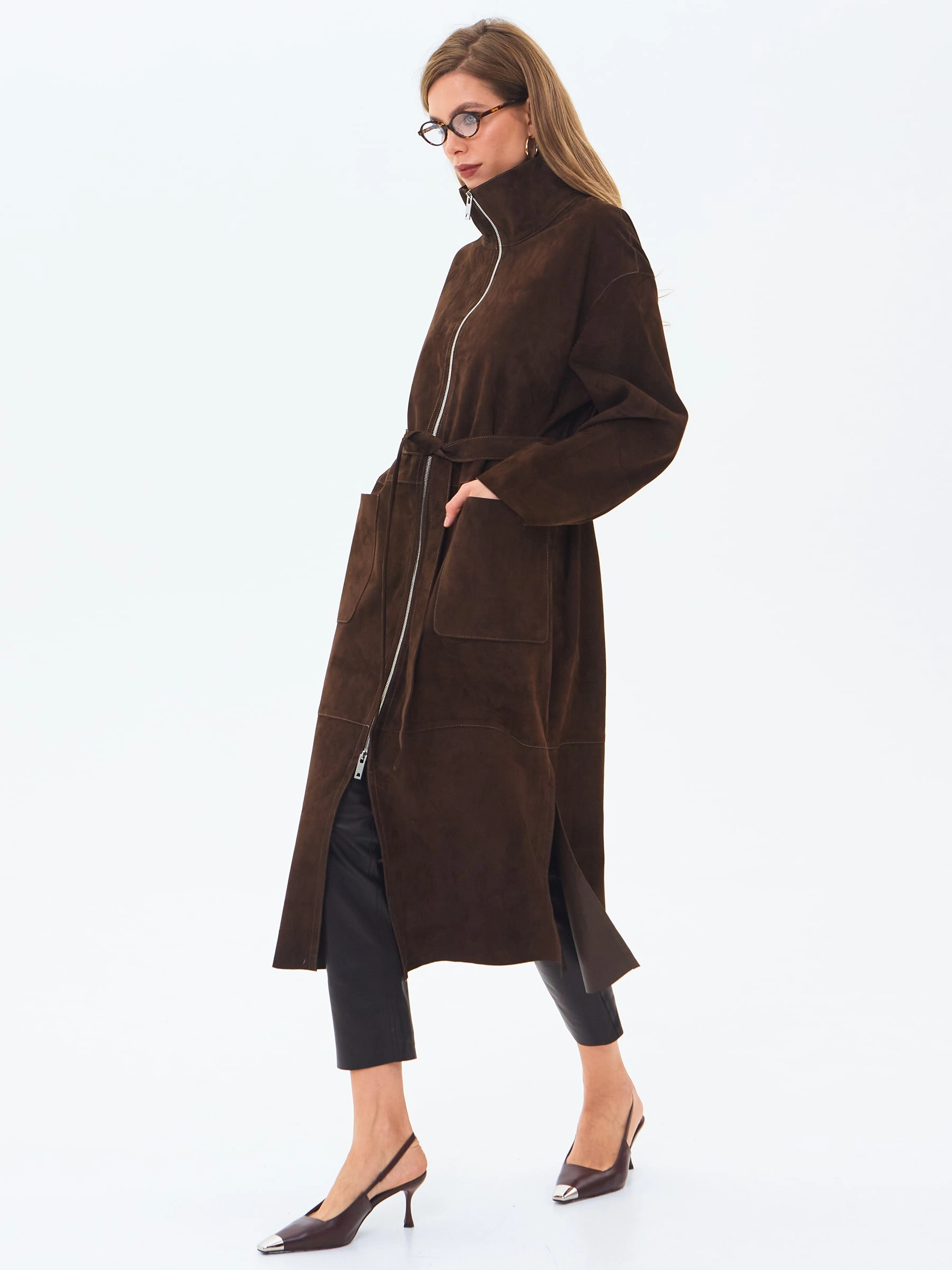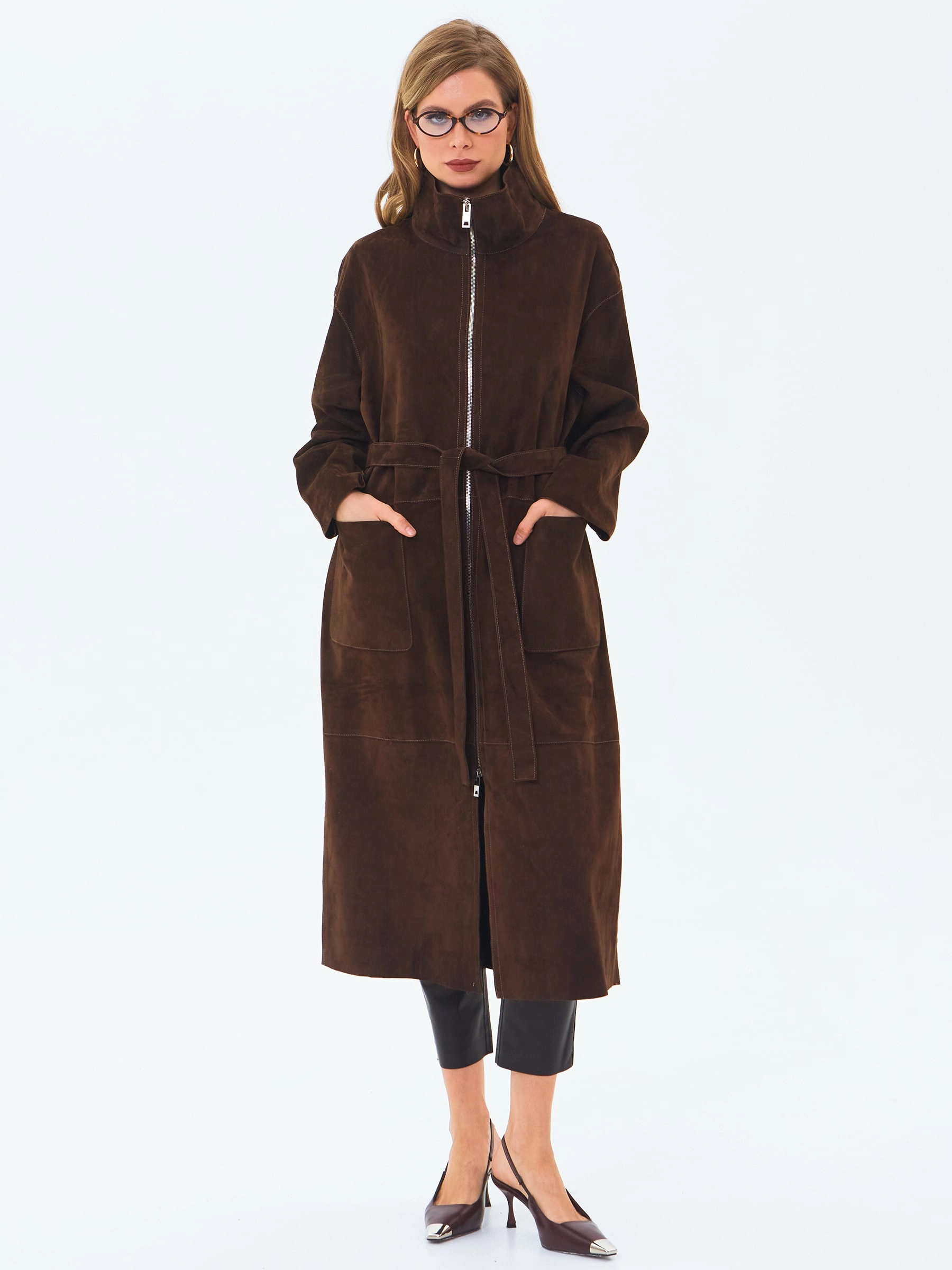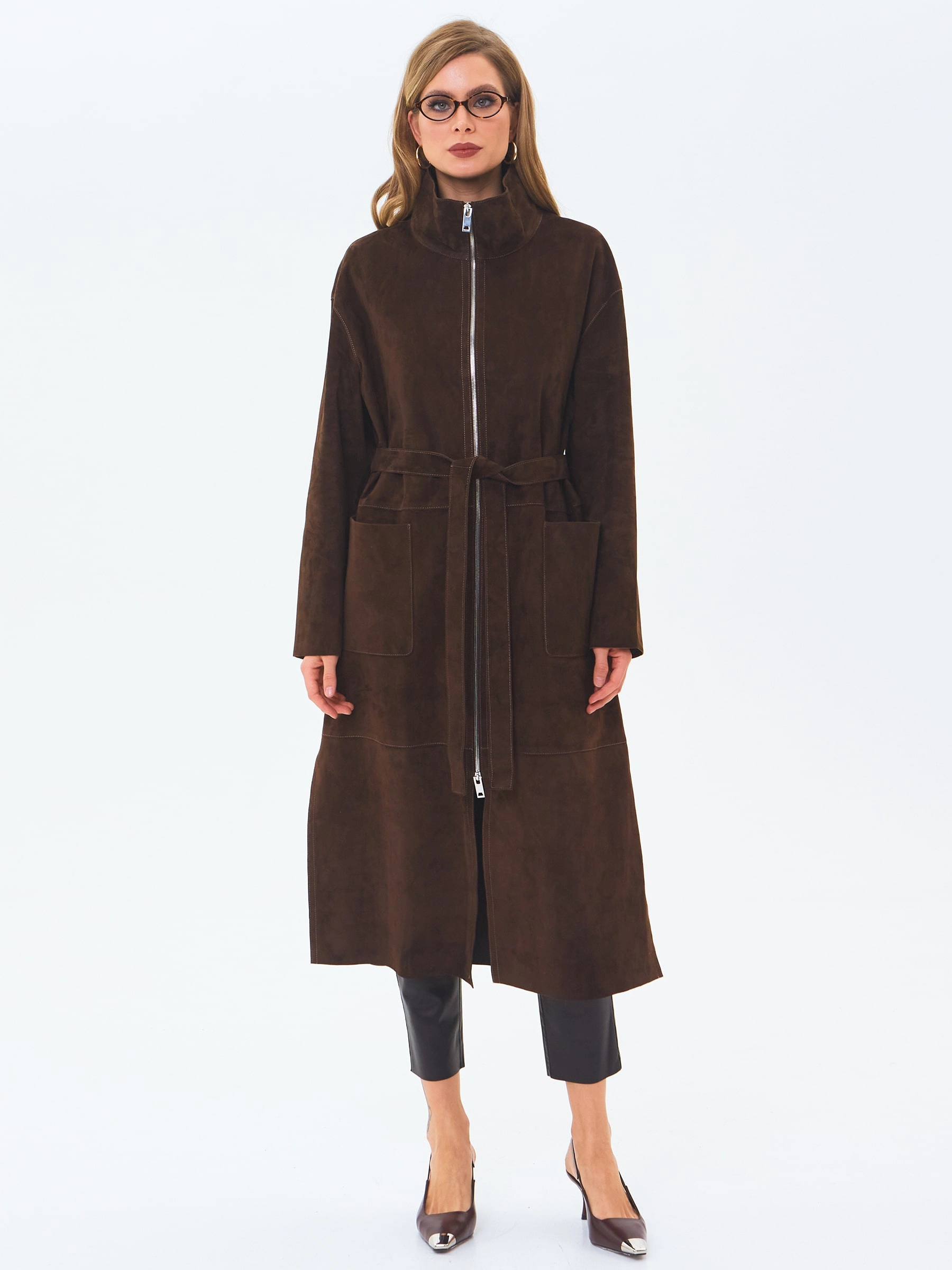 Товар длинный женский замшевый плащ премиум класса 3082з, коричневый, размер 48, артикул 24670 выполнен из натуральной замши с застежкой молния. Рассчитан на сезон: весна-лето. Длина изделия 120 см, силуэт свободный.