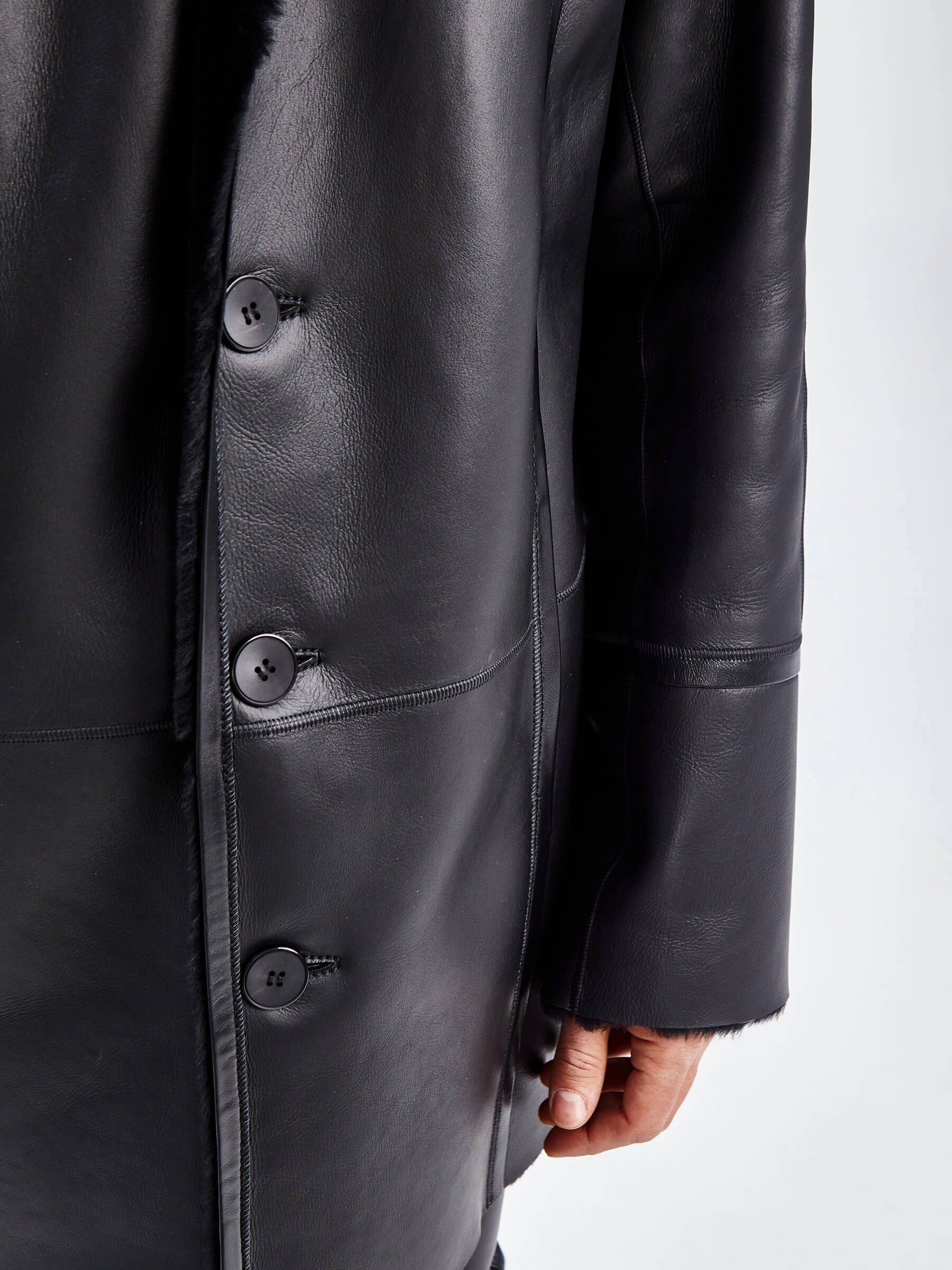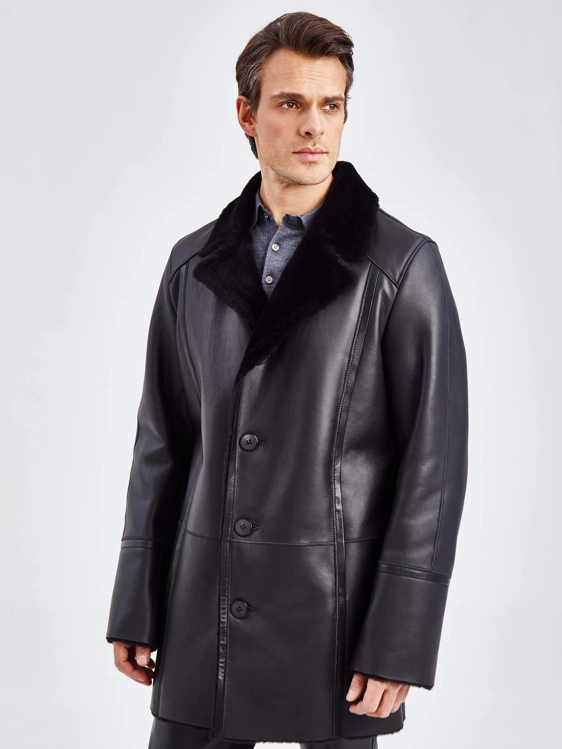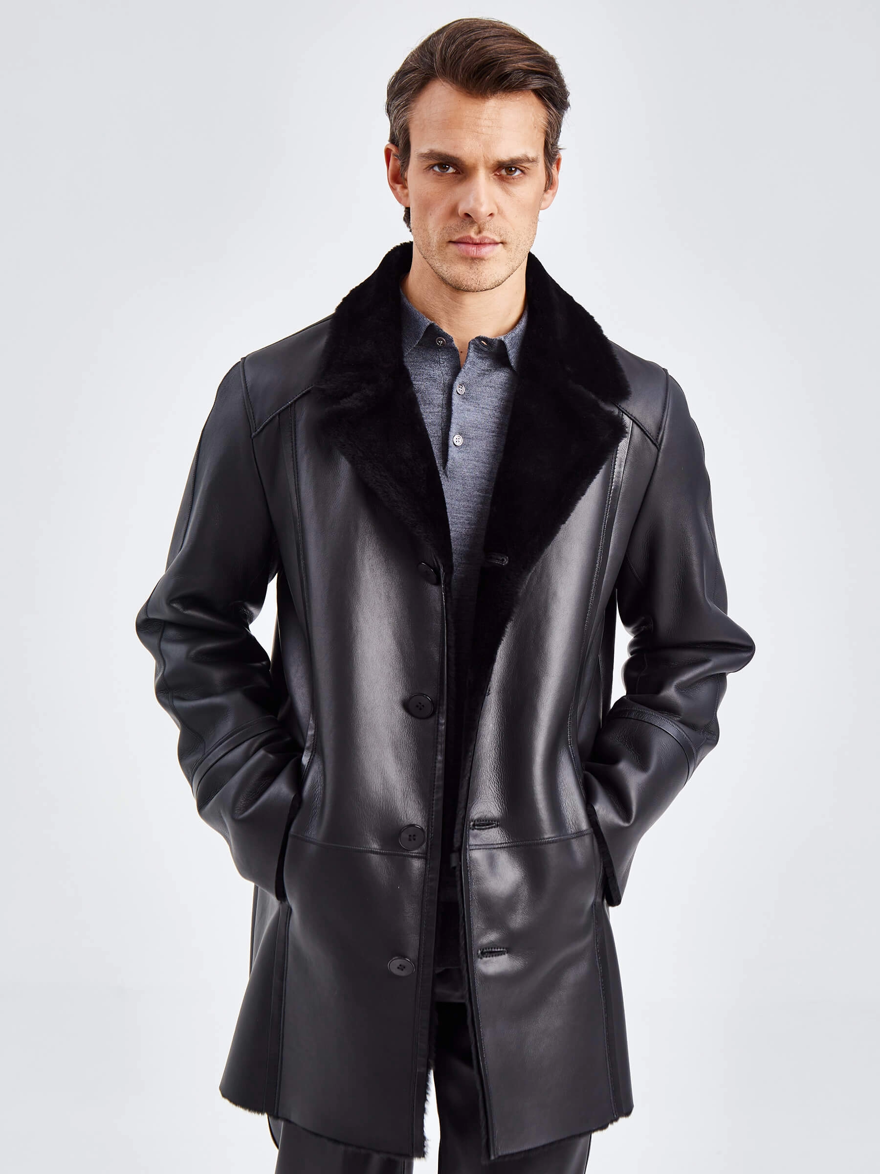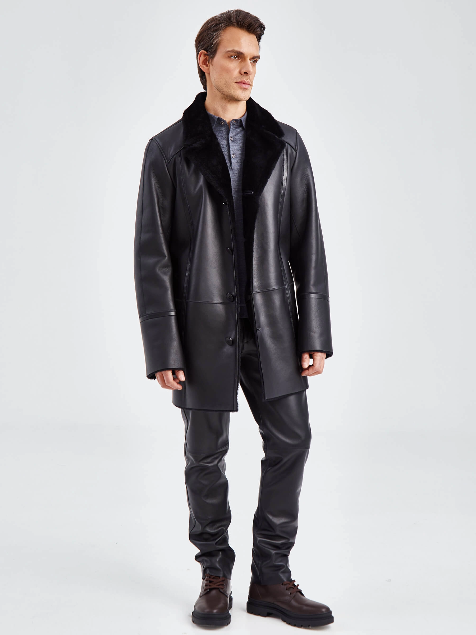Товар дубленка классическая мужская премиум класса леон(пр), черная, размер 50, артикул 71390 выполнен из овчина "мерино" с застежкой пуговицы. Рассчитан на сезон: осень-зима. Длина изделия 88 см, силуэт прямой.