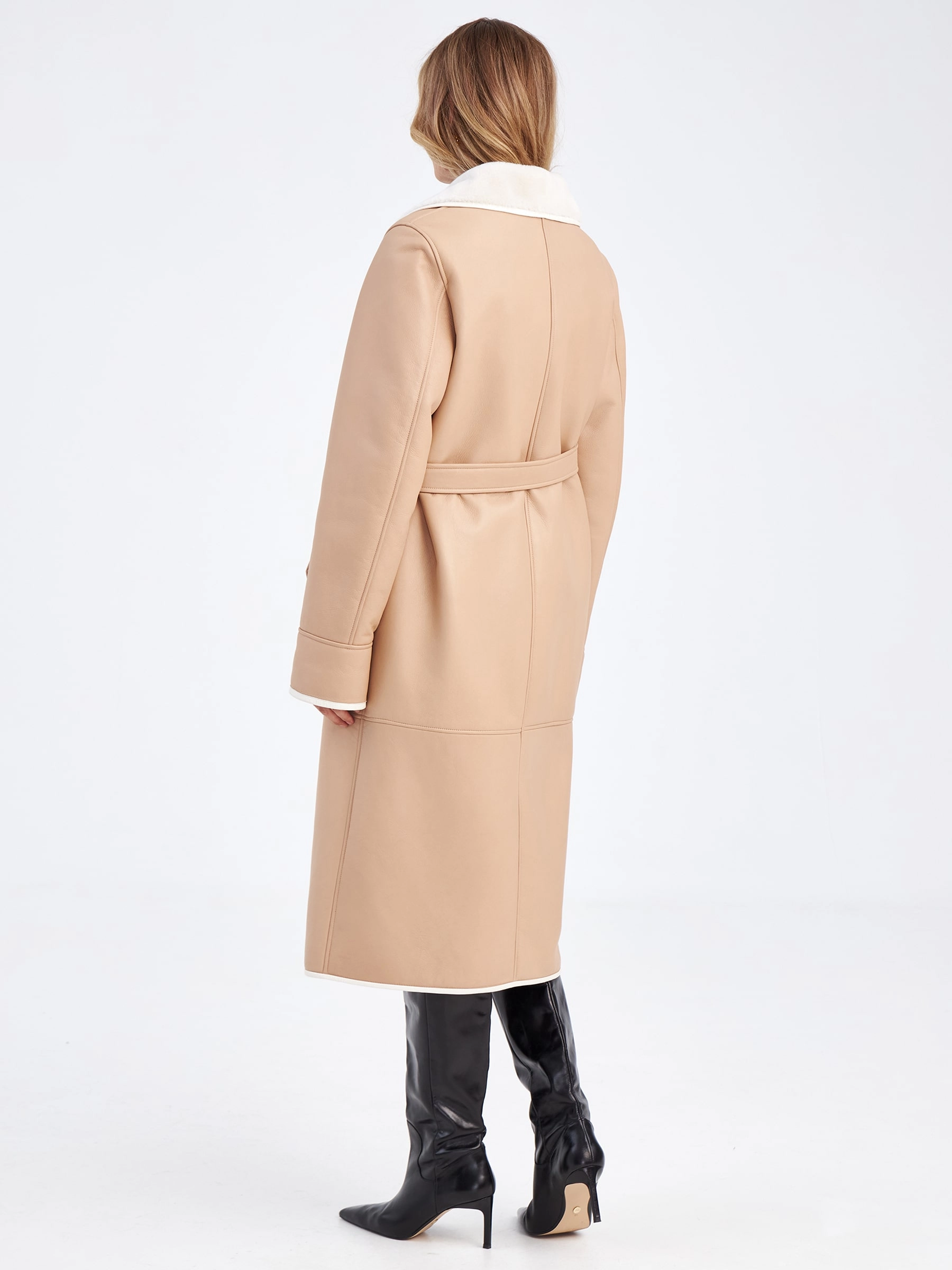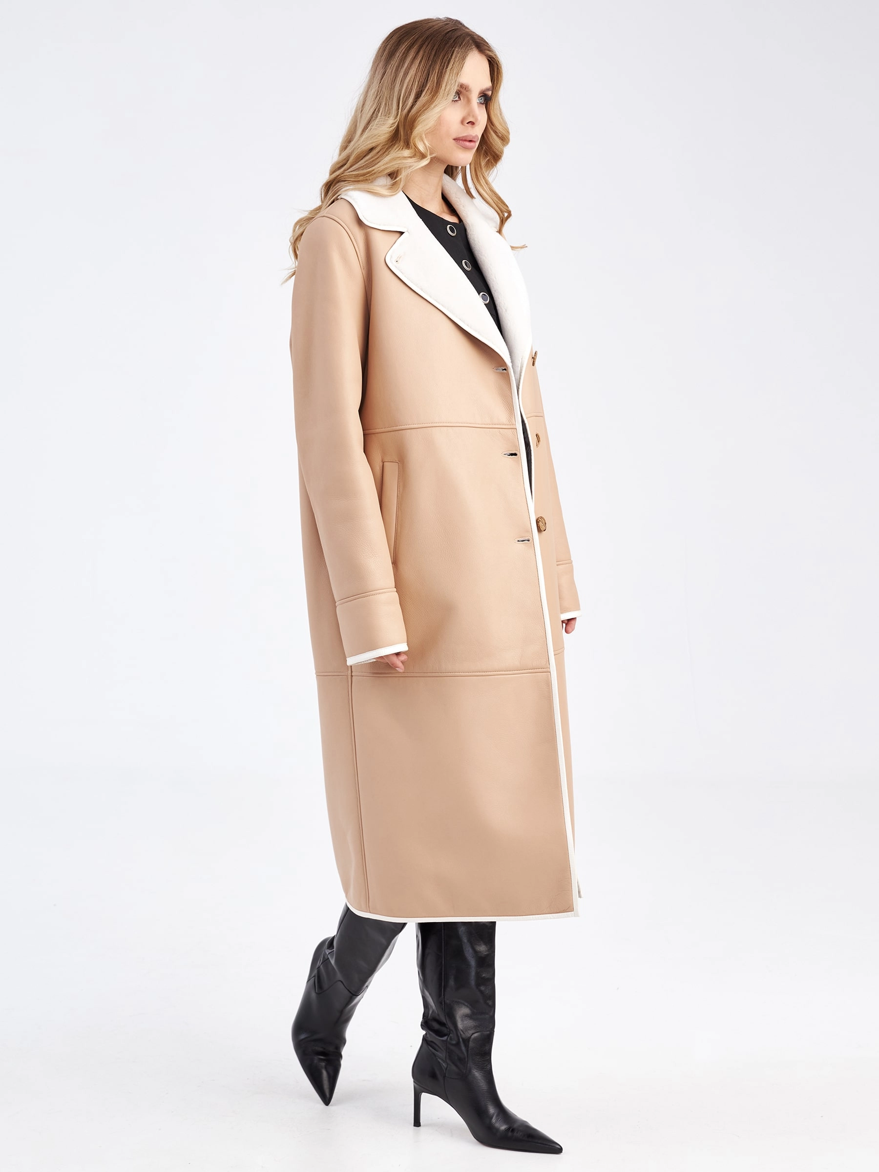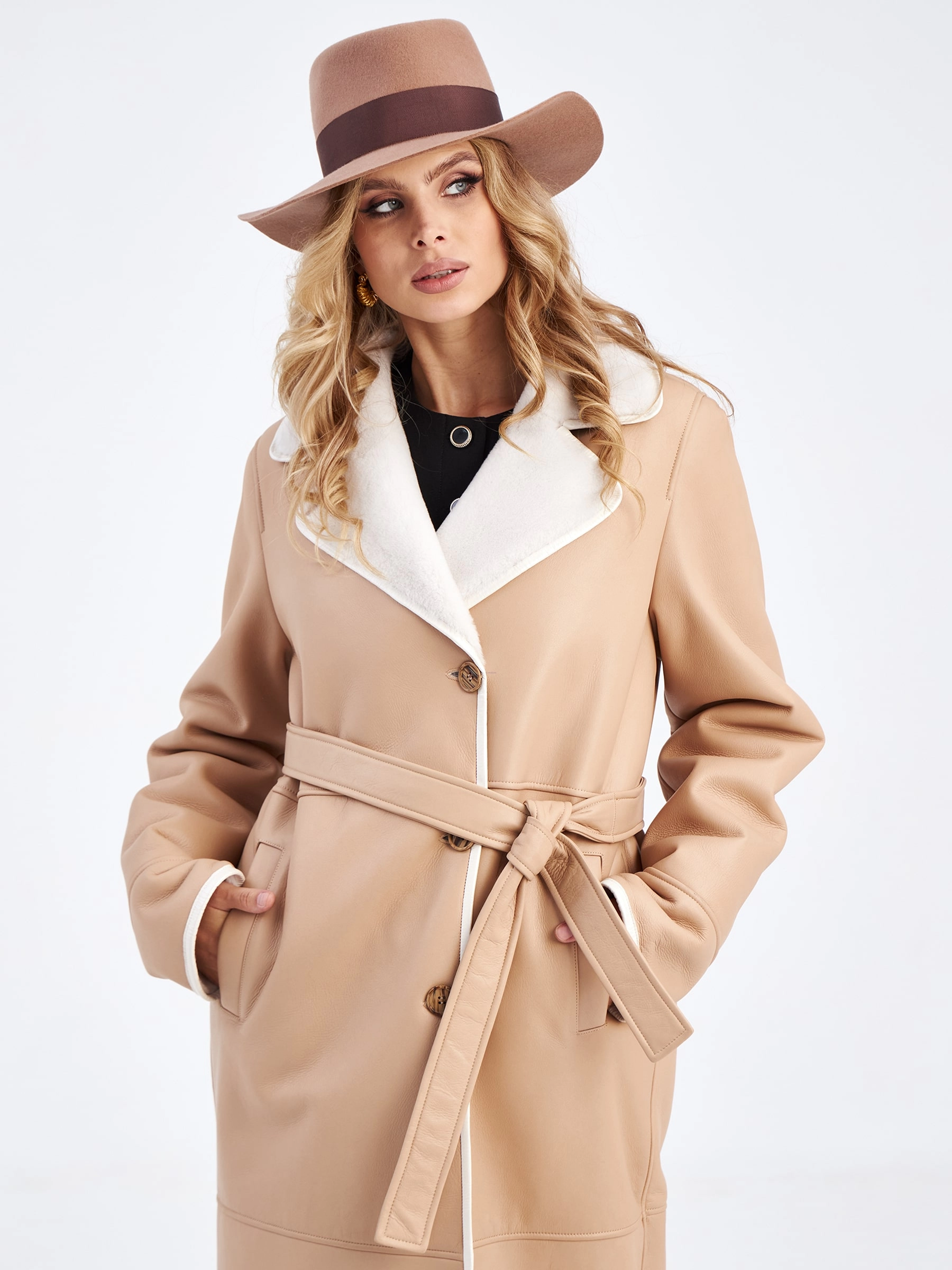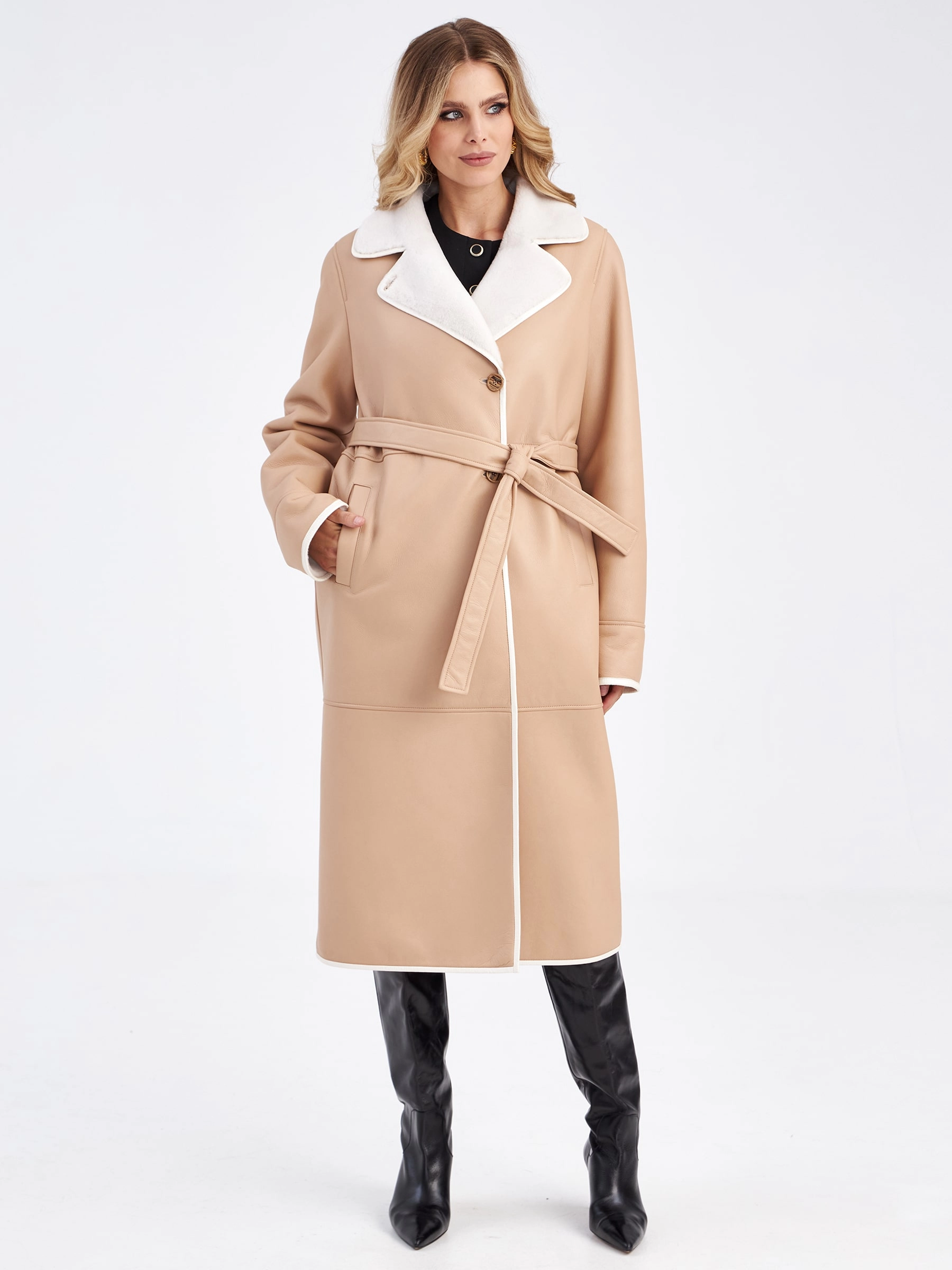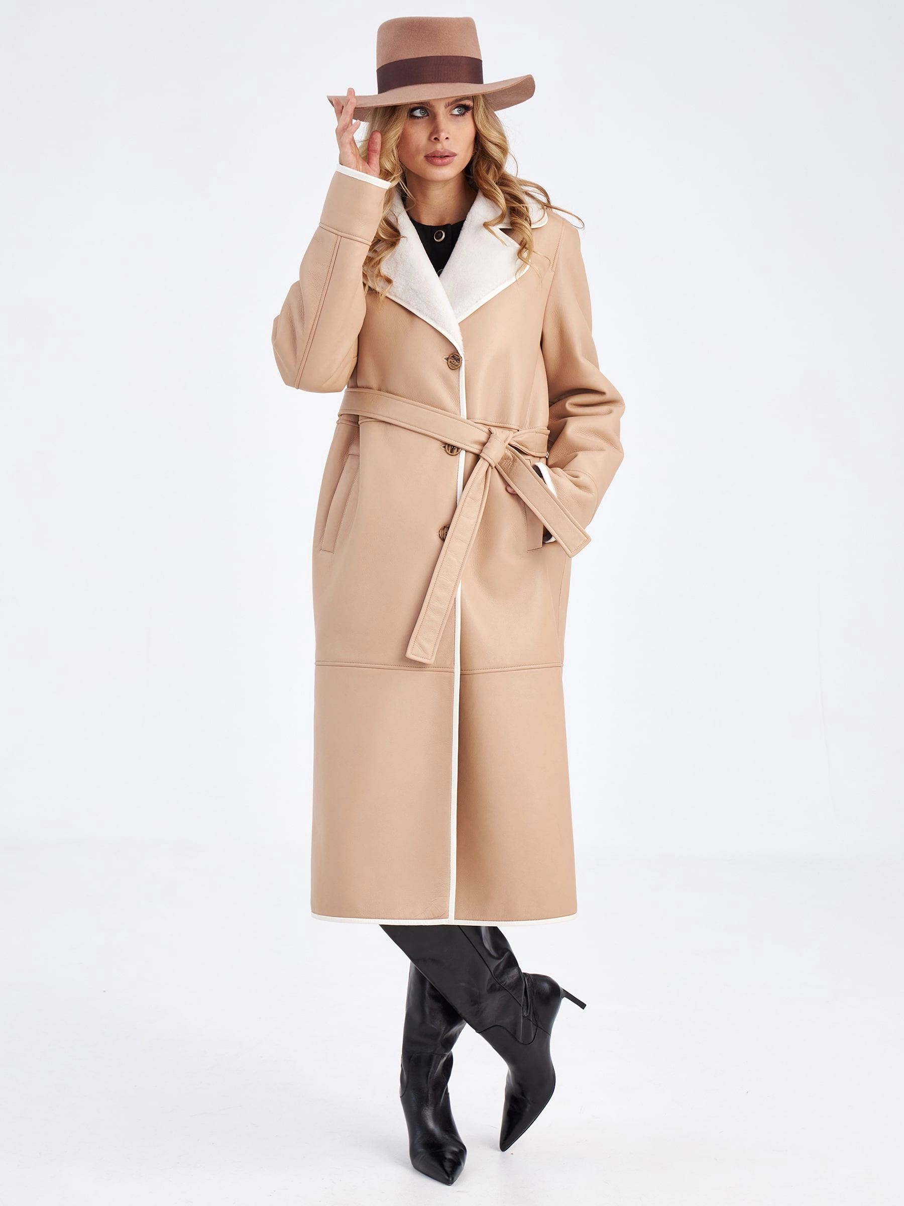 Эта длинная классическая женская дубленка премиум-класса в благородном бежевом оттенке — прямое доказательство того, что даже зимой можно выглядеть стильно, элегантно и безупречно. Модель выполнили из нежной мягкой овчины мерино: максимально густой белый мех внутри надежно сохраняет тепло даже в сильный мороз, обеспечивая комфорт и уют в самых холодных условиях. Благодаря классическому прямому крою со спущенным плечом и длиной свыше 90 см дубленка создает идеальный баланс между свободой движений и безупречной посадкой по фигуре. Лаконичный дизайн подчеркивают продуманные детали: английский воротник и борт изделия дополнены тонким кожаным кантом, который добавляет графичности и визуально освежает образ. Особую функциональность и вариативность придает длинный кожаный пояс — с его помощью можно регулировать силуэт, создавая как более приталенные, так и свободные линии. Крупные пуговицы выступают в роли элегантной застежки, сохраняя общую гармонию и сдержанность модели.