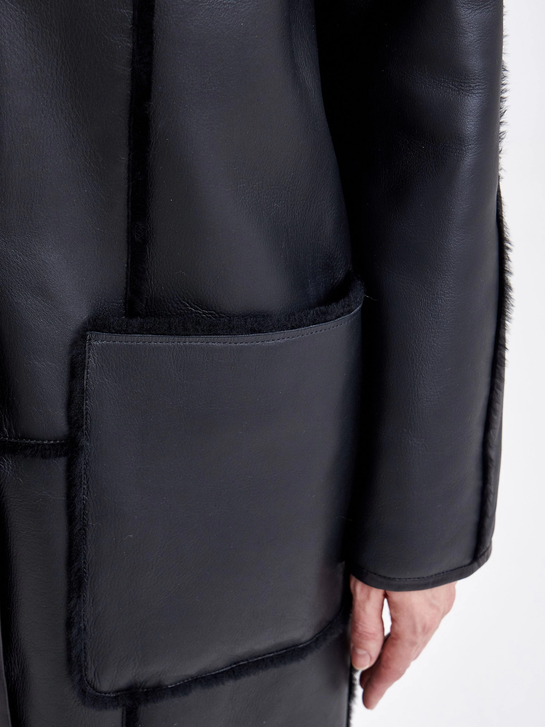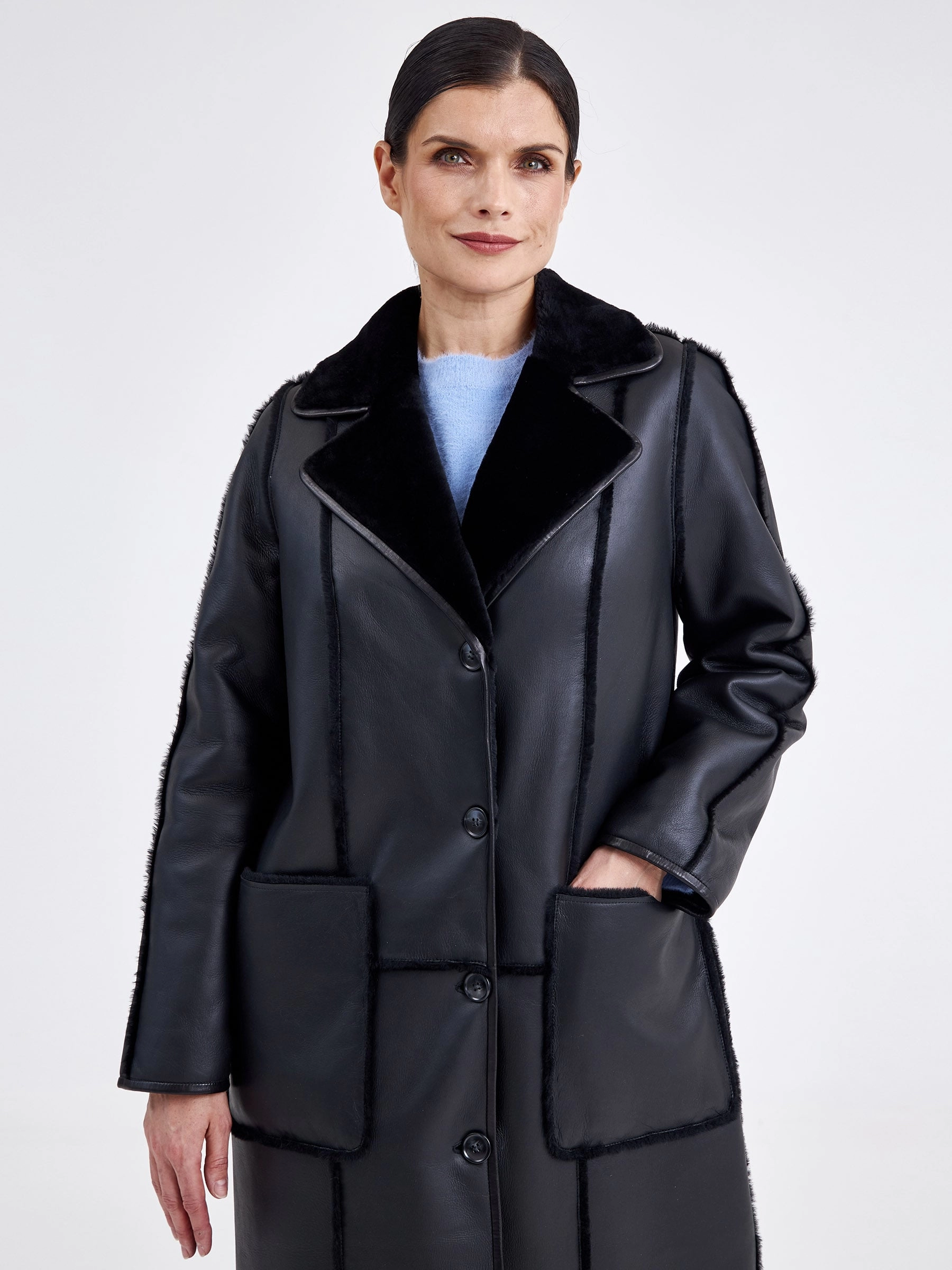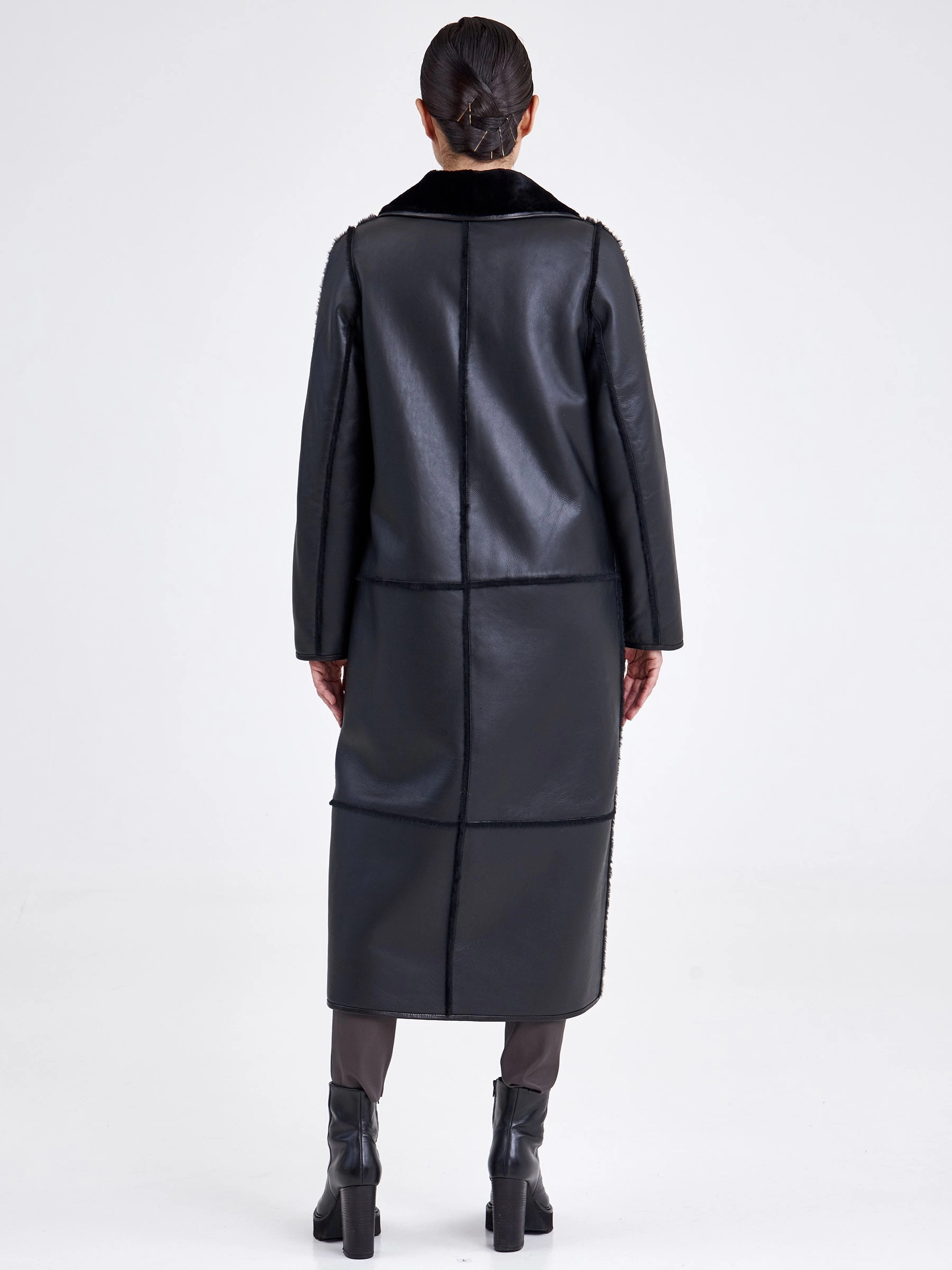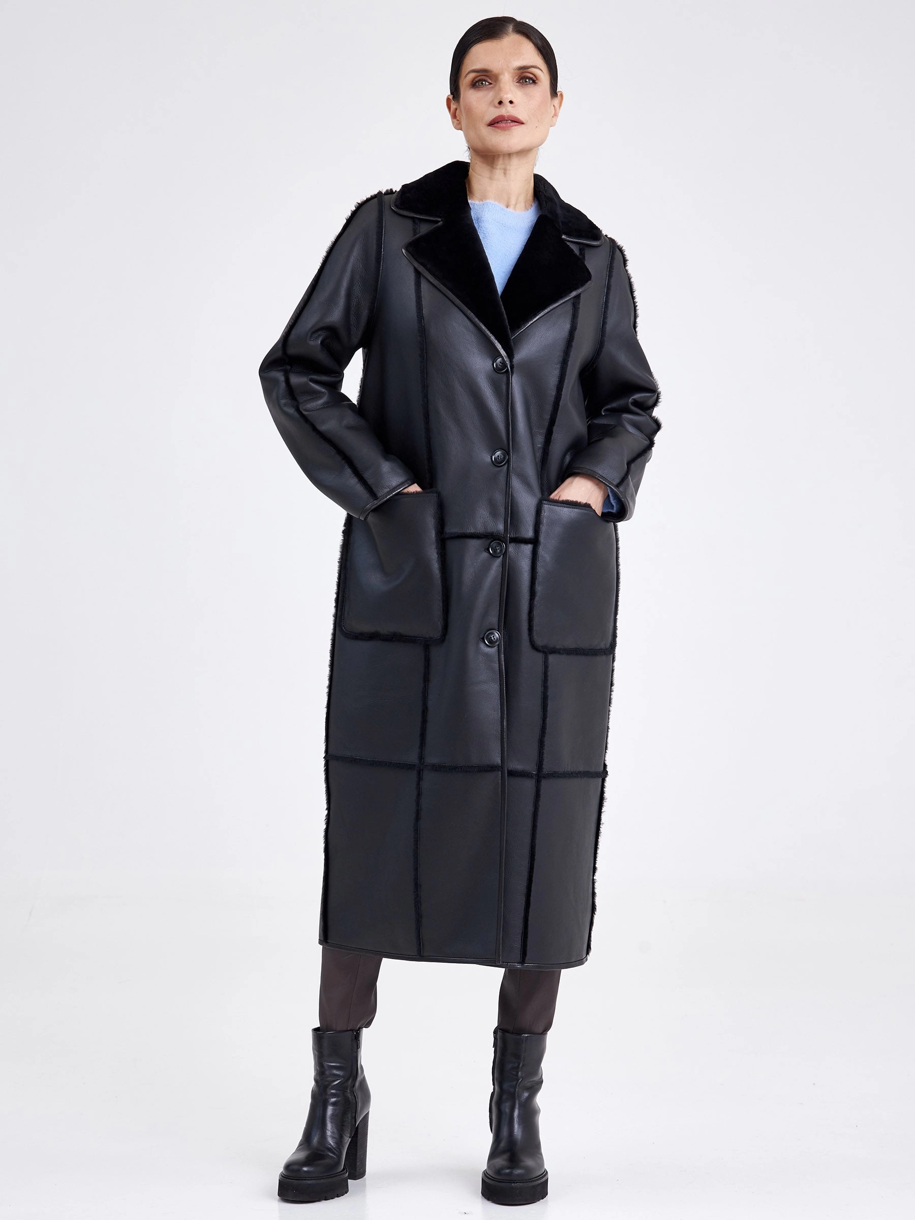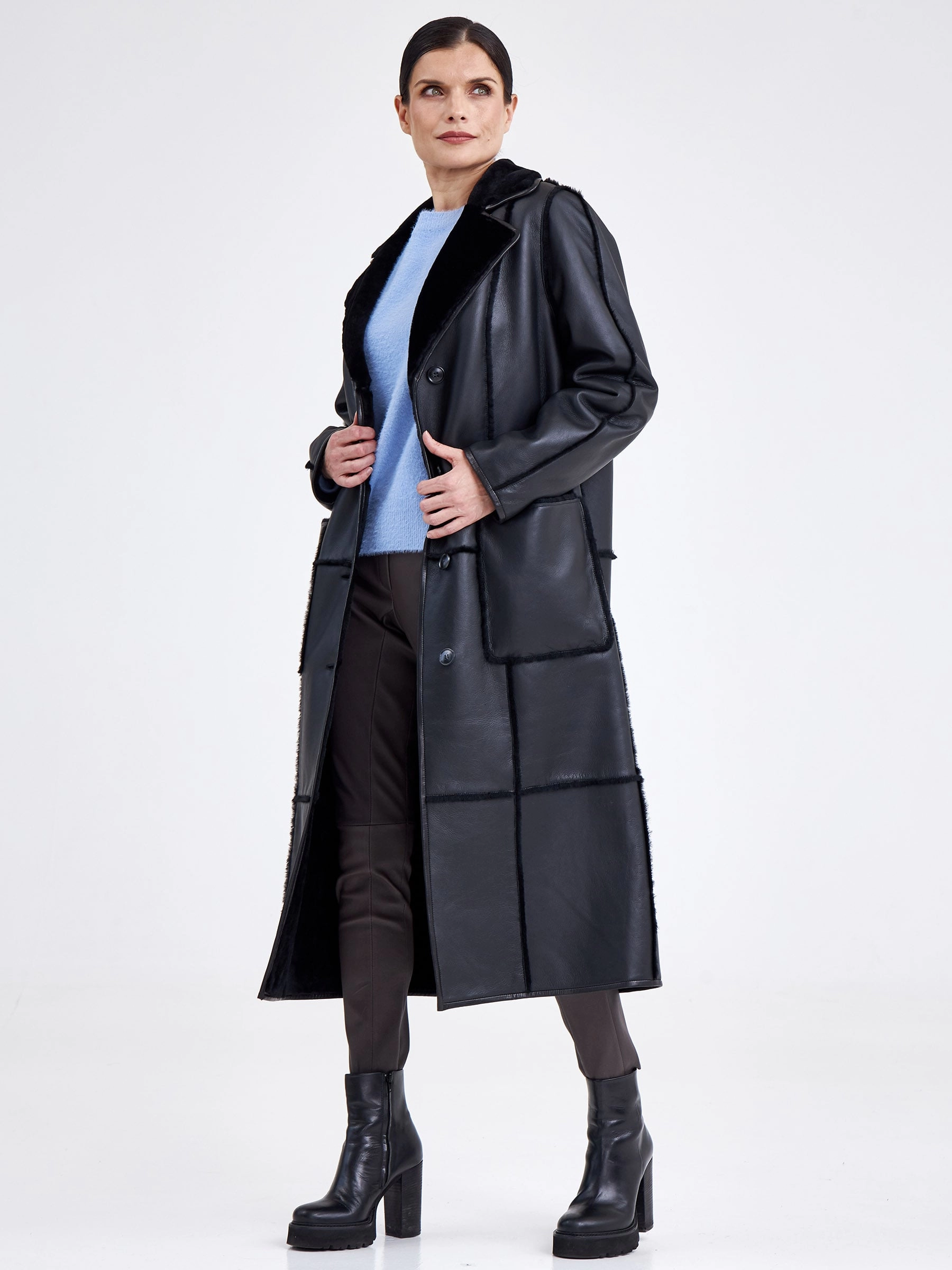 Классическая дублёнка из овчины «мерино» с декоративными вывернутыми наружу швами — это воплощение элегантности и функциональности с индустриальным акцентом. Модель выполнена в удлинённом прямом крое (свыше 90 см) с лаконичным английским воротником и строгой застёжкой на пуговицы. Благодаря втачным плечам и продуманной посадке она идеально облегает фигуру, сохраняя сдержанный силуэт. Внутренняя сторона представляет собой мягкий натуральный мех той же овчины, который обеспечивает превосходное тепло без использования подкладки, делая дублёнку лёгкой и комфортной. Отсутствие капюшона и лаконичный дизайн с контрастными швами подчёркивают её вневременной характер, превращая в универсальную основу для осенне-зимнего гардероба. Совет стилиста: носите её как роскошную альтернативу пальто с платьем-футляром и сапогами-ботфортами для вечернего образа или сочетайте с грубыми джинсами и объёмным свитером, создав контрастную текстуру в стиле casual.