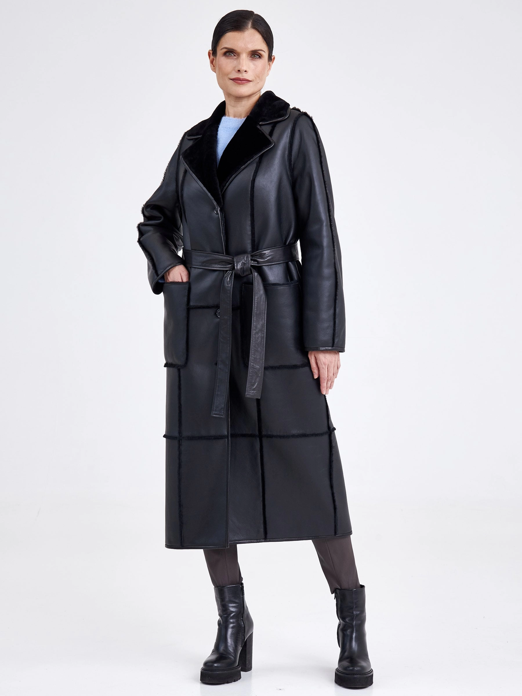 Товар длинная женская дубленка с поясом премиум класса 2013, черная, размер 48, артикул 62691 выполнен из овчина "мерино" с застежкой пуговицы. Рассчитан на сезон: осень-зима. Длина изделия свыше 90 см, силуэт прямой.