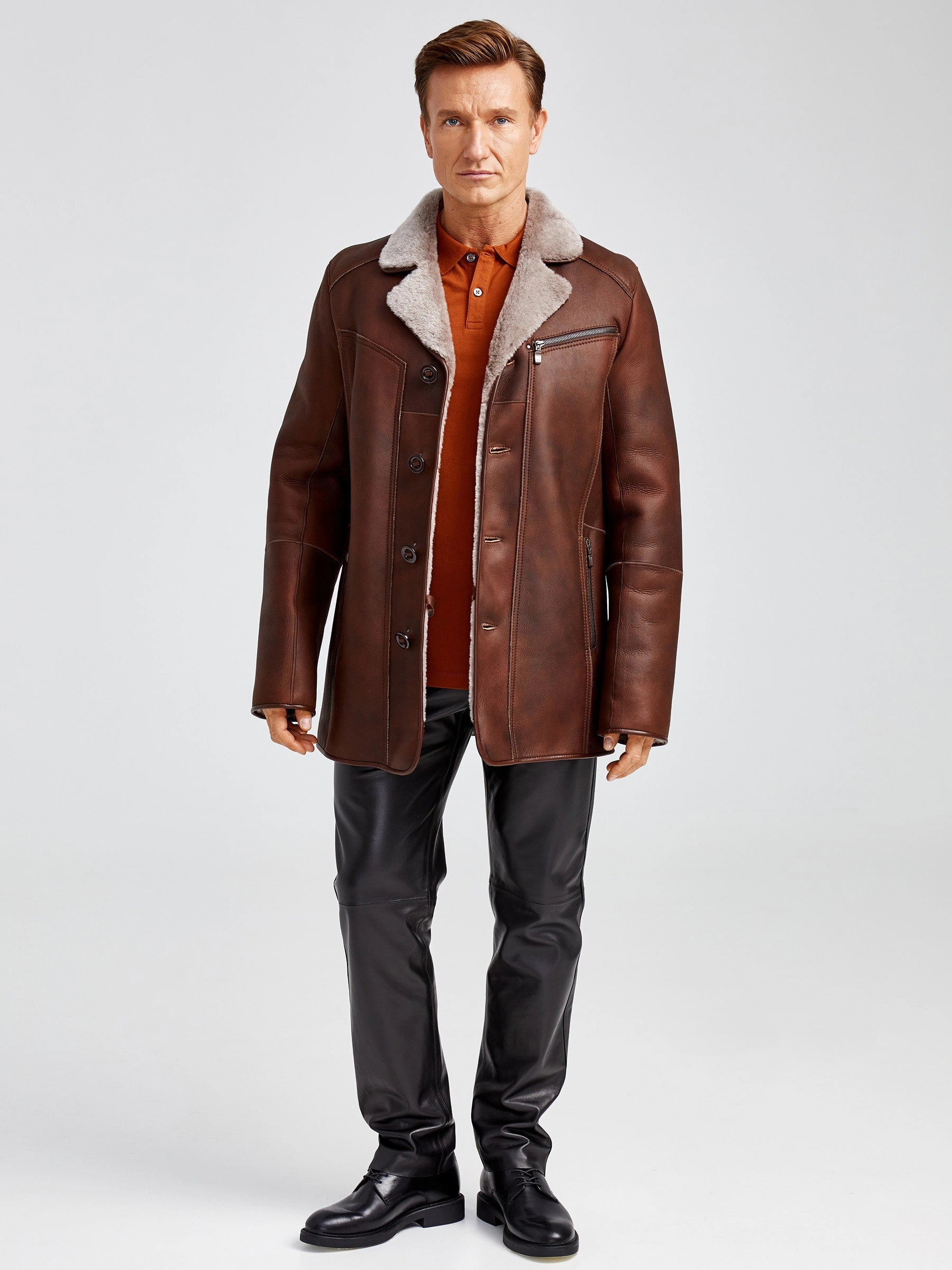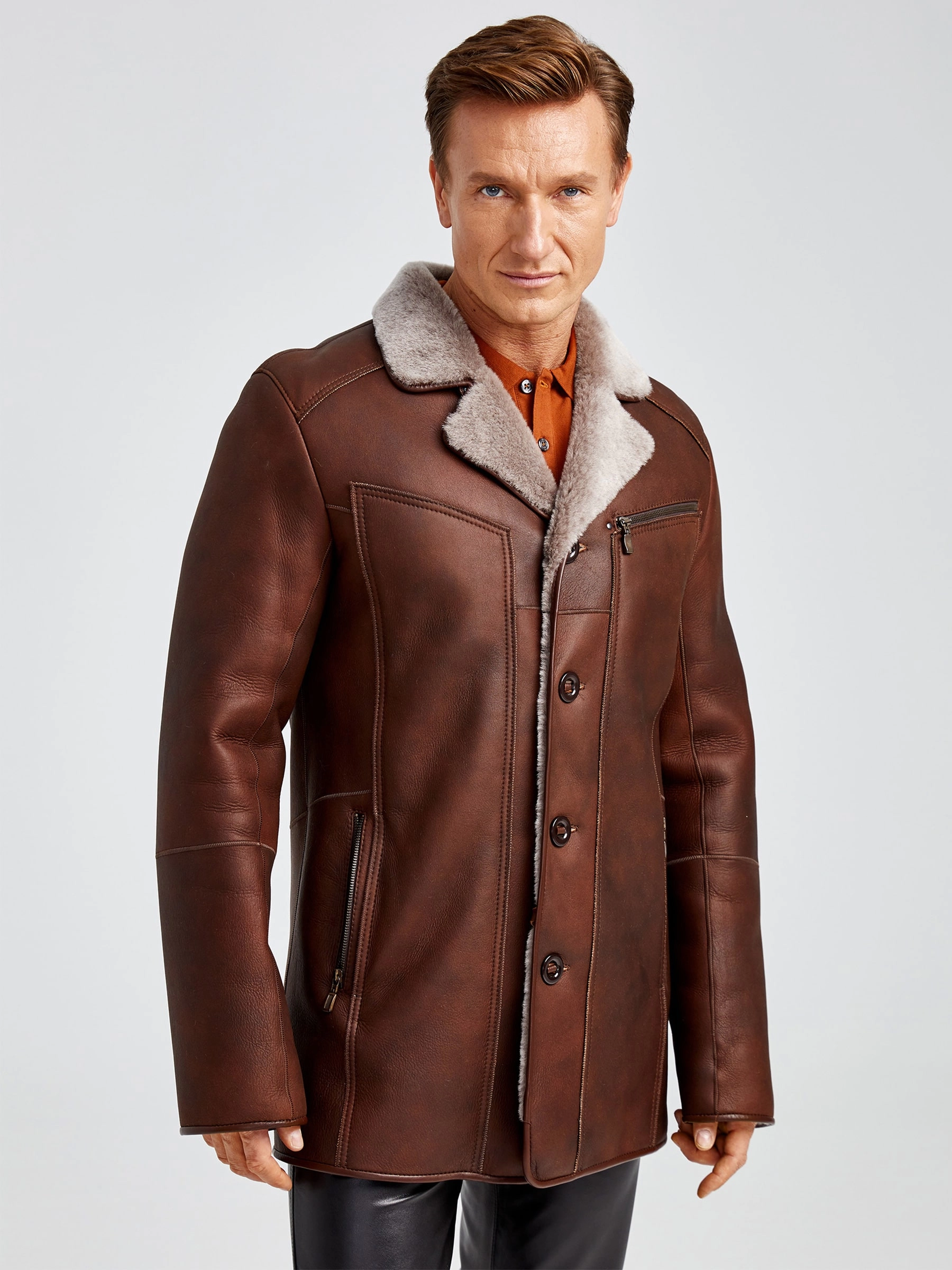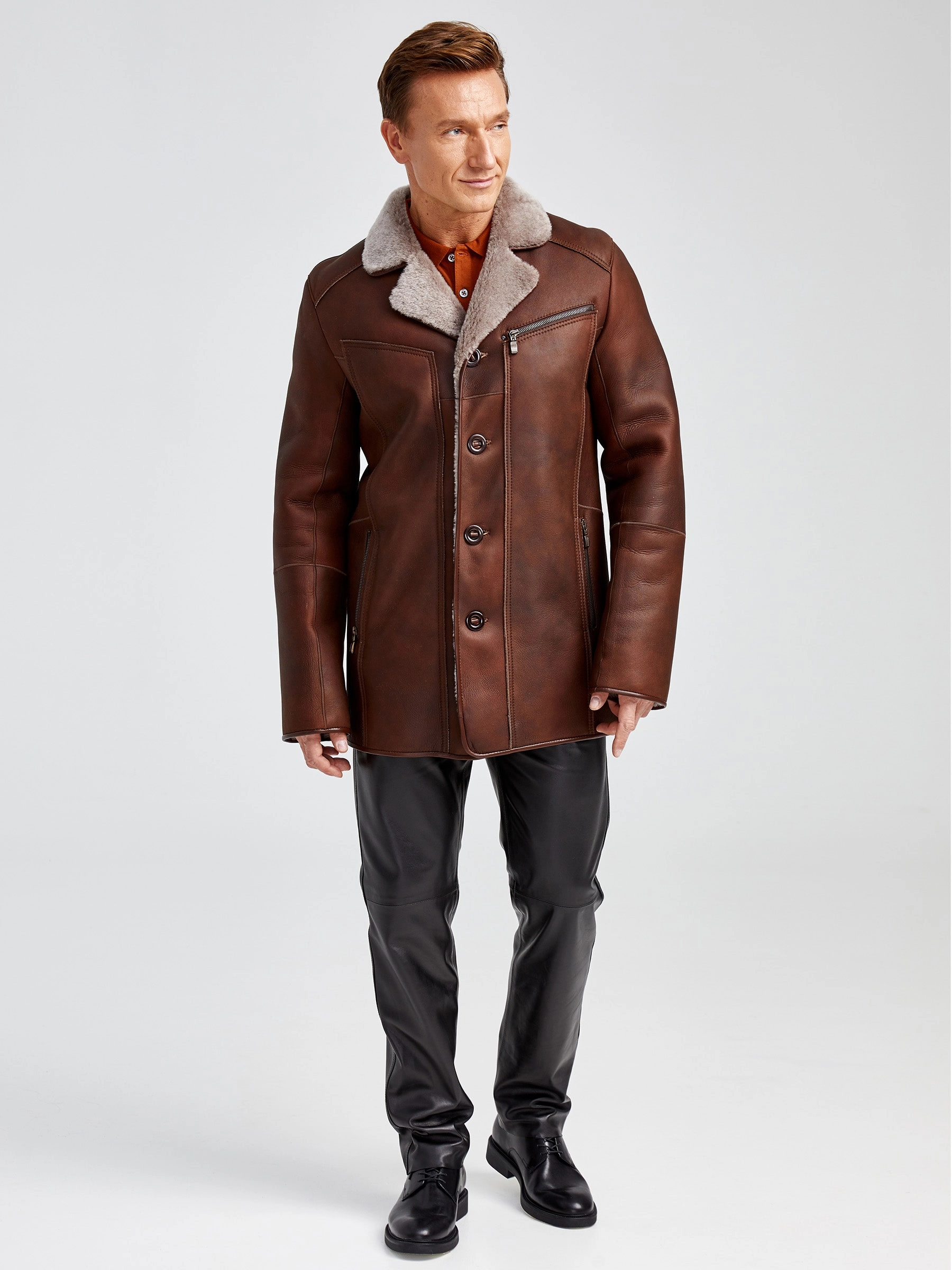 Современная мужская дублёнка, классической длины. Удобные карманы для ключей и документов. Новейшее защитное покрытие. Особо прочные нитки. Приятный на ощупь, максимально густой мех мериносной породы овец. Идеальные швы, продуманные и удобные элементы. Аккуратность во всей работе. Чёткая и очень удобная посадка по фигуре. Великолепная свобода движений. Абсолютный комфорт.