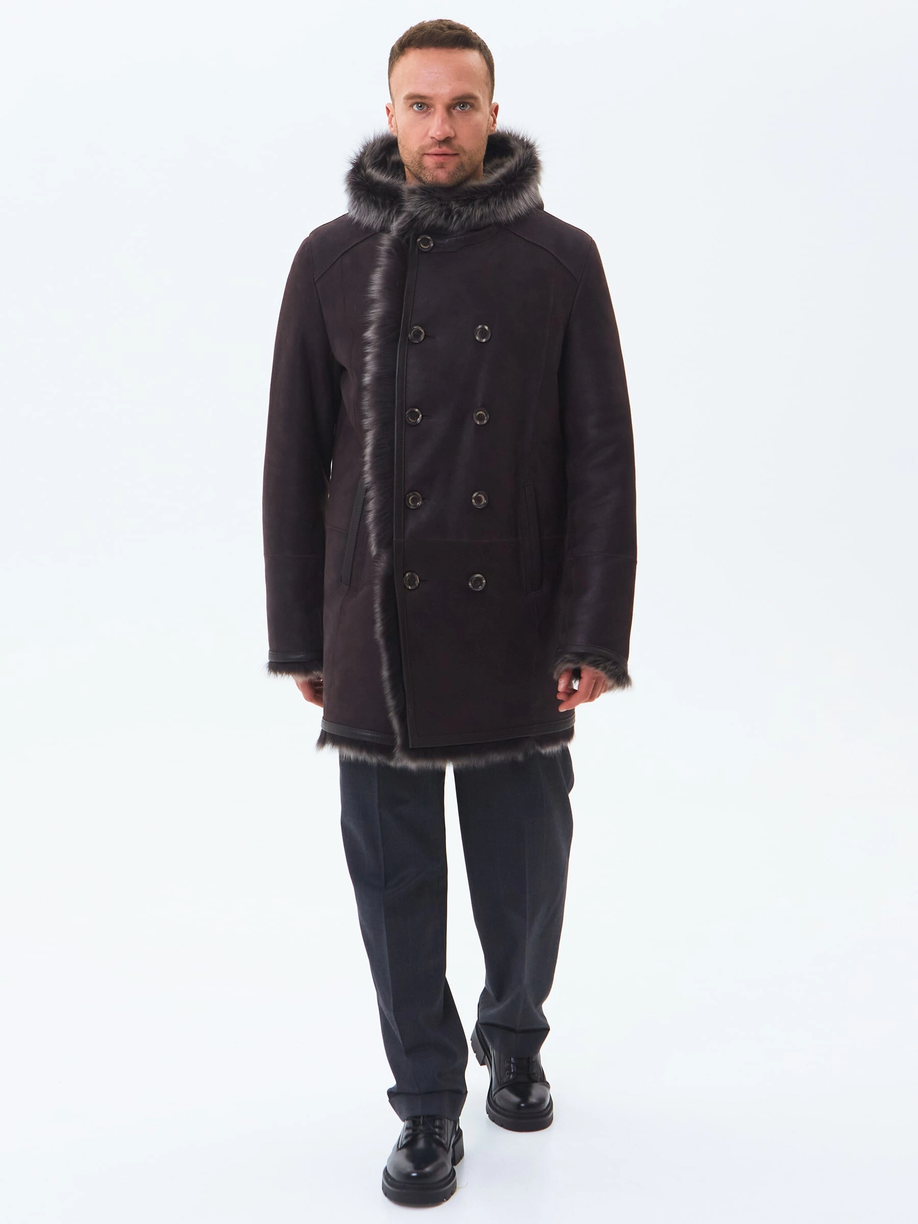 Двубортная мужская дубленка из тосканы с капюшоном премиум класса 415, коричневая, размер 52, артикул 71600