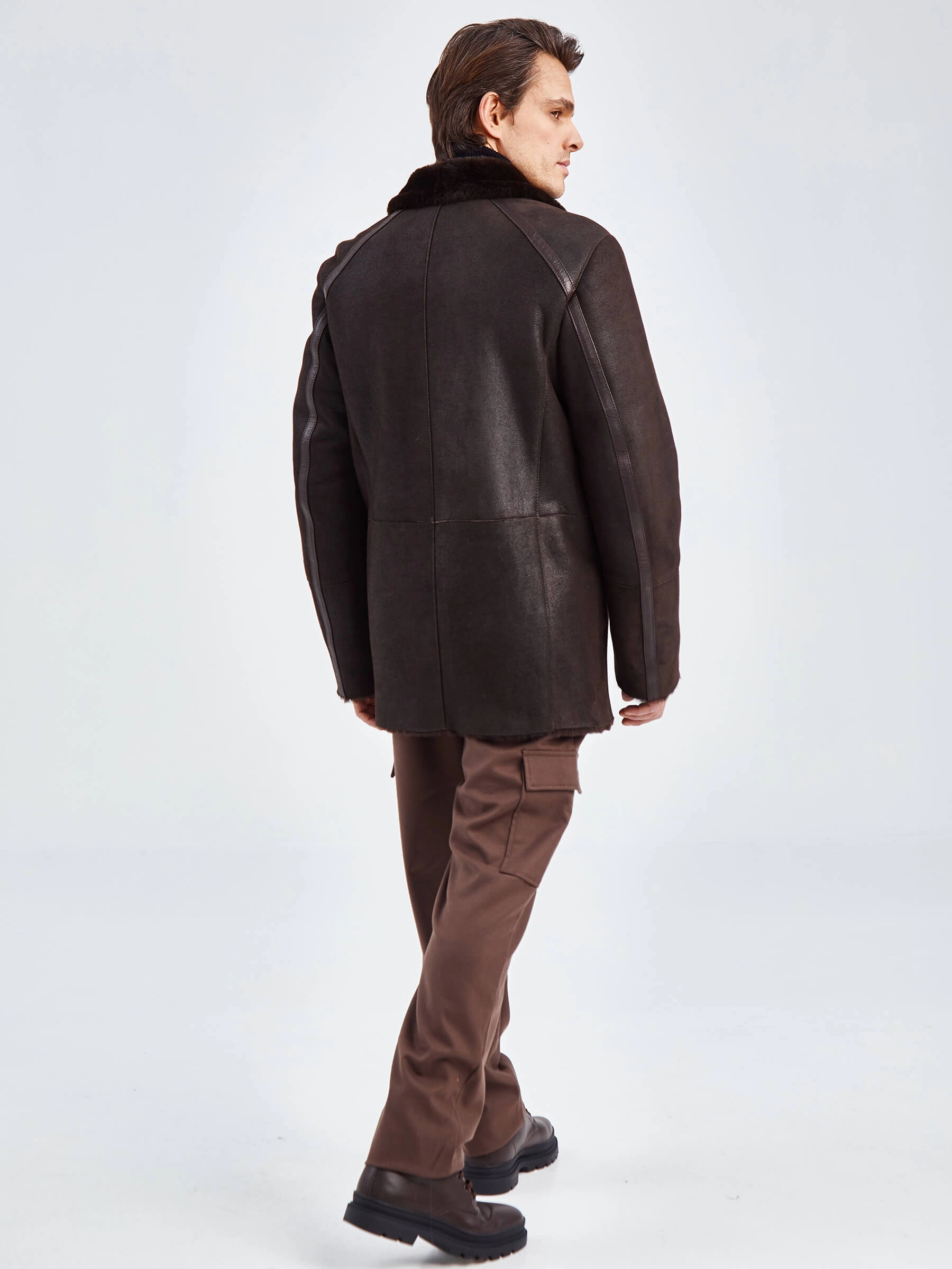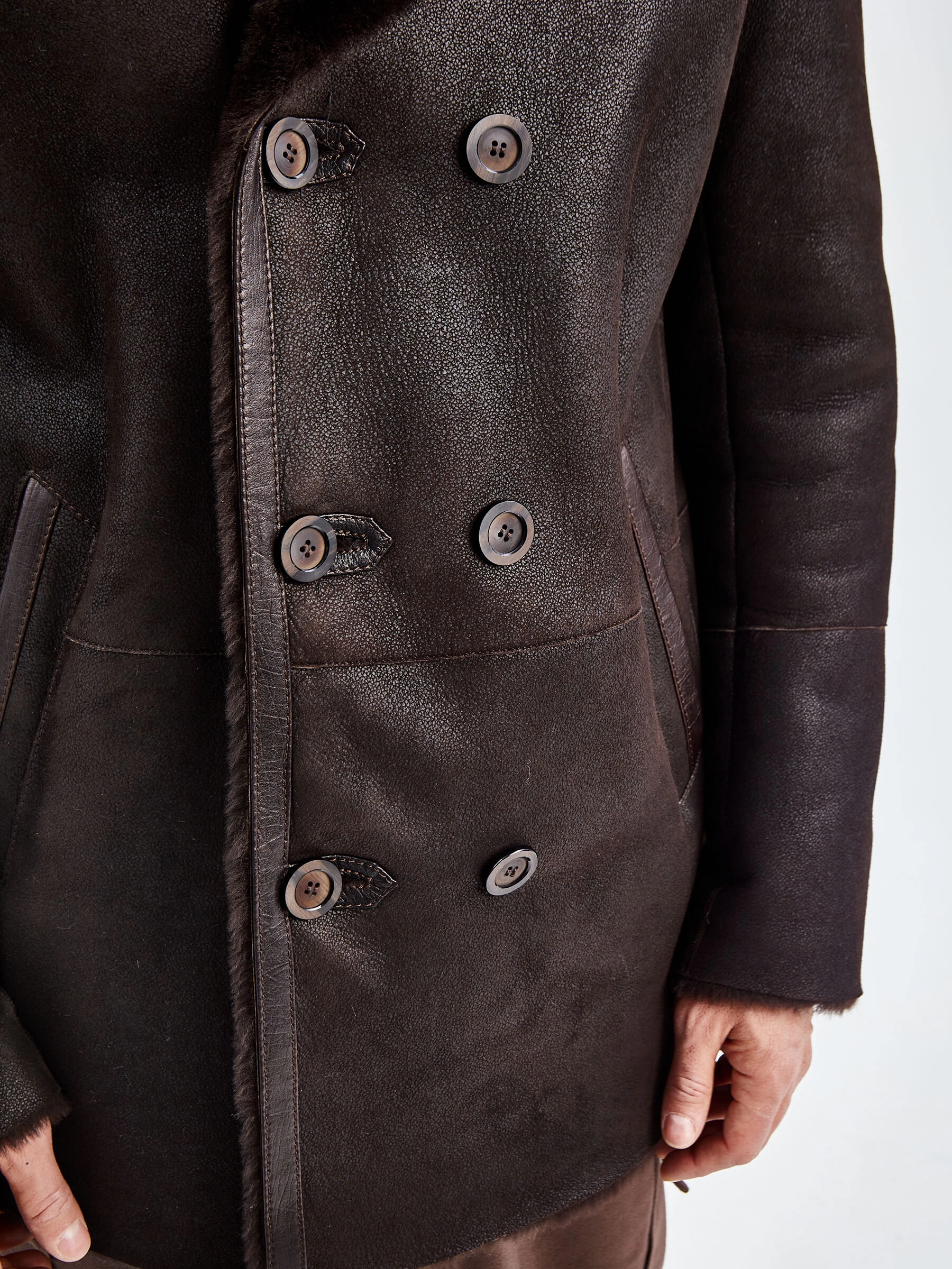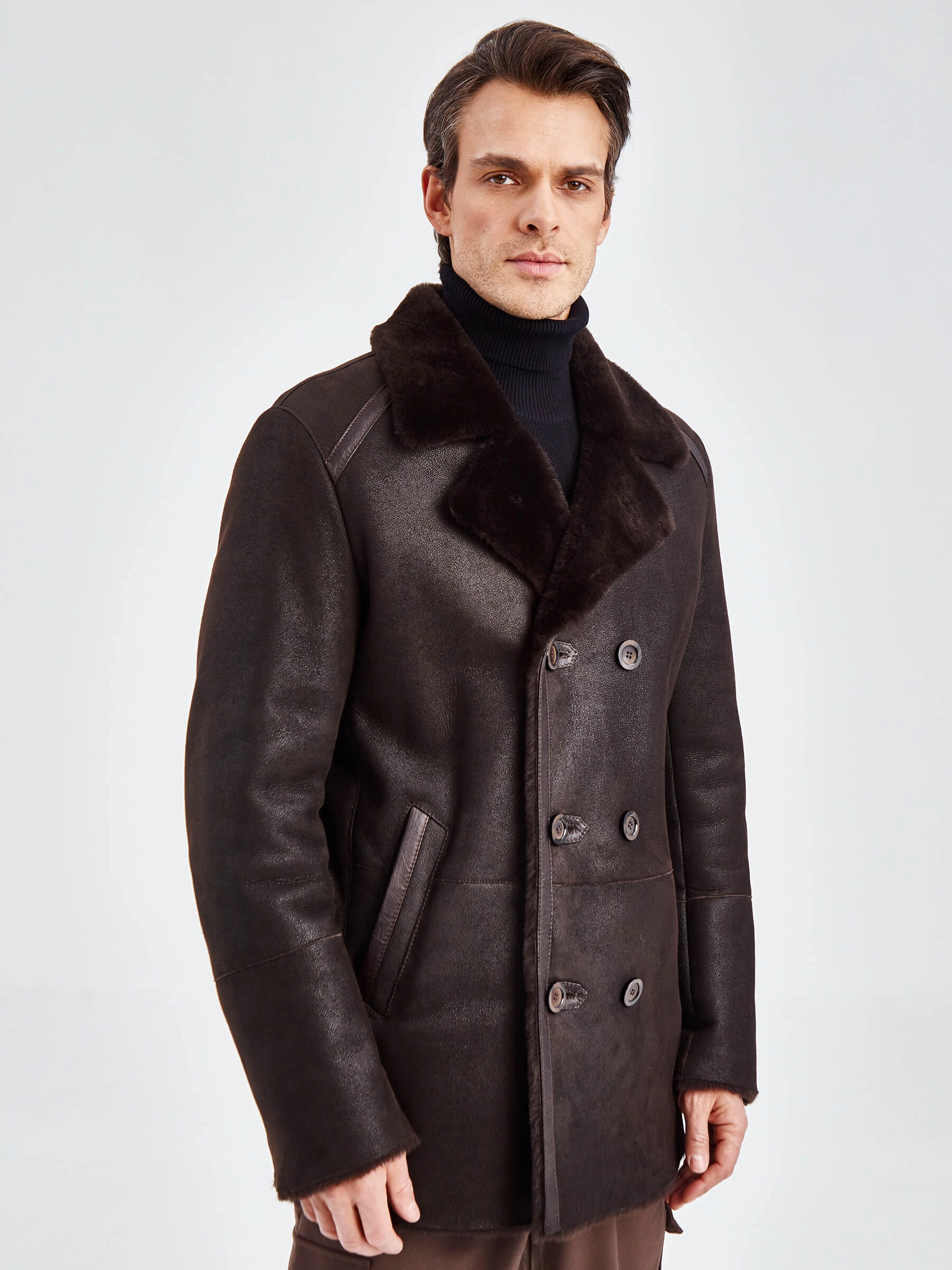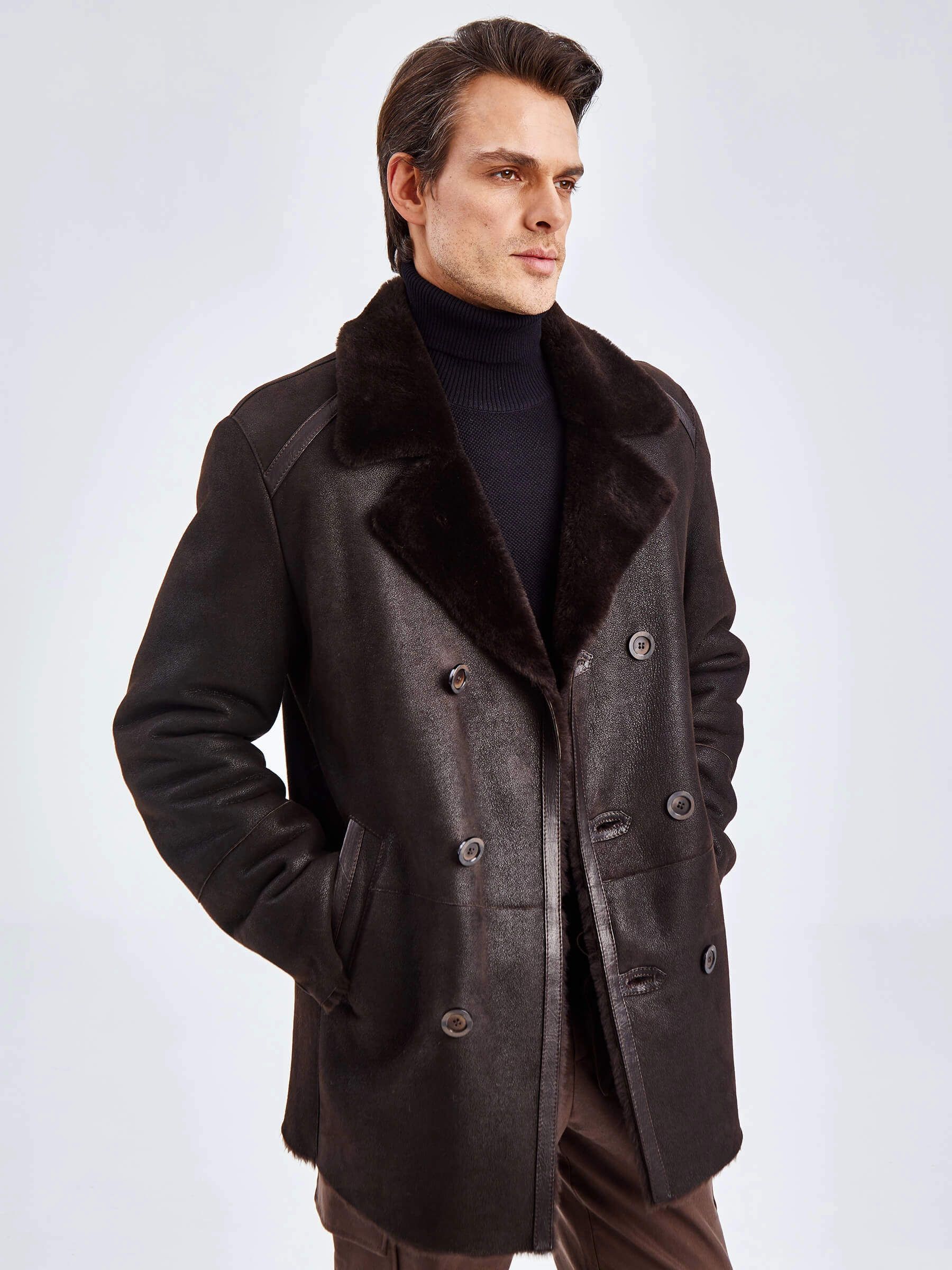 Стильная двубортная мужская дублёнка. Мериносная овчина высшего качества. Максимально густой мех прекрасно защитит от любого мороза. Новейшее устойчивое защитное покрытие. Английский воротник. Длина рукавов регулируется отворотом манжет. Чёткая, выверенная посадка по фигуре. Безупречная работа наших портных.