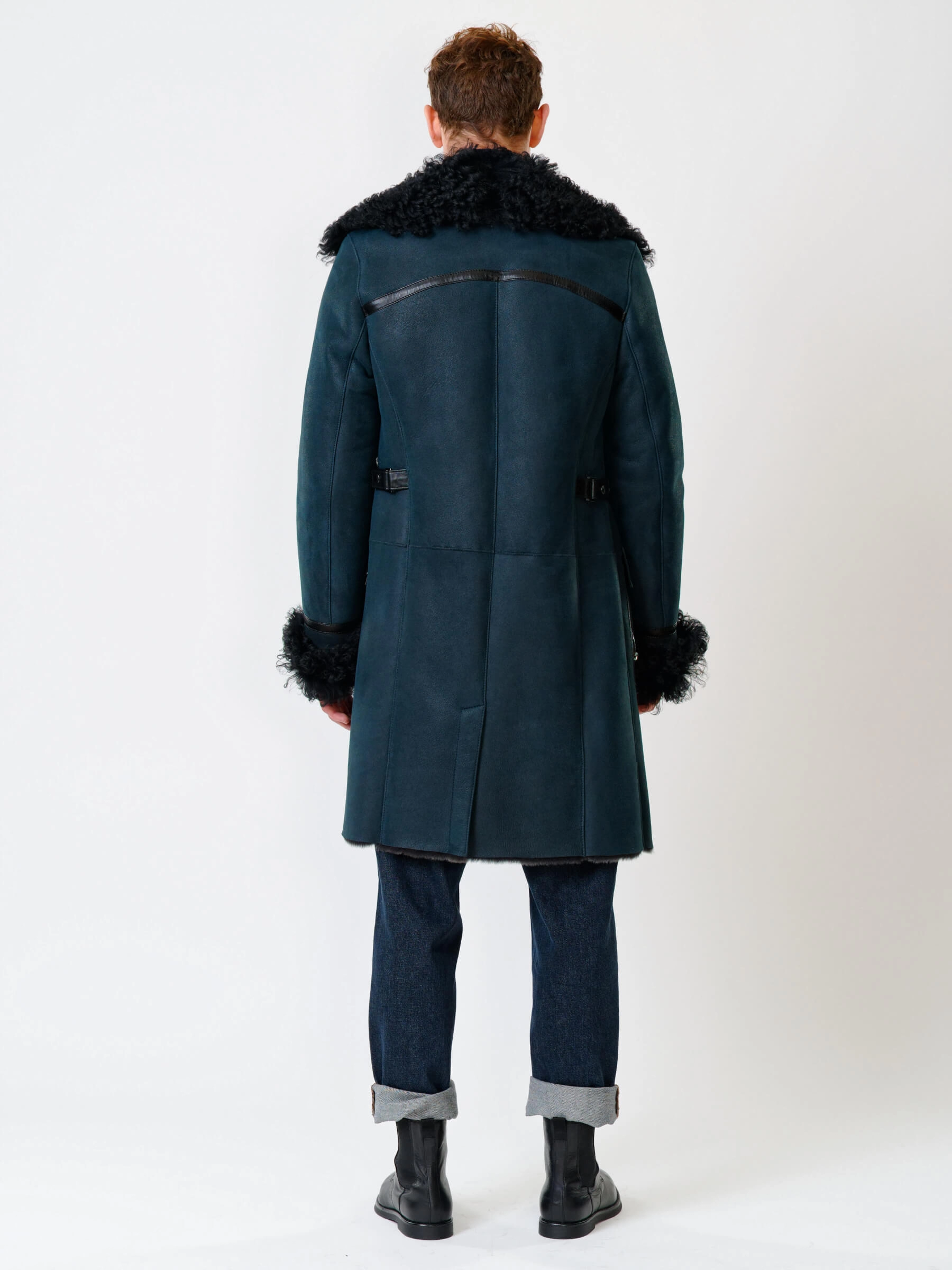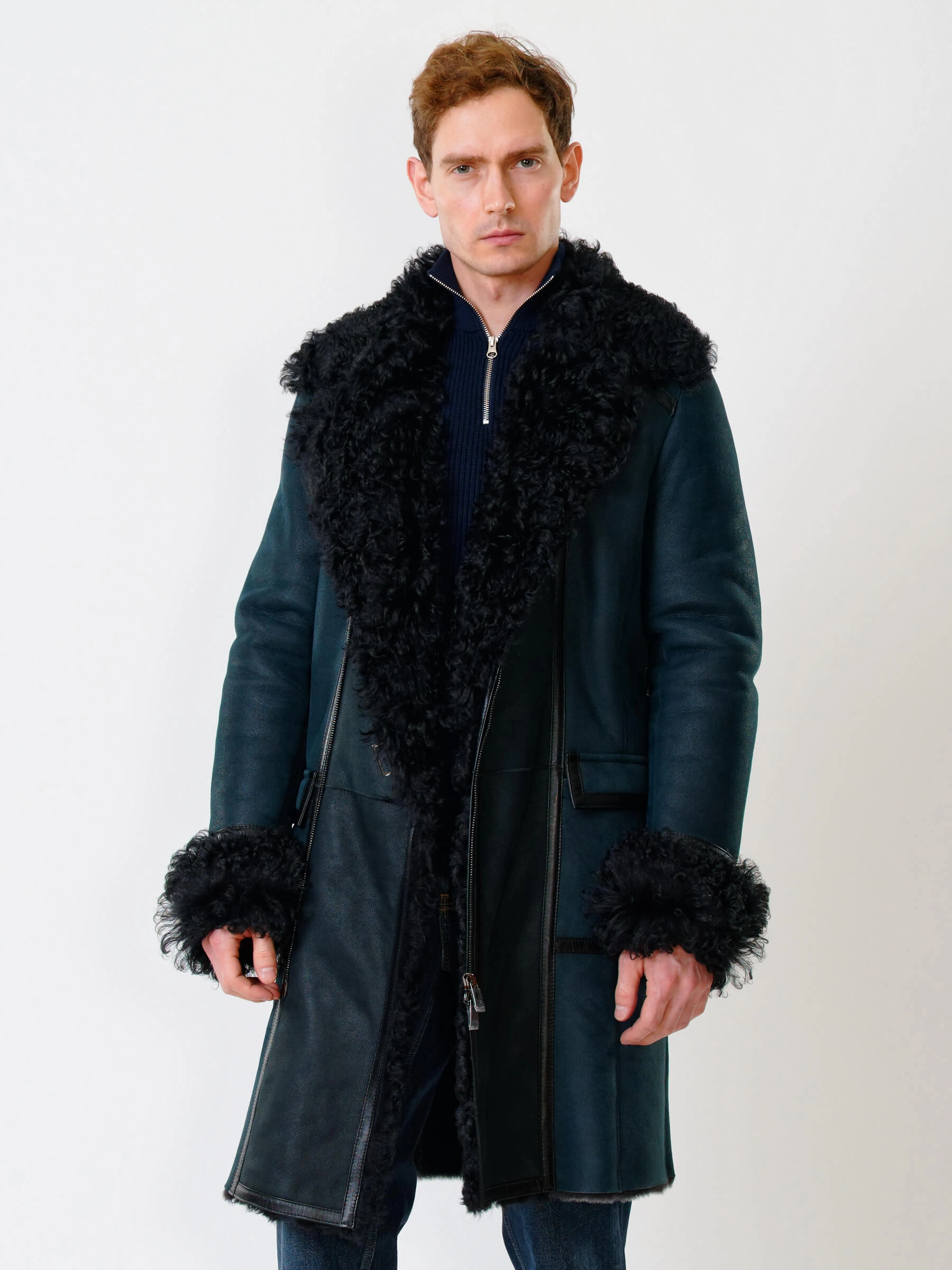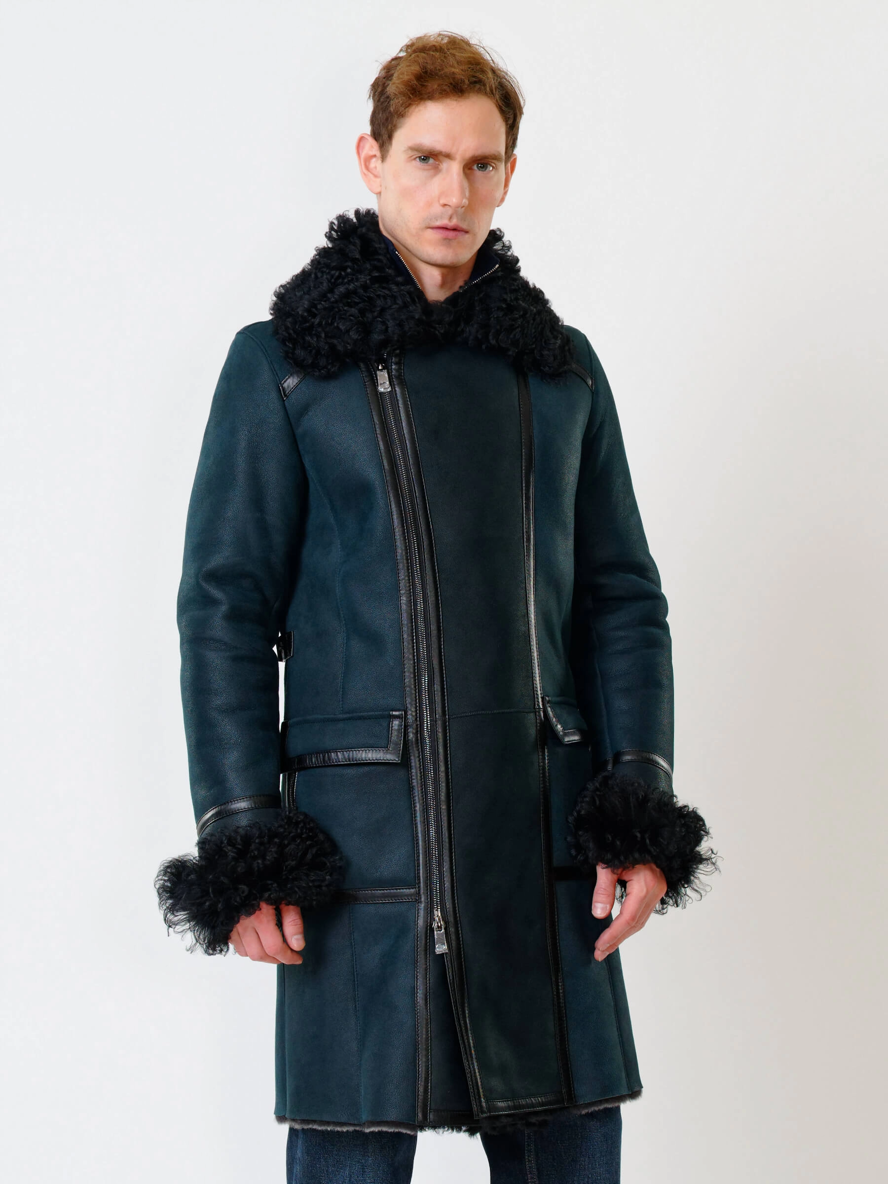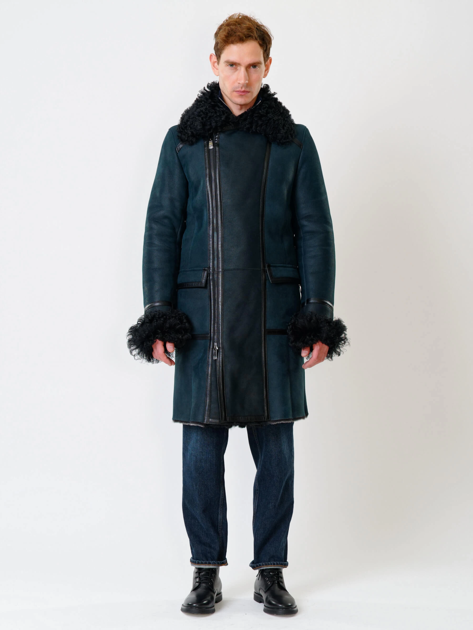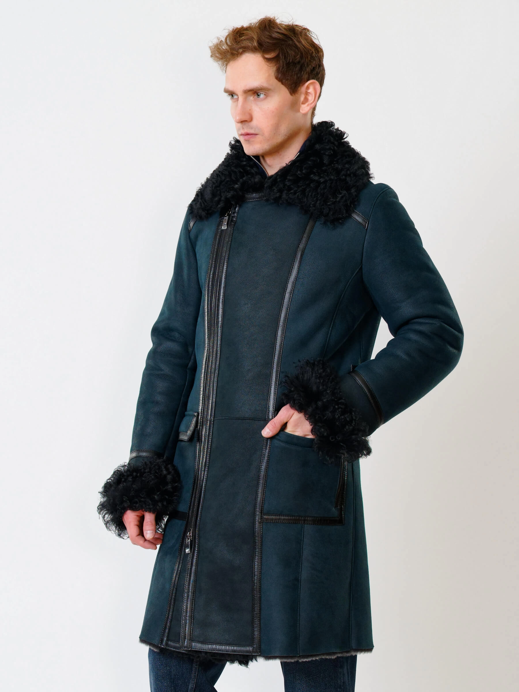 Товар длинная мужская дубленка с мехом тиградо премиум класса 424, синяя, размер 52, артикул 70310 выполнен из овчина "мерино" с застежкой молния. Рассчитан на сезон: осень-зима. Длина изделия 107 см, силуэт полуприлегающий.