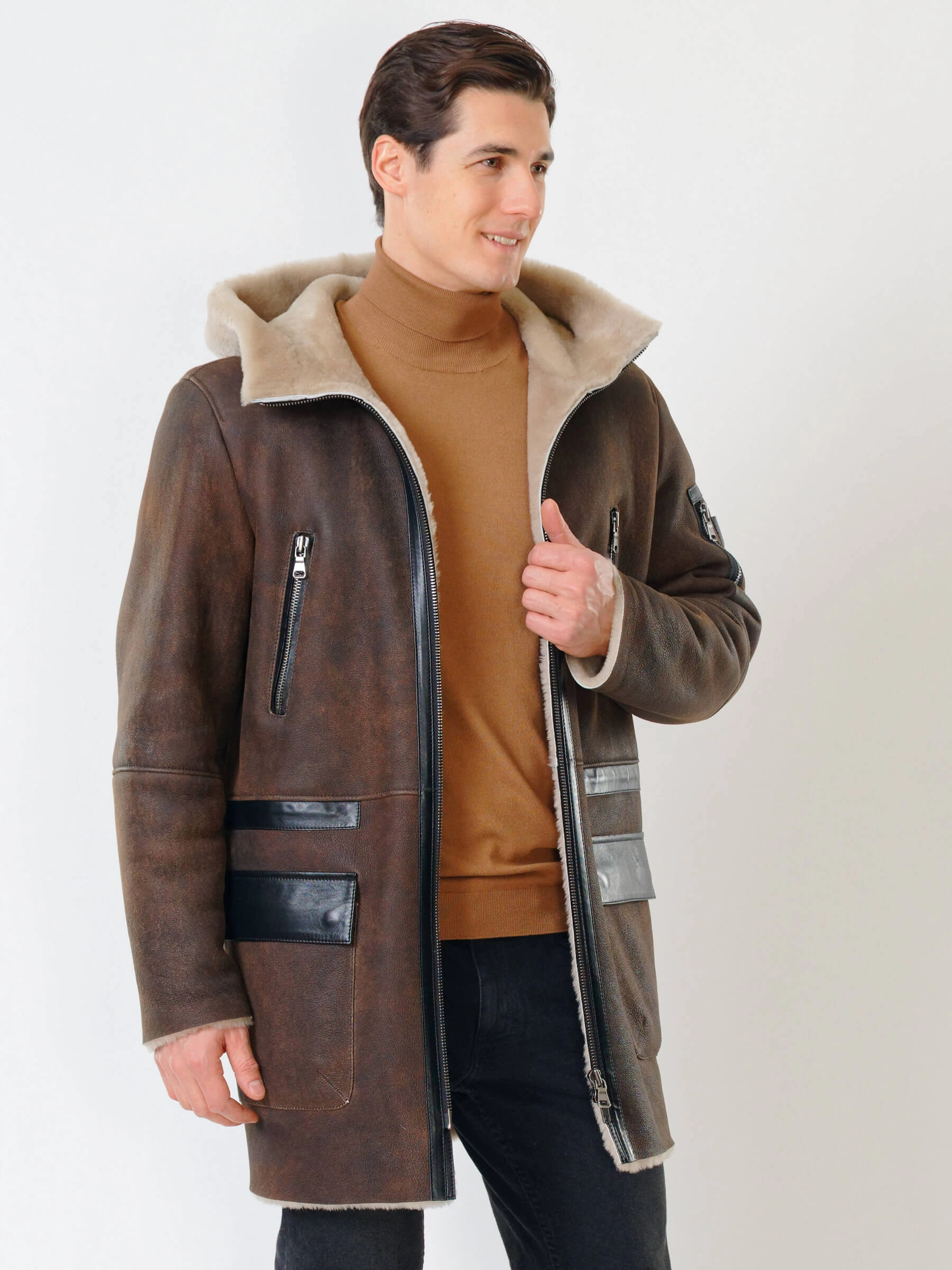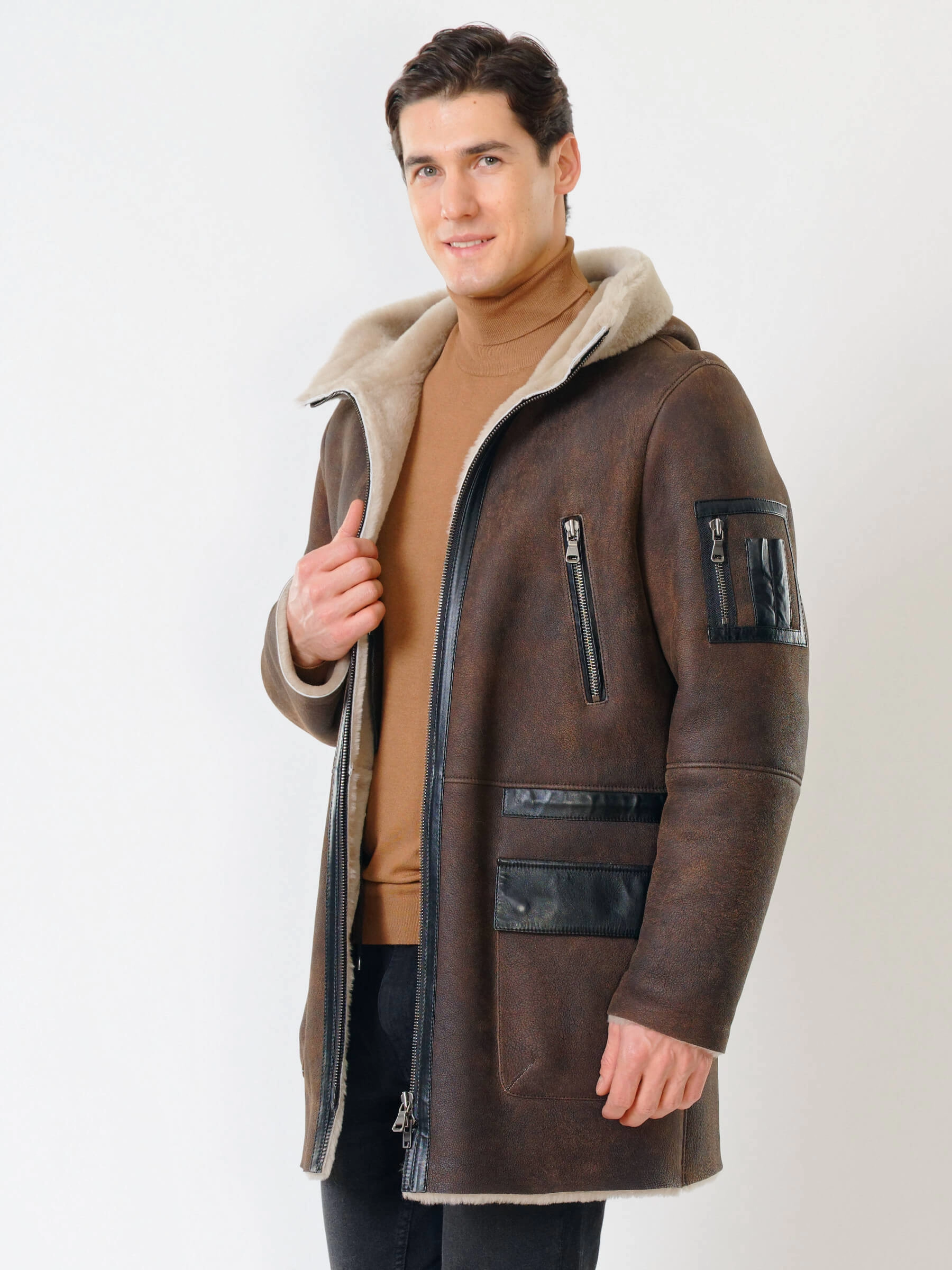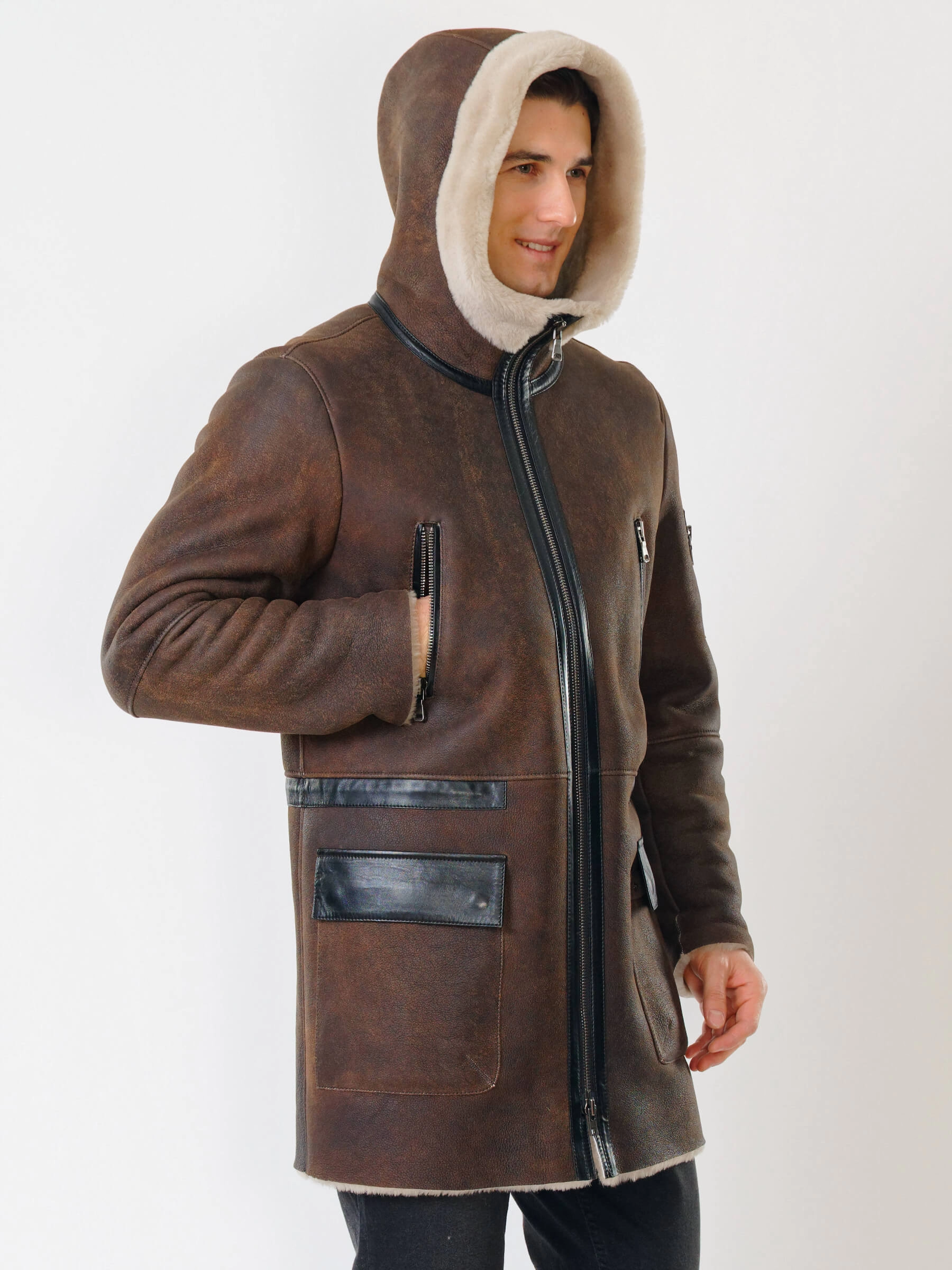 Длинная мужская дубленка с капюшоном премиум класса 429, коричневая, размер 48, артикул 70560