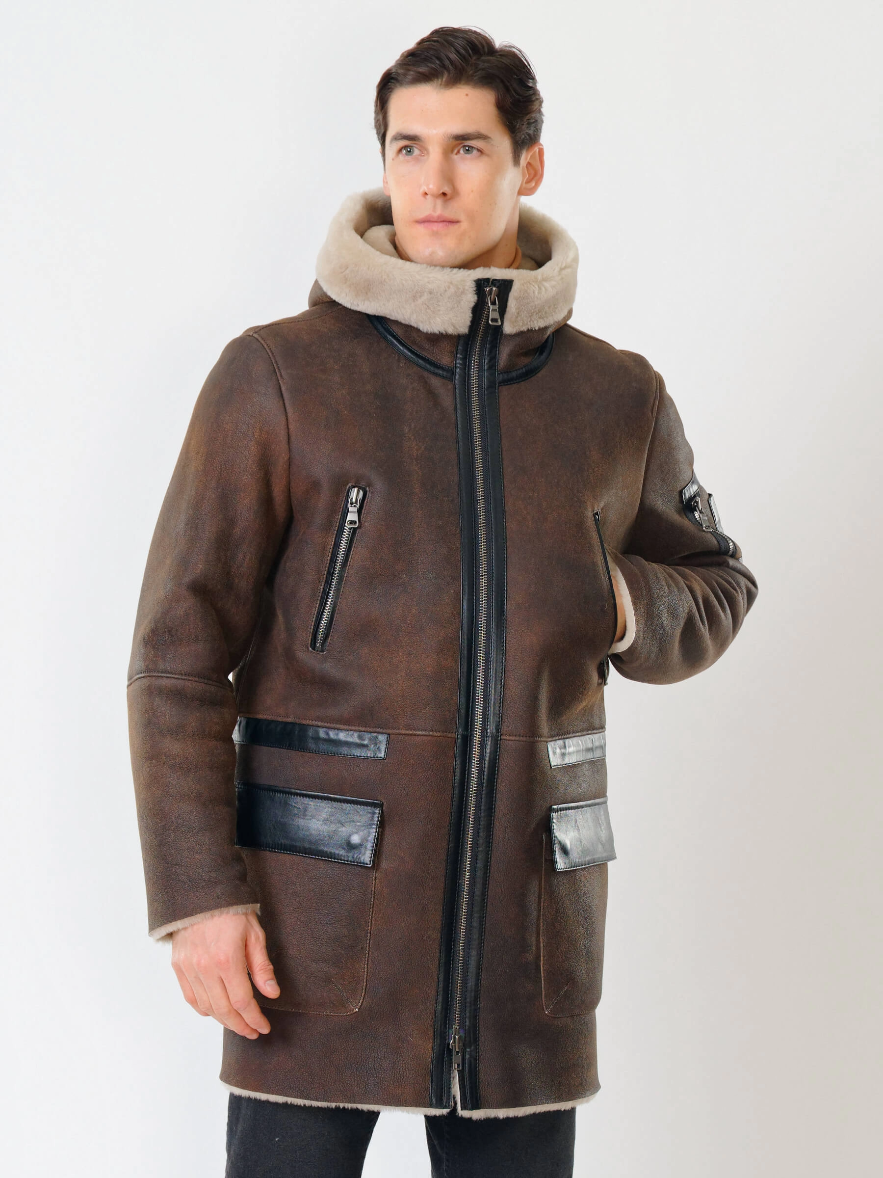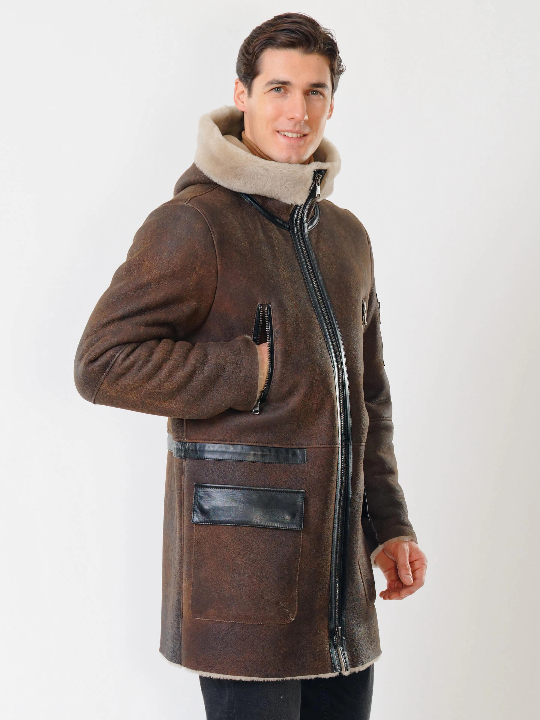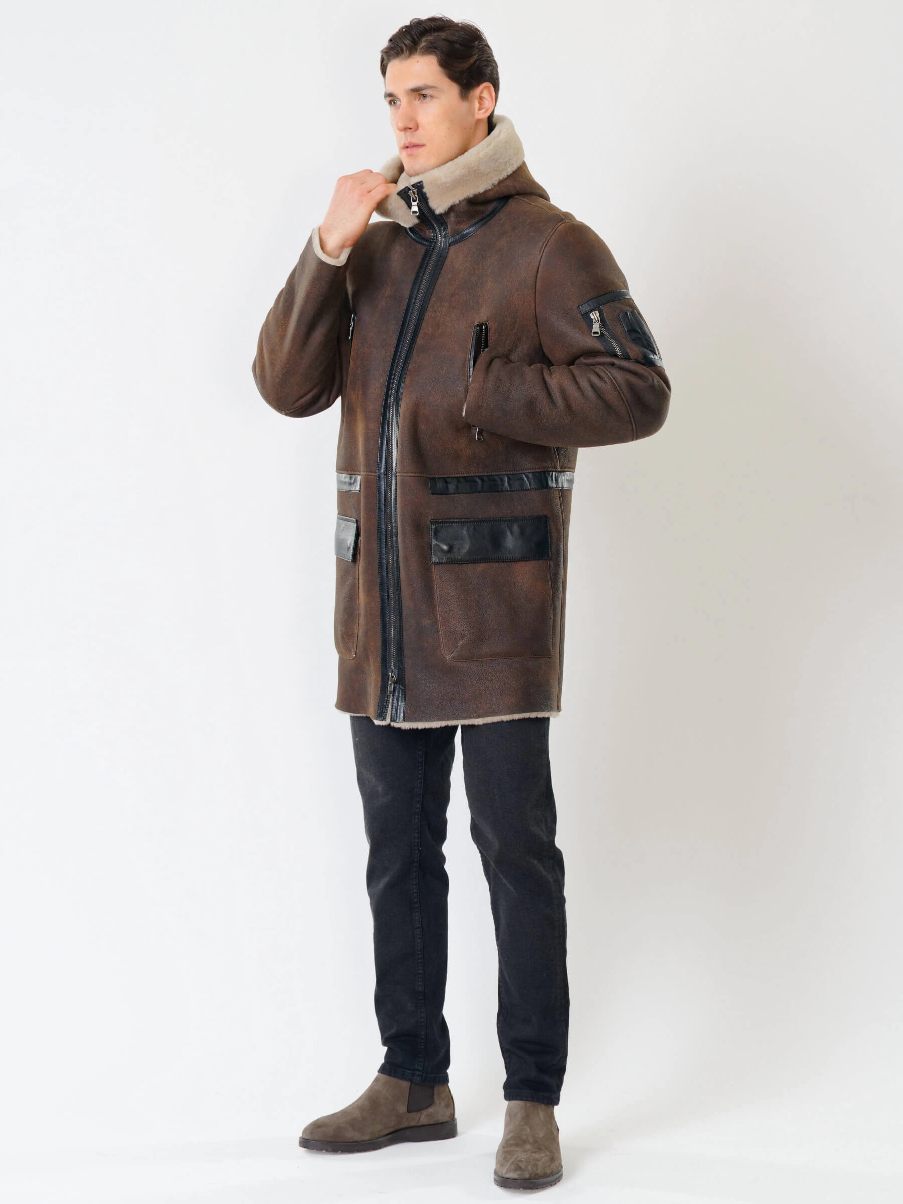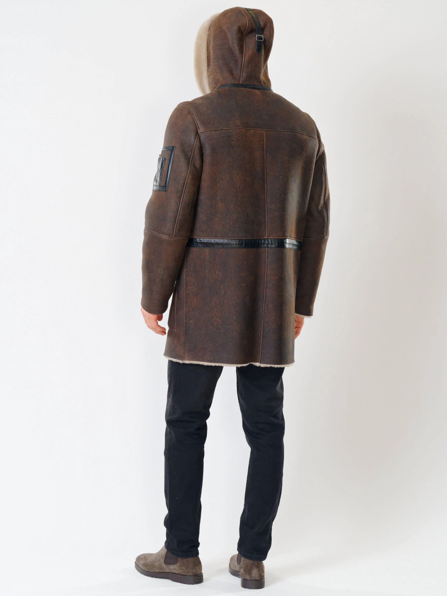 Длинная мужская дубленка с капюшоном премиум класса 429, коричневая, размер 48, артикул 70560