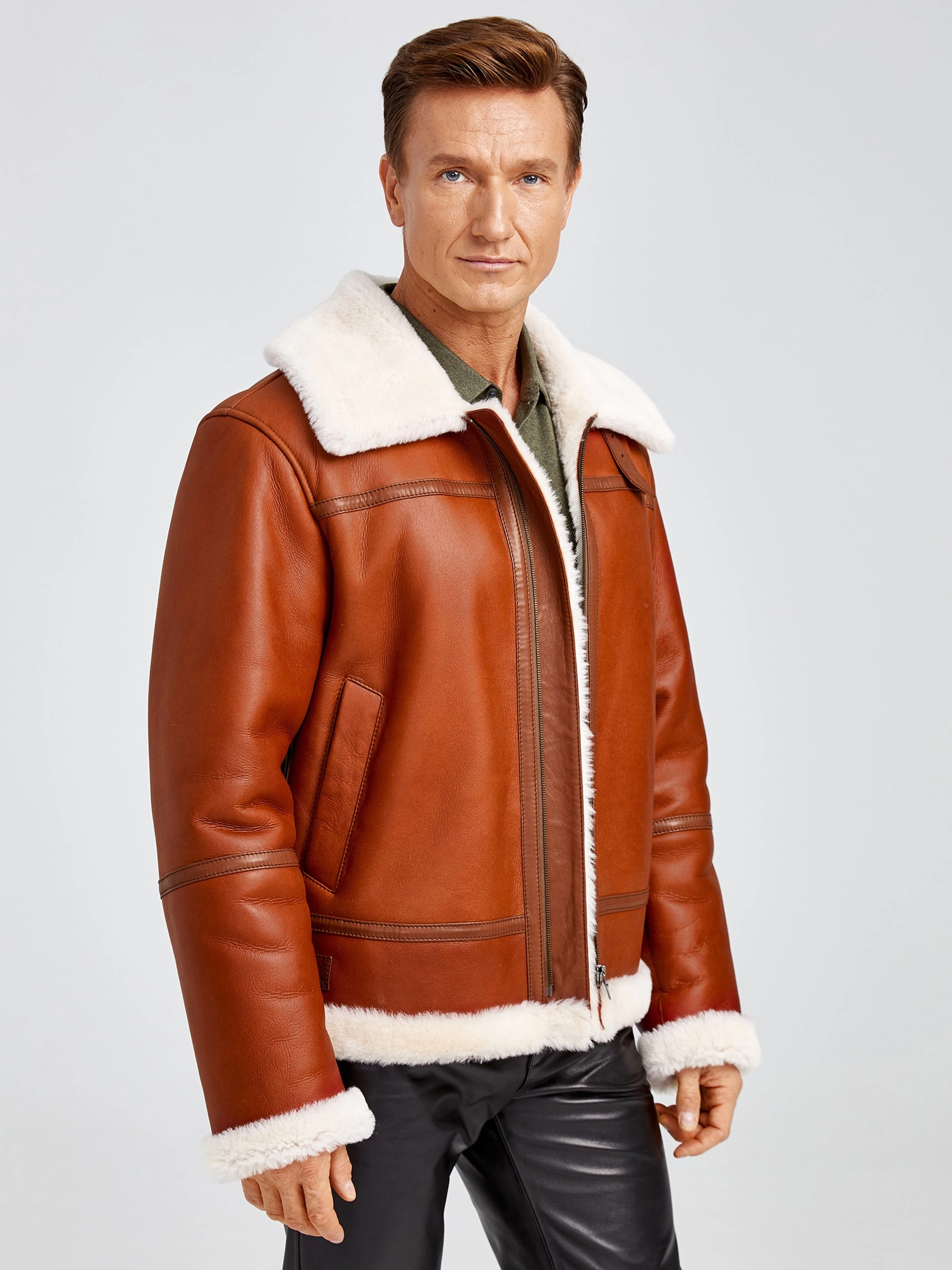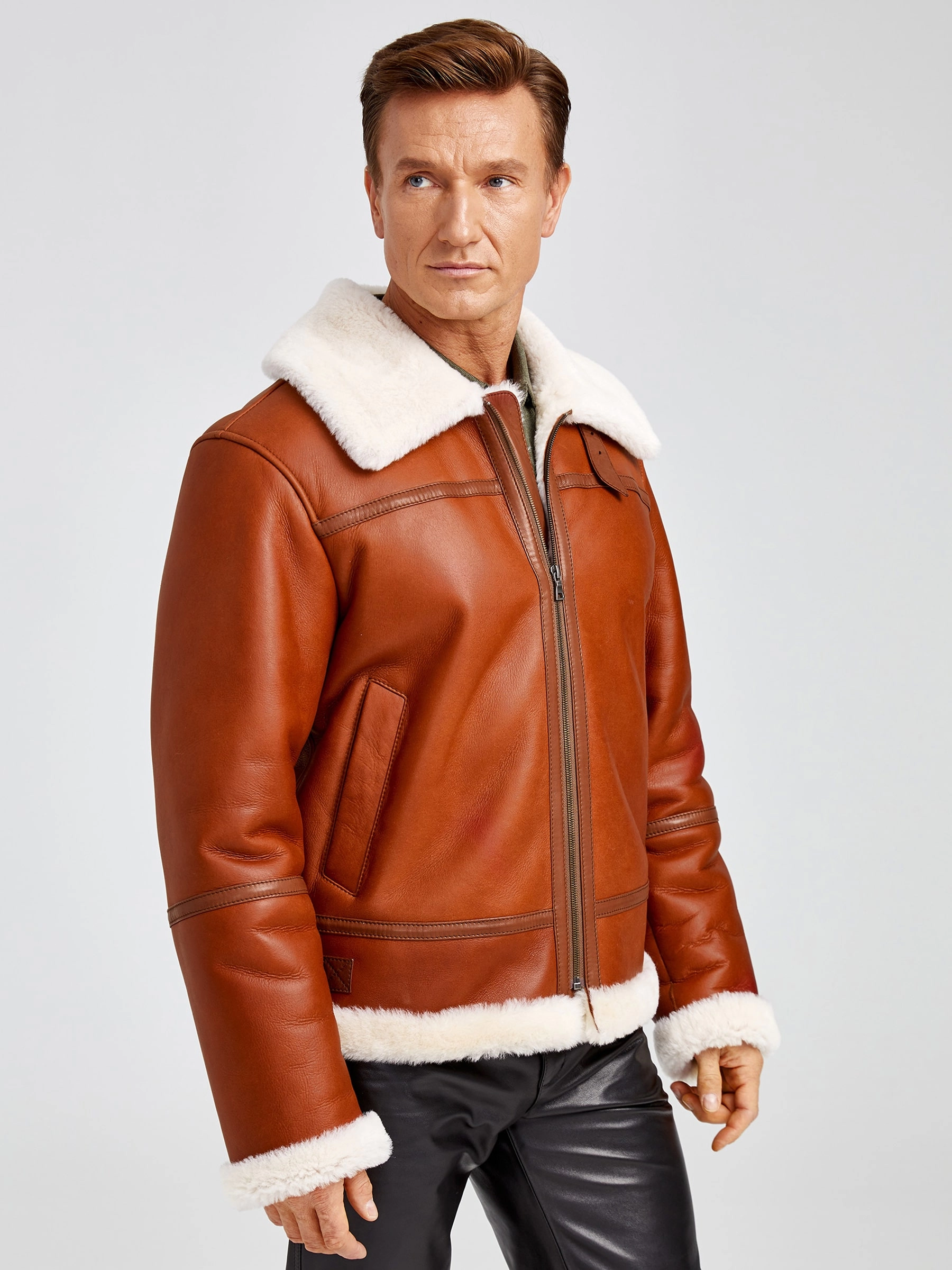 Дублёнка-авиатор. Специальная технология стирки овчины придает поверхности дублёнки повышенную износостойкость. Максимально густой мех. Минимальный вес. Предусмотрены внутренние карманы для документов. Безупречная работа наших портных. Комфортная посадка по фигуре. Великолепная свобода движений.