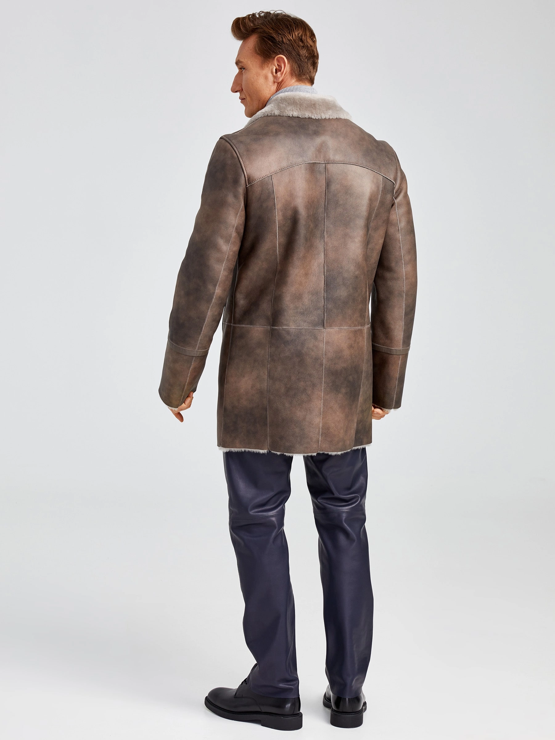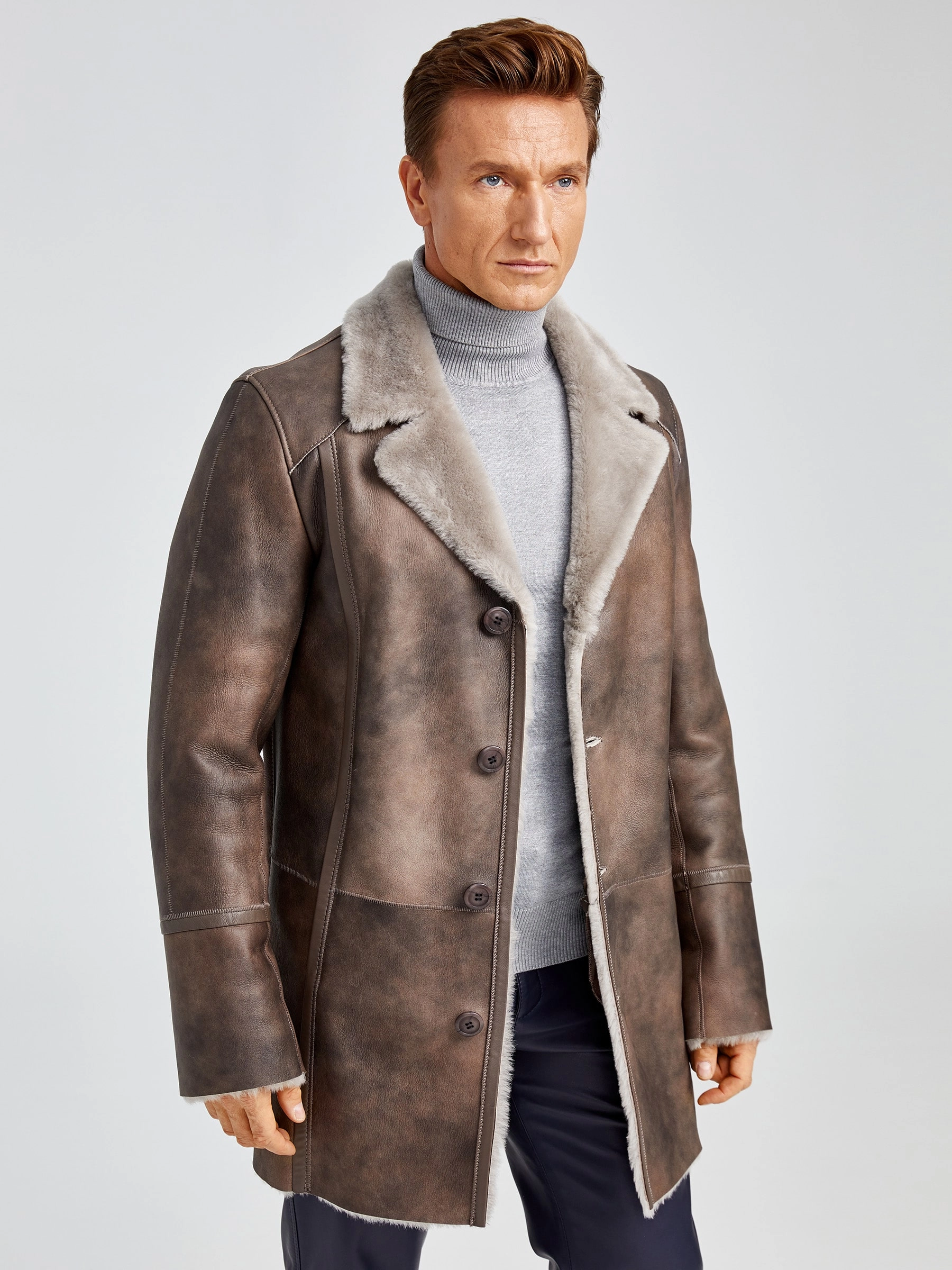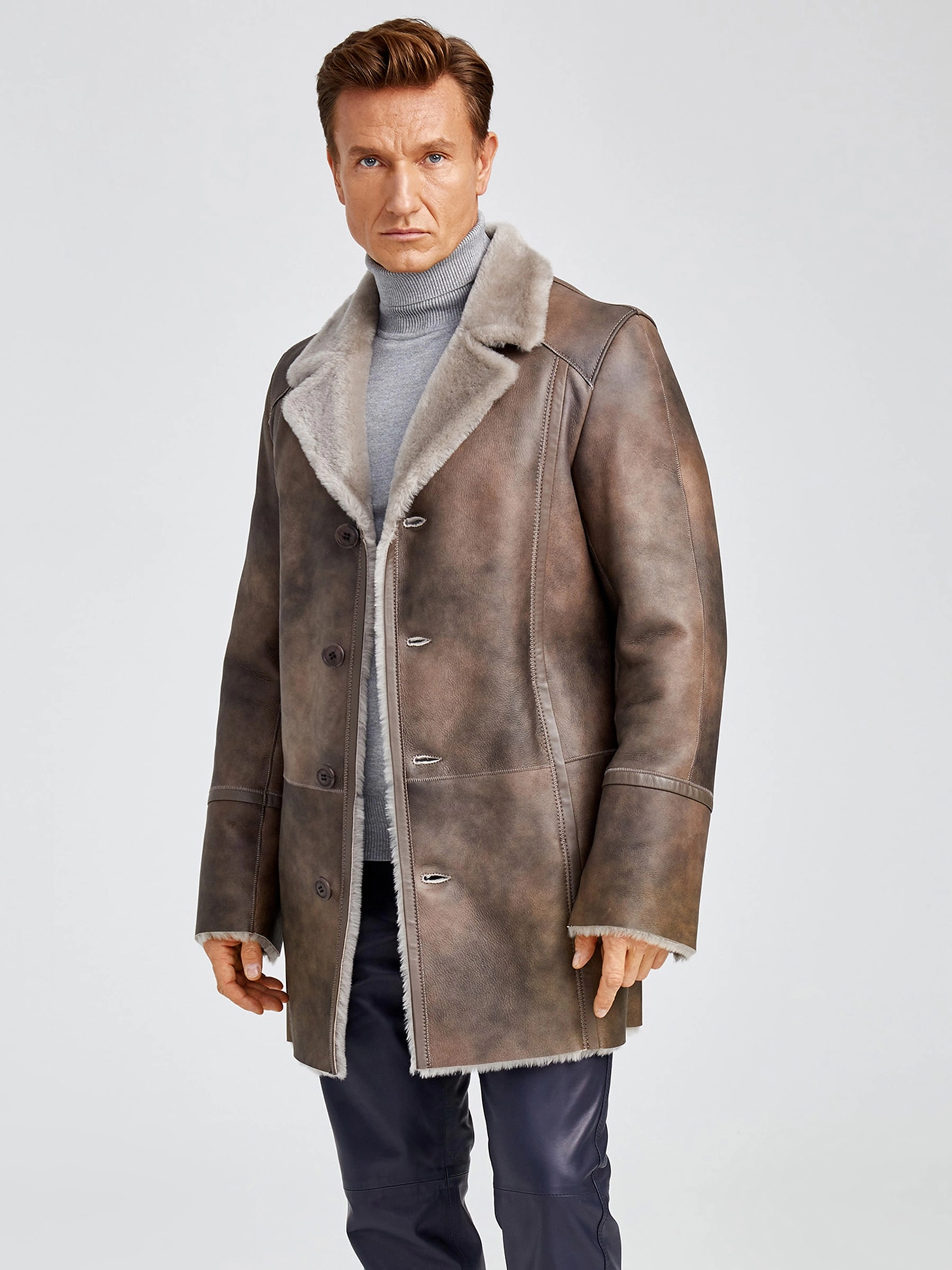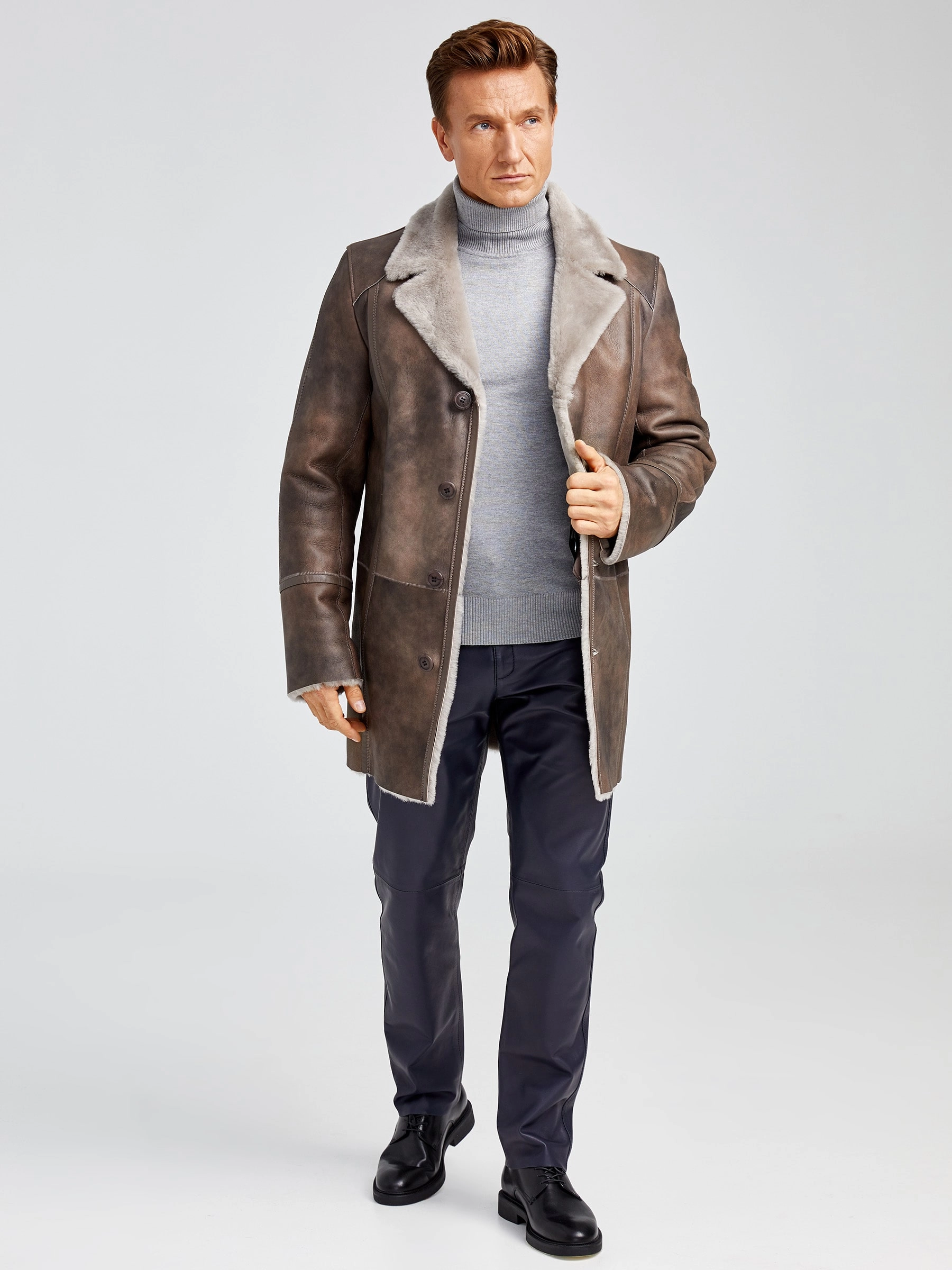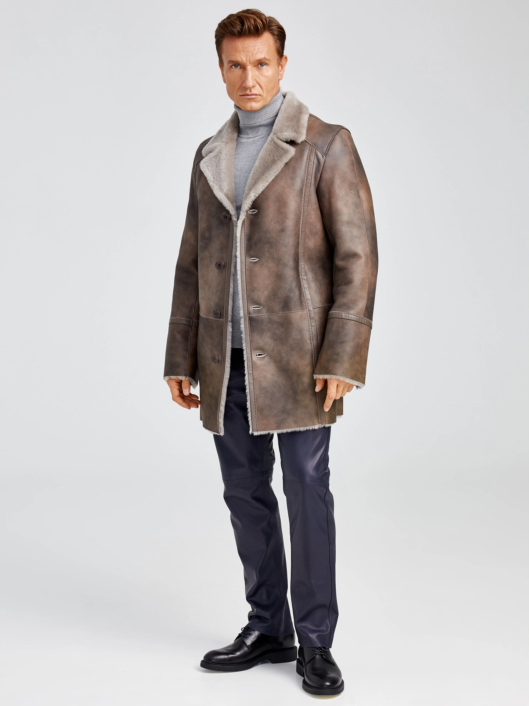 Товар зимний комплект мужской: дубленка леон + брюки 01, серо-коричневый/синий, р. 48, артикул 140361 выполнен из овчина "мерино". Рассчитан на сезон: осень-зима.
