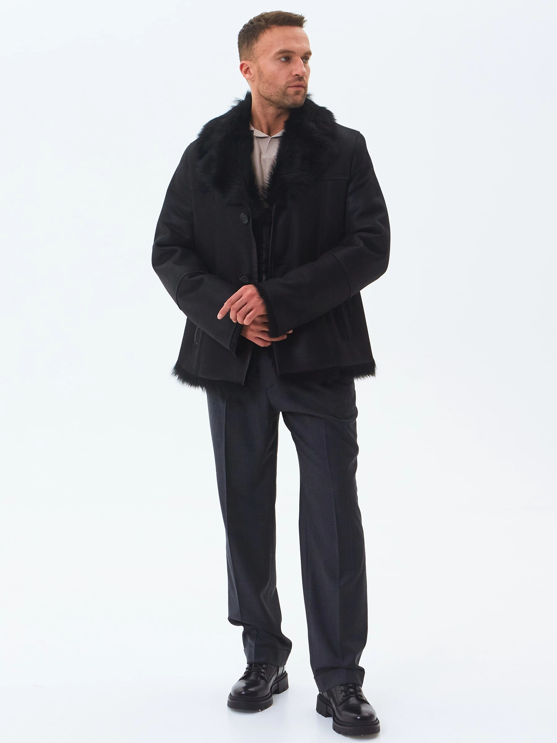 Стильная мужская дублёнка. Тосканская овчина высшего качества. Максимально густой, высокий мех прекрасно защитит от любого мороза. Новейшее устойчивое защитное покрытие. Английский воротник. Длина рукавов регулируется отворотом манжет. Чёткая, выверенная посадка по фигуре. Безупречная работа наших портных.