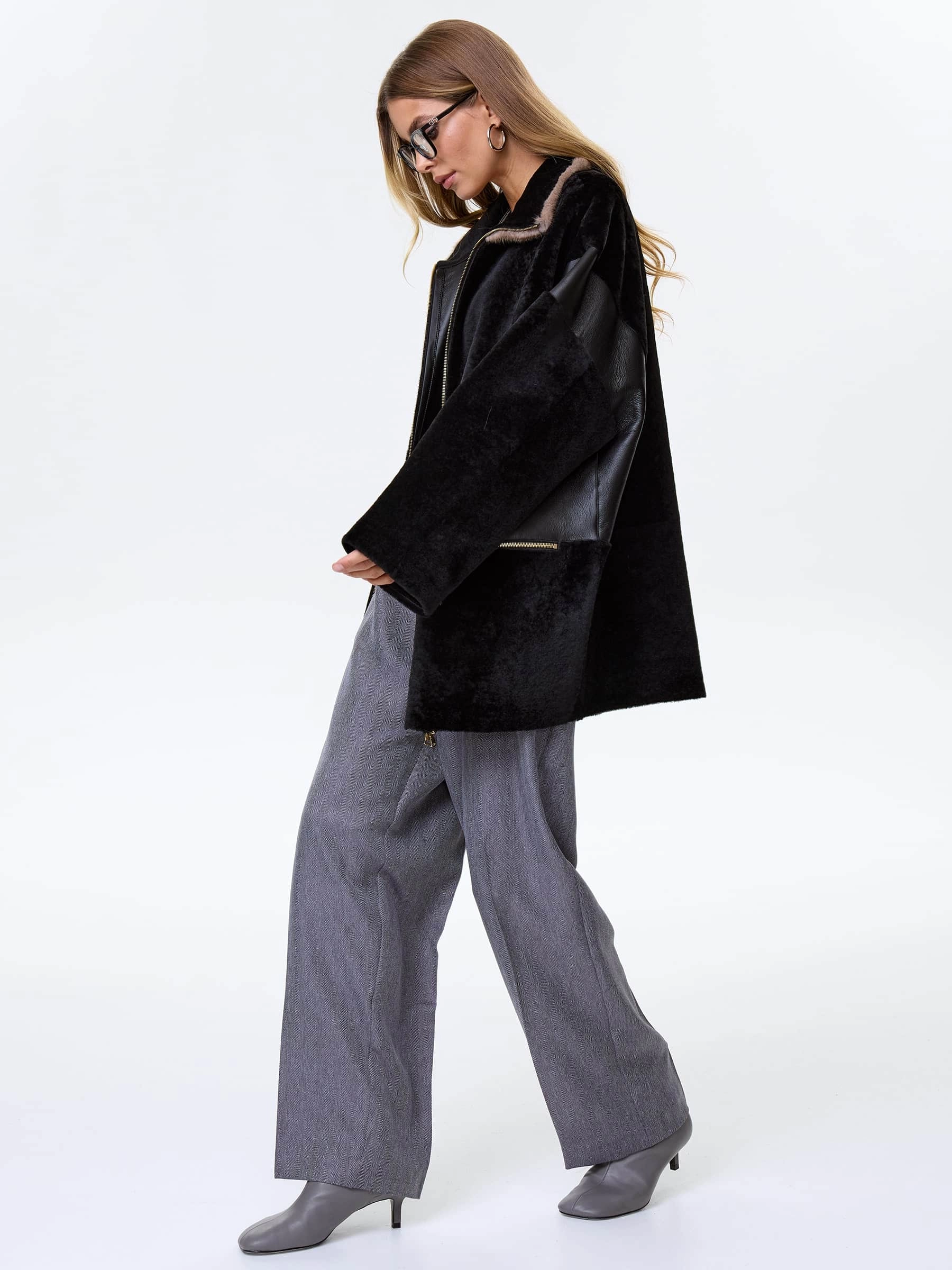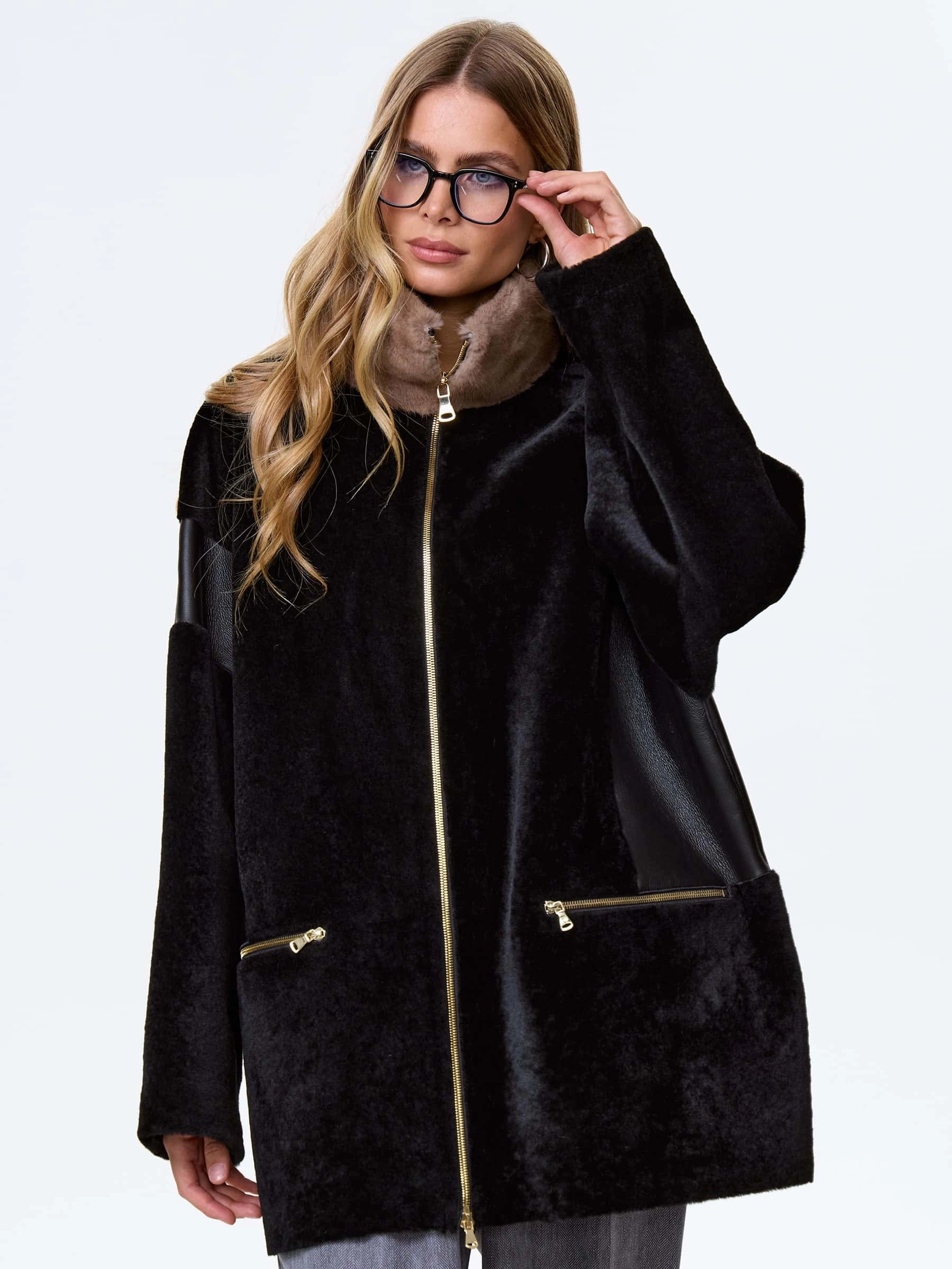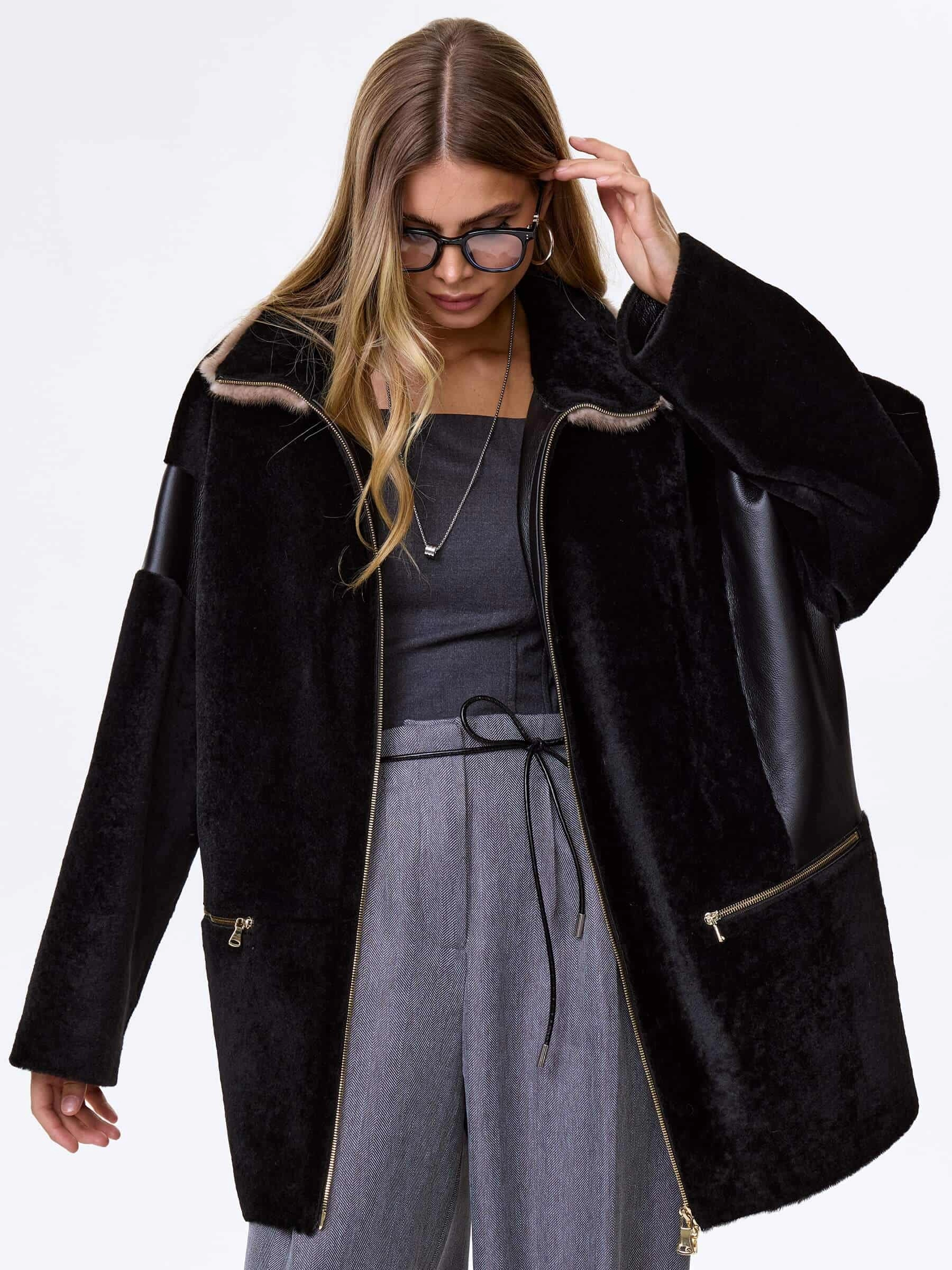 Для пошива короткой дубленки использовали нежную овчину в классическом черном цвете сочетании с гладкой стороной. Комфортный свободный крой не ограничивает движения. Боковые карманы как и само изделие застегиваются молниями. Объемный воротник - стойку дополнили густой норкой.